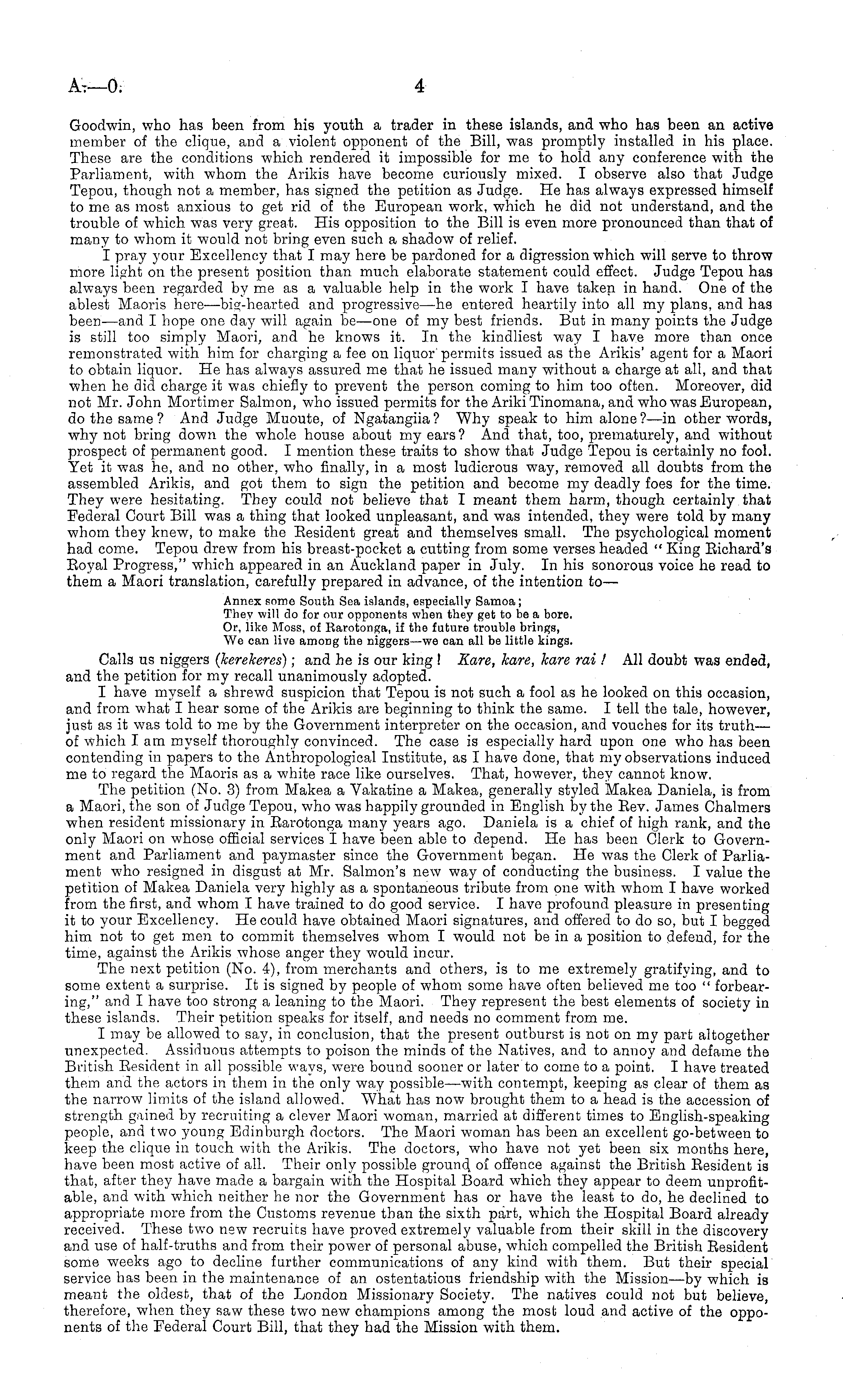 Goodwin, who has been from his youth a trader in these islands, and who has been an active member of the clique, and a violent opponent of the Bill, was promptly installed in his place. These are the conditions which rendered it impossible for me to hold any conference with the Parliament, with whom the Arikis have become curiously mixed. I observe also that Judge Tepou, though not a member, has signed the petition as Judge. He has always expressed himself to me as most anxious to get rid of the European work, which he did not understand, and the trouble of which was very great. His opposition to the Bill is even more pronounced than that of many to whom it would not bring even such a shadow of relief. I pray your Excellency that I may here be pardoned for a digression which will serve to throw more light on the present position than much elaborate statement could effect. Judge Tepou has always been regarded by me as a valuable help in the work I have taken in hand. One of the ablest Maoris here—big-hearted and progressive—he entered heartily into all my plans, and has been—and I hope one day will again be—one of my best friends. But in many points the Judge is still too simply Maori, and he knows it. In the kindliest way I have more than once remonstrated with him for charging a fee on liquor'permits issued as the Arikis' agent for a Maori to obtain liquor. He has always assured me that he issued many without a charge at all, and that when he did charge it was chiefly to prevent the person coming to him too often. Moreover, did not Mr. John Mortimer Salmon, who issued permits for the Ariki Tinomana, and who was .European, do the same? And Judge Muoute, of Ngatangiia? Why speak to him alone?—in other words, why not bring down the whole house about my ears ? And that, too, prematurely, and without prospect of permanent good. I mention these traits to show that Judge Tepou is certainly no fool. Yet it was he, and no other, who finally, in a most ludicrous way, removed all doubts from the assembled Arikis, and got them to sign the petition and become my deadly foes for the time. They were hesitating. They could not believe that I meant them harm, though certainly that Federal Court Bill was a thing that looked unpleasant, and was intended, they were told by many whom they knew, to make the Eesident great and themselves small. The psychological moment had come. Tepou drew from his breast-pocket a cutting from some verses headed " King Eichard's Eoyal Progress," which appeared in an Auckland paper in July. In his sonorous voice he read to them a Maori translation, carefully prepared in advance, of the intention to— Annex pome South Sea islands, especially Samoa; They will do for our opponents when they get to be a bore. Or, like Moss, of Rarotonga, if the future trouble brings, We can live among the niggers—we can all be little kings. Calls us niggers (kerekeres); and he is our king ! Rare, kare, kare rai I All doubt was ended, and the petition for my recall unanimously adopted. I have myself a shrewd suspicion that Tepou is not such a fool as he looked on this occasion, and from what I hear some of the Arikis are beginning to think the same. I tell the tale, however, just as it was told to me by the Government interpreter on the occasion, and vouches for its truth— of which lam myself thoroughly convinced. The case is especially hard upon one who has been contending in papers to the Anthropological Institute, as I have done, that my observations induced me to regard the Maoris as a white race like ourselves. That, however, they cannot know. The petition (No. 3) from Makea a Vakatine a Makea, generally styled Makea Daniela, is from a Maori, the son of Judge Tepou, who was happily grounded in English by the Eev. James Chalmers when resident missionary in Earotonga many years ago. Daniela is a chief of high rank, and the only Maori on whose official services I have been able to depend. He has been Clerk to Government and Parliament and paymaster since the Government began. He was the Clerk of Parliament who resigned in disgust at Mr. Salmon's new way of conducting the business. I value the petition of Makea Daniela very highly as a spontaneous tribute from one with whom I have worked from the first, and whom I have trained to do good service. I have profound pleasure in presenting it to your Excellency. He could have obtained Maori signatures, and offered to do so, but I begged him not to get men to commit themselves whom I would not be in a position to defend, for the time, against the Arikis whose anger they would incur. The next petition (No. 4), from merchants and others, is to me extremely gratifying, and to some extent a surprise. It is signed by people of whom some have often believed me too " forbearing," and I have too strong a leaning to the Maori. They represent the best elements of society in these islands. Their petition speaks for itself, and needs no comment from me. I may be allowed to say, in conclusion, that the present outburst is not on my part altogether unexpected. Assiduous attempts to poison the minds of the Natives, and to annoy and defame the British Eesident in all possible ways, were bound sooner or later to come to a point. I have treated them and the actors in them in the only way possible—with contempt, keeping as clear of them as the narrow limits of the island allowed. "What has now brought them to a head is the accession of strength gained by recruiting a clever Maori woman, married at different times to English-speaking people, and two young Edinburgh doctors. The Maori woman has been an excellent go-between to keep the clique in touch with the Arikis. The doctors, who have not yet been six months here, have been most active of all. Their only possible ground, of offence against the British Eesident is that, after they have made a bargain with the Hospital Board which they appear to deem unprofitable, and with which neither he nor the Governm
