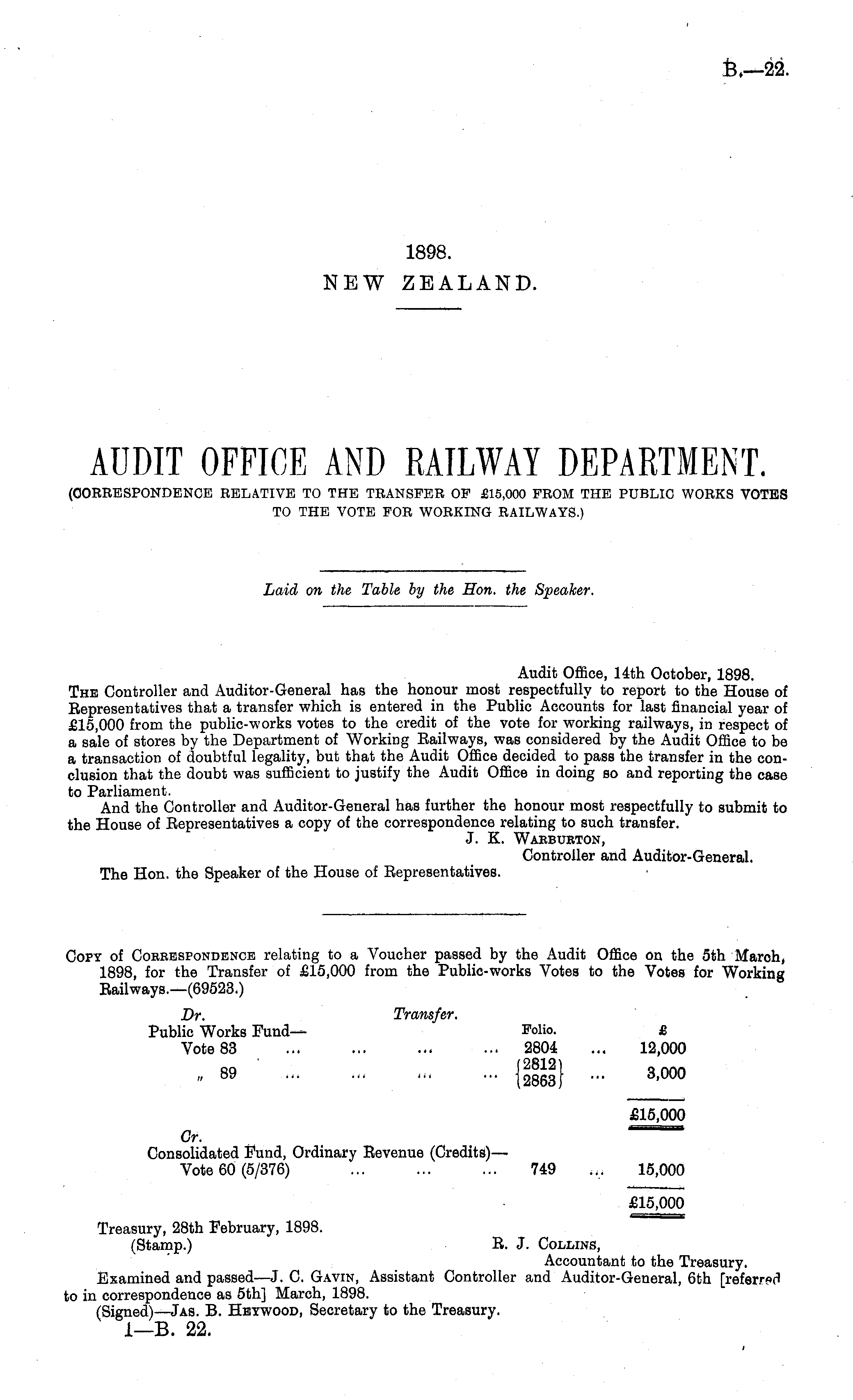 Audit Office, 14th October, 1898. The Controller and Auditor-General has the honour most respectfully to report to the House of Eepresentatives that a transfer which is entered in the Public Accounts for last financial year of £15,000 from the public-works votes to the credit of the vote for working railways, in respect of a sale of stores by the Department of Working Eailways, was considered by the Audit Office to be a transaction of doubtful legality, but that the Audit Office decided to pass the transfer in the conclusion that the doubt was sufficient to justify the Audit Office in doing so and reporting the case to Parliament. And the Controller and Auditor-General has further the honour most respectfully to submit to the House of Eepresentatives a copy of the correspondence relating to such transfer. J. K. Waebubton, Controller and Auditor-General. The Hon. the Speaker of the House of Eepresentatives.