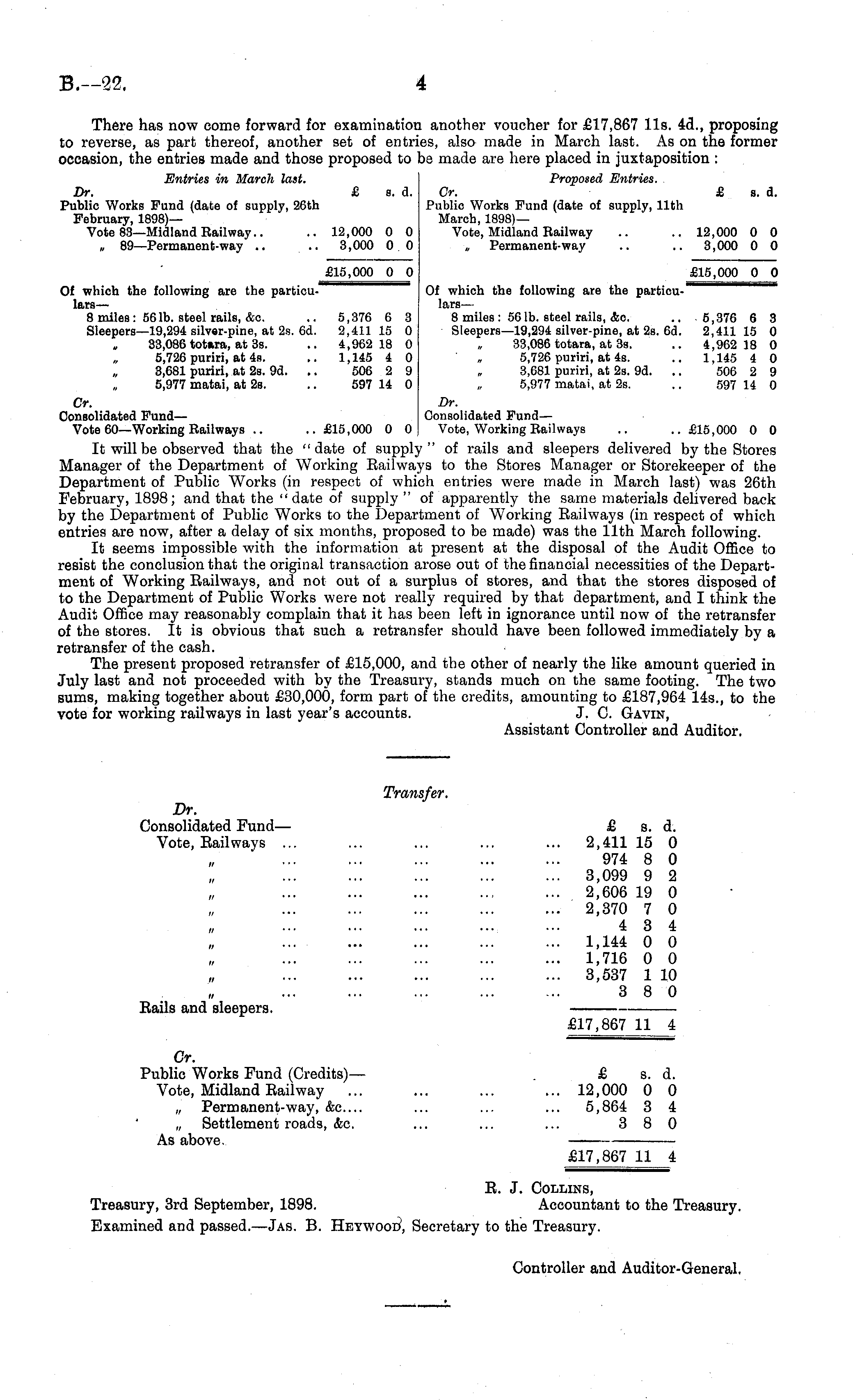 There has now come forward for examination another voucher for £17,867 11s. 4d., proposing to reverse, as part thereof, another set of entries, also made in March last. As on the former occasion, the entries made and those proposed to be made are here placed in juxtaposition : Entries in March last. Proposed Entries. Dr. £ 8. d. Or. £ a. i. Public Works Fund (date of supply, 26th Public Works Fund (date of supply, 11th February, 1898) — March, 1898)— Vote 83—Midland Railway.. .. 12,000 0 0 Vote, Midland Railway .. .. 12,000 0 0 „ 89—Permanent-way .. .. 3,000 0 0 „ Permanent-way .. .. 3,000 0 0 £15,000 0 0 £15,000 0 0 Of which the following are the particu- - ~ Of which the following are the particu-"" lars— lars— 8 miles: 561b. steel rails, &o. .. 5,376 6 3 8 miles : 561b. steel rails, &o. .. 5,376 6 3 Sleepers—l 9,294 silver-pine, at 2s. 6d. 2,41115 0 Sleepers—l 9,294 silver-pine, at 2s. 6d. 2,41115 0 33,086 totara, at 3s. .. 4,962 18 0 „ 33,086 totara, at 3s. .. 4,962 18 0 5,726 puriri, at 4s. .. 1,145 4 0 „ 5,726 puriri, at 4s. .. 1,145 4 0 3,681 puriri, at 2s. 9d. .. 506 2 9 „ 3,681 puriri, at 2s. 9d. .. 506 2 9 5,977 matai, at 2e. .. 597 14 0 „ 5,977 matai, at 2s. .. 597 14 0 Cr. Dr. Consolidated Fund— Consolidated FundVote 60—Working Railways .. ..£15,000 0 0 Vote, Working Railways .. ..£15,000 0 0 It will be observed that the " date of supply " of rails and sleepers delivered by the Stores Manager of the Department of Working Eailways to the Stores Manager or Storekeeper of the Department of Public Works (in respect of which entries were made in March last) was 26th February, 1898; and that the "date of supply " of apparently the same materials delivered back by the Department of Public Works to the Department of Working Railways (in respect of which entries are now, after a delay of six months, proposed to be made) was the 11th March following. It seems impossible with the information at present at the disposal of the Audit Office to resist the conclusion that the original transaction arose out of the financial necessities of the Department of Working Railways, and not out of a surplus of stores, and that the stores disposed of to the Department of Public Works were not really required by that department, and I think the Audit Office may reasonably complain that it has been left in ignorance until now of the retransfer of the stores. It is obvious that such a retransfer should have been followed immediately by a retransfer of the cash. The present proposed retransfer of £15,000, and the other of nearly the like amount queried in July last and not proceeded with by the Treasury, stands much on the same footing. The two Bums, making together about £30,000, form part of the credits, amounting to £187,964 145., to the vote for working railways in last year's accounts. J. C. Gavin, Assistant Controller and Auditor.