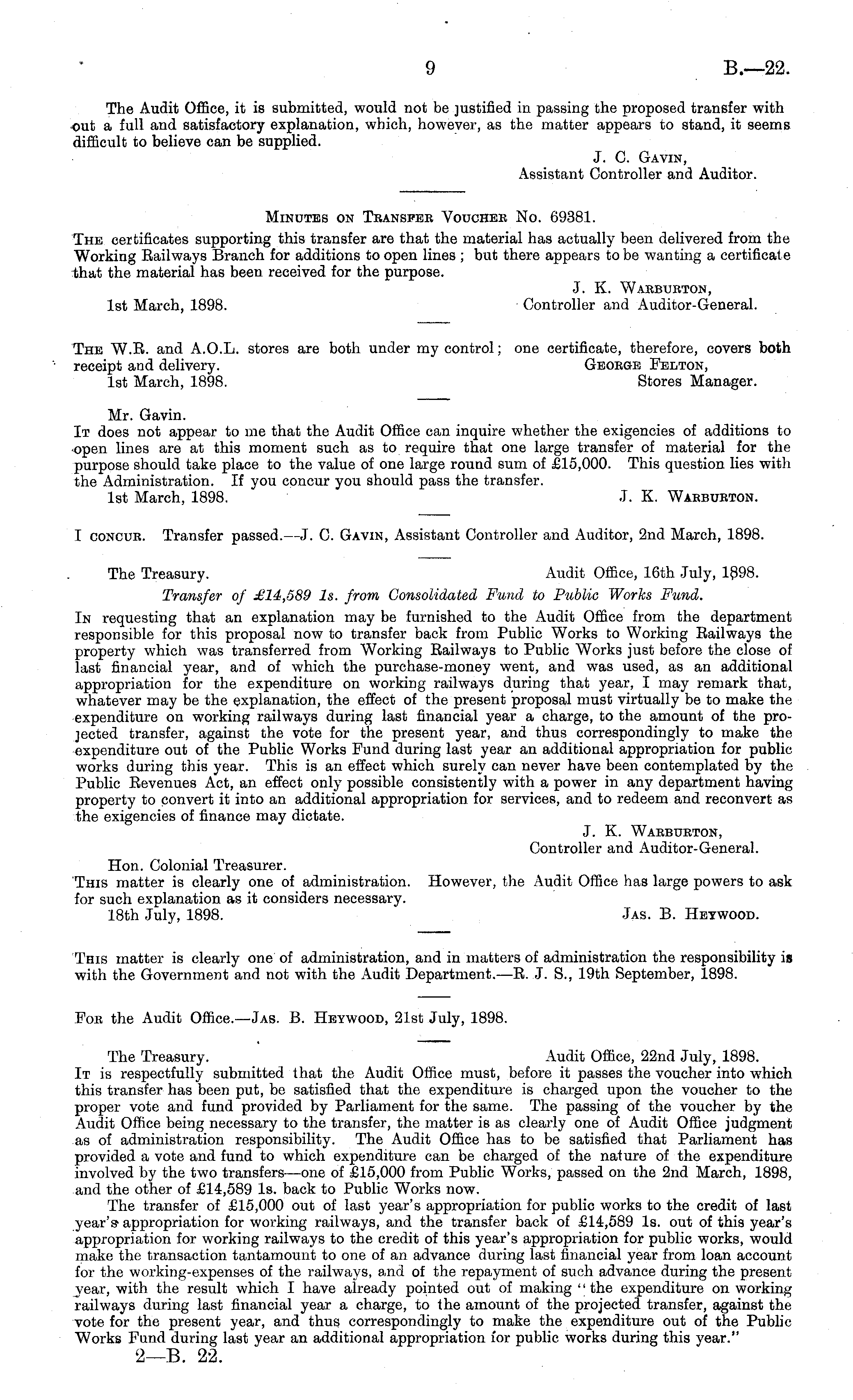 Mr. Gavin. It does not appear to me that the Audit Office can inquire whether the exigencies of additions to open lines are at this moment such as to require that one large transfer of material for the purpose should take place to the value of one large round sum of £15,000. This question lies with the Administration. If you concur you should pass the transfer. Ist March, 1898. J. K. Wabbubton.