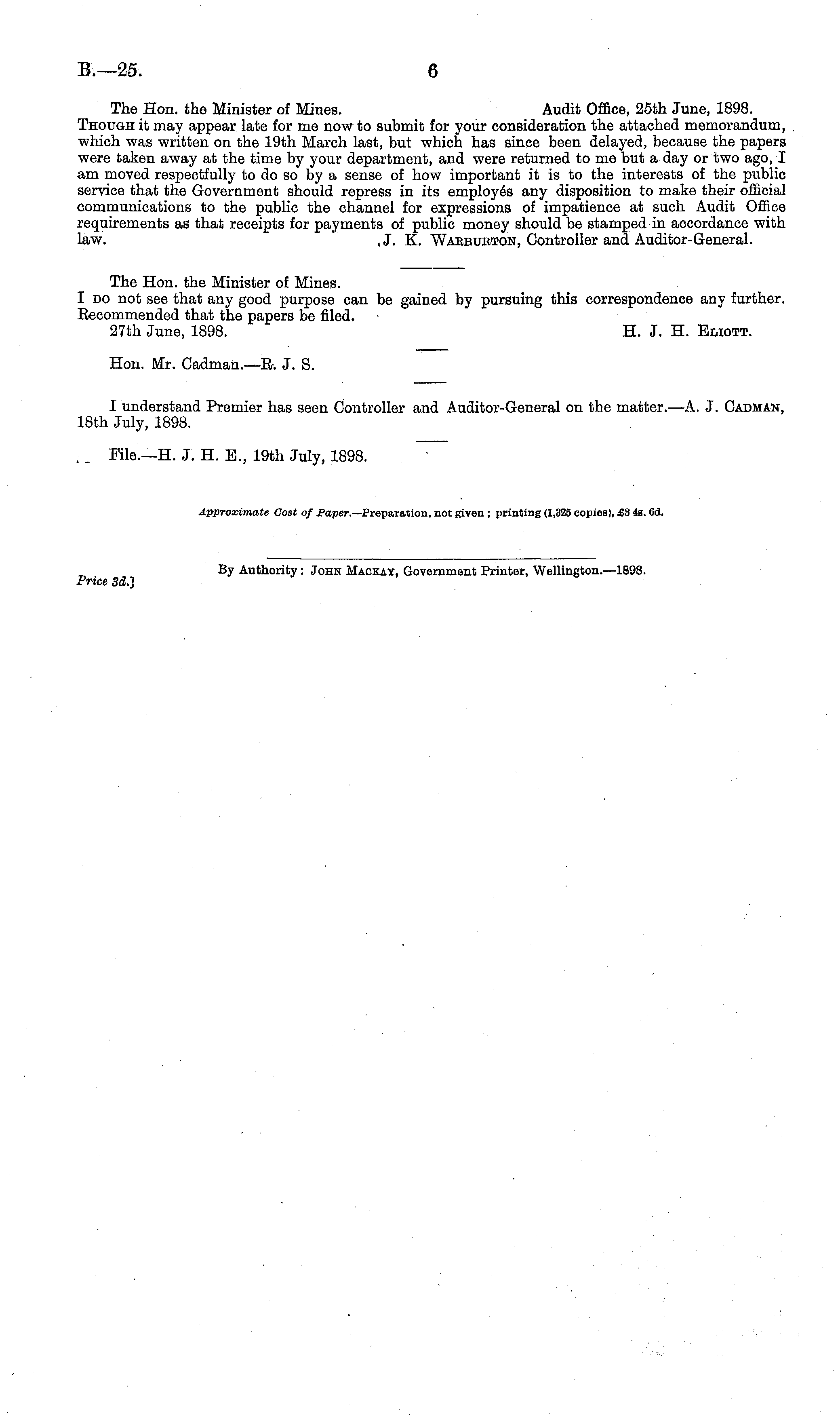 The Hon. the Minister of Mines. Audit Office, 25th June, 1898. Though it may appear late for me now to submit for your consideration the attached memorandum, which was written on the 19th March last, but which has since been delayed, because the papers were taken away at the time by your department, and were returned to me but a day or two ago,T am moved respectfully to do so by a sense of how important it is to the interests of the public service that the Government should repress in its employes any disposition to make their official communications to the public the channel for expressions of impatience at such Audit Office requirements as that receipts for payments of public money should be stamped in accordance with law. J. K. Warburton, Controller and Auditor-General.