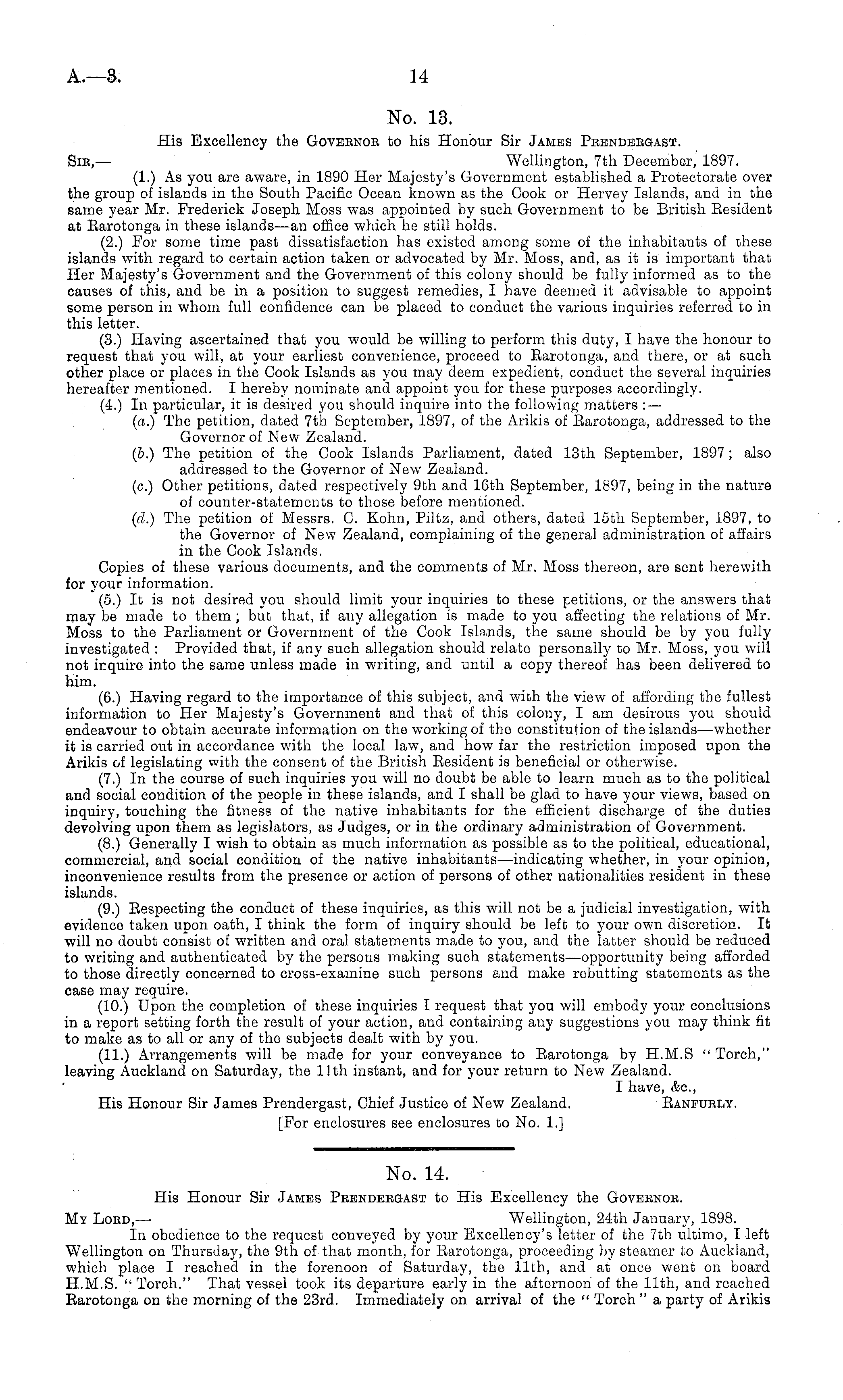 No. 14. His Honour Sir Jambs Pkendekgast to His Excellency the Govebnob. My Lohd, — Wellington, 24th January, 1898. In obedience to the request conveyed by your Excellency's letter of the 7th ultimo, I left Wellington on Thursday, the 9th of that month, for Earotonga, proceeding by steamer to Auckland, which place I reached in the forenoon of Saturday, the 11th, and at once went on board H.M.S. " Torch." That vessel took its departure early in the afternoon of the 11th, and reached Earotonga on the morning of the 23rd. Immediately on arrival of the " Torch " a party of Arikia