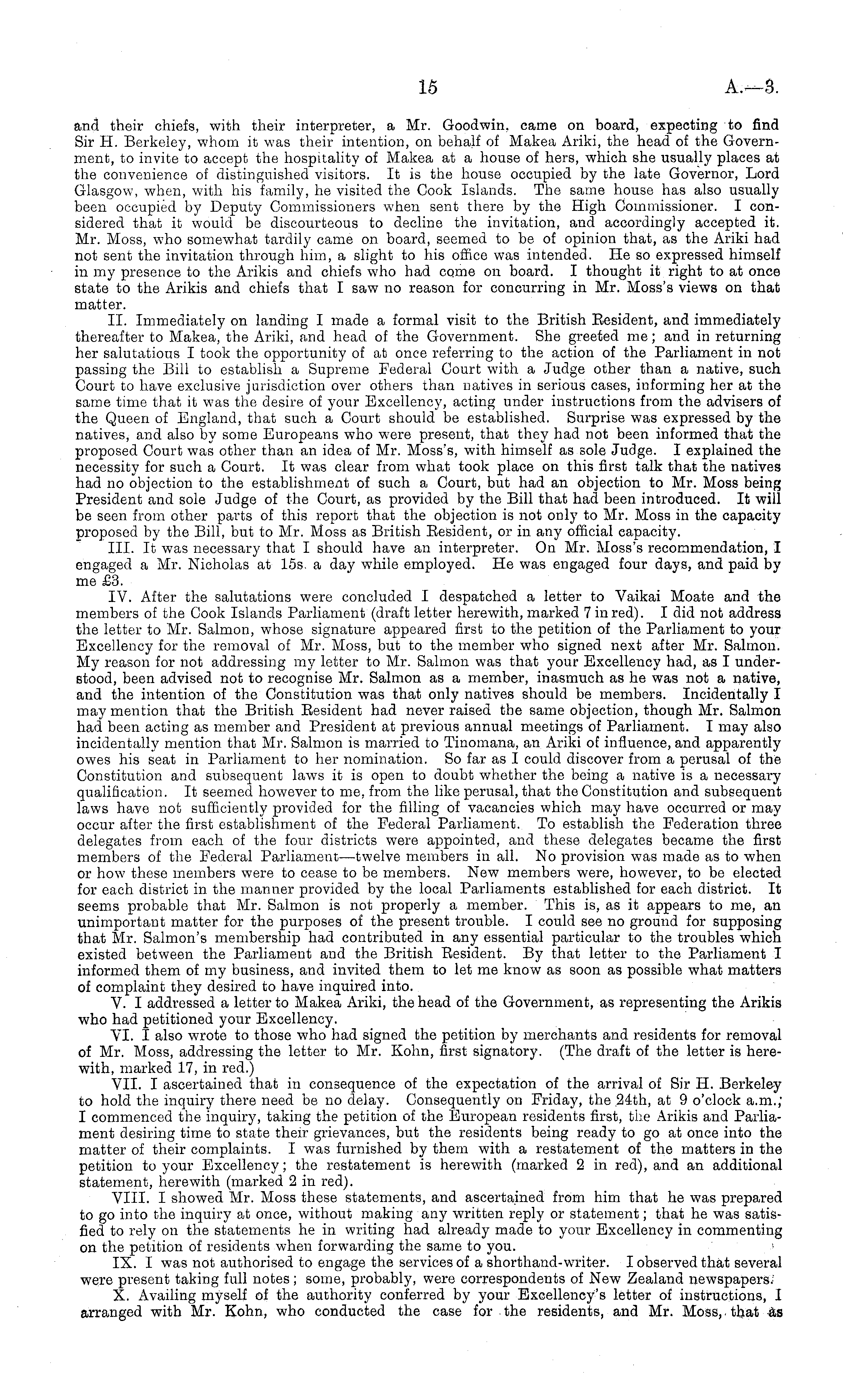 and their chiefs, with their interpreter, a Mr. Goodwin, came on board, expecting to find Sir H. Berkeley, whom it was their intention, on behalf of Makea Ariki, the head of the Government, to invite to accept the hospitality of Makea at a house of hers, which she usually places at the convenience of distinguished visitors. It is the house occupied by the late Governor, Lord Glasgow, when, with his family, he visited the Cook Islands. The same house has also usually been occupied by Deputy Commissioners when sent there by the High Commissioner. I considered that it would be discourteous to decline the invitation, and accordingly accepted it. Mr. Moss, who somewhat tardily came on board, seemed to be of opinion that, as the Ariki had not sent the invitation through him, a slight to his office was intended. He so expressed himself in my presence to the Arikis and chiefs who had come on board. I thought it right to at once state to the Arikis and chiefs that I saw no reason for concurring in Mr. Moss's views on that matter. 11. Immediately on landing I made a formal visit to the British Eesident, and immediately thereafter to Makea, the Ariki, and head of the Government. She greeted me; and in returning her salutations I took the opportunity of at once referring to the action of the Parliament in not passing the Bill to establish a Supreme Federal Court with a Judge other than a native, such Court to have exclusive jurisdiction over others than natives in serious cases, informing her at the same time that it was the desire of your Excellency, acting under instructions from the advisers of the Queen of England, that such a Court should be established. Surprise was expressed by the natives, and also by some Europeans who were present, that they had not been informed that the proposed Court was other than an idea of Mr. Moss's, with himself as sole Judge. I explained the necessity for such a Court. It was clear from what took place on this first talk that the natives had no objection to the establishment of such a Court, but had an objection to Mr. Moss being President and sole Judge of the Court, as provided by the Bill that had been introduced. It will be seen from other parts of this report that the objection is not only to Mr. Moss in the capacity proposed by the Bill, but to Mr. Moss as British Eesident, or in any official capacity. 111. It was necessary that I should have an interpreter. On Mr. Moss's recommendation, I engaged a Mr. Nicholas at 15s. a day while employed. He was engaged four days, and paid by me £3. IV. After the salutations were concluded I despatched a letter to Vaikai Moate and the members of the Cook Islands Parliament (draft letter herewith, marked 7in red). I did not address the letter to Mr. Salmon, whose signature appeared first to the petition of the Parliament to your Excellency for the removal of Mr. Moss, but to the member who signed next after Mr. Salmon. My reason for not addressing my letter to Mr. Salmon was that your Excellency had, as I understood, been advised not to recognise Mr. Salmon as a member, inasmuch as he was not a native, and the intention of the Constitution was that only natives should be members. Incidentally I may mention that the British Kesident had never raised the same objection, though Mr. Salmon had been acting as member and President at previous annual meetings of Parliament. I may also incidentally mention that Mr. Salmon is married to Tinomana, an Ariki of influence, and apparently owes his seat in Parliament to her nomination. So far as I could discover from a perusal of the Constitution and subsequent laws it is open to doubt whether the being a native is a necessary qualification. It seemed however to me, from the like perusal, that the Constitution and subsequent laws have not sufficiently provided for the filling of vacancies which may have occurred or may occur after the first establishment of the Federal Parliament. To establish the Federation three delegates from each of the four districts were appointed, and these delegates became the first members of the Federal Parliament—twelve members in all. No provision was made as to when or how these members were to cease to be members. New members were, however, to be elected for each district in the manner provided by the local Parliaments established for each district. It seems probable that Mr. Salmon is not properly a member. This is, as it appears to me, an unimportant matter for the purposes of the present trouble. I could see no ground for supposing that Mr. Salmon's membership had contributed in any essential particular to the troubles which existed between the Parliament and the British Resident. By that letter to the Parliament I informed them of my business, and invited them to let me know as soon as possible what matters of complaint they desired to have inquired into. V. I addressed a letter to Makea Ariki, the head of the Government, as representing the Arikis who had petitioned your Excellency. VI. I also wrote to those who had signed the petition by merchants and residents for removal of Mr. Moss, addressing the letter to Mr. Kohn, first signatory. (The draft of the letter is herewith, marked 17, in red.) VII. I ascertained that in consequence of the expectation of the arrival of Sir H. Berkeley to hold the inquiry there need be no delay. Consequently on Friday, the 24th, at 9 o'clock a.m.; I commenced the inquiry, taking the petition of the European residents first, the Arikis and Parliament desiring time to state their grievances, but the residents being ready to go at once into the matter of their complaints. I was furnished by them with a restatement of the matters in the petition to your Excellency; the restatement is herewith (marked 2 in red), and an additional statement, herewith (marked 2 in red). VIII. I showed Mr. Moss these statements, and ascertained from him that he was prepared to go into the inquiry at once, without making any written reply or 