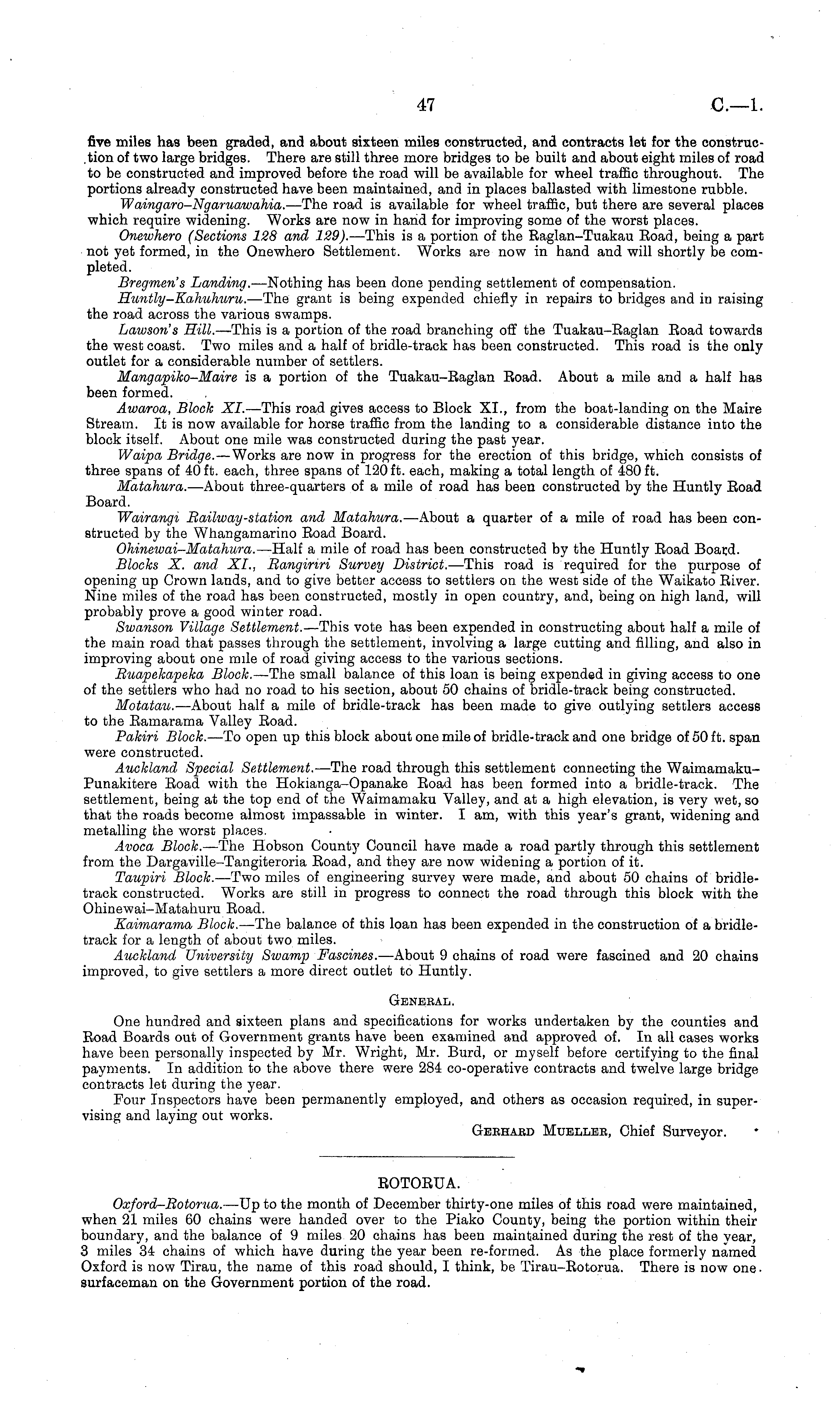 five miles has been graded, and about sixteen miles constructed, and contracts let for the construction of two large bridges. There are still three more bridges to be built and about eight miles of road to be constructed and improved before the road will be available for wheel traffic throughout. The portions already constructed have been maintained, and in places ballasted with limestone rubble. Waingaro-Ngaruawahia. —The road is available for wheel traffic, but there are several places which require widening. Works are now in hand for improving some of the worst places. Onewhero (Sections 128 and 129). —This is a portion of the Raglan-Tuakau Eoad, being a part not yet formed, in the Onewhero Settlement. Works are now in hand and will shortly be completed. Sregmen's Landing. —Nothing has been done pending settlement of compensation. Huntly-Kahuhuru. —The grant is being expended chiefly in repairs to bridges and in raising the road across the various swamps. Lawson's Hill. —This is a portion of the road branching off the Tuakau-Eaglan Eoad towards the west coast. Two miles and a half of bridle-track has been constructed. This road is the only outlet for a considerable number of settlers. Mangapiko-Maire is a portion of the Tuakau-Eaglan Eoad. About a mile and a half has been formed. Awaroa, Block Xl.— This road gives access to Block XI., from the boat-landing on the Maire Stream. It is now available for horse traffic from the landing to a considerable distance into the block itself. About one mile was constructed during the past year. Waipa Bridge. —Works are now in progress for the erection of this bridge, which consists of three spans of 40 ft. each, three spans of 120 ft. each, making a total length of 480 ft. Matahura. —About three-quarters of a mile of road has been constructed by the Huntly Eoad Board. Wairangi Bailway-station and Matahura. —About a quarter of a mile of road has been constructed by the Whangamarino Eoad Board. Ohinewai-Matahura. —Half a mile of road has been constructed by the Huntly Eoad Board. Blocks X. and XI., Ranginri Survey District. —This road is required for the purpose of opening up Crown lands, and to give better access to settlers on the west side of the Waikato Eiver. Nine miles of the road has been constructed, mostly in open country, and, being on high land, will probably prove a good winter road. Swanson Village Settlement. —This vote has been expended in constructing about half a mile of the main road that passes through the settlement, involving a large cutting and filling, and also in improving about one mile of road giving access to the various sections. Buapekapeka Block. —The small balance of this loan is being expended in giving access to one of the settlers who had no road to his section, about 50 chains of bridle-track being constructed. Motatau. —About half a mile of bridle-track has been made to give outlying settlers access to the Eamarama Valley Eoad. Pakiri Block. —To open up this block about one mile of bridle-track and one bridge of 50 ft. span were constructed. Auckland Special Settlement. —The road through this settlement connecting the WaimamakuPunakitere Eoad with the Hokianga-Opanake Eoad has been formed into a bridle-track. The settlement, being at the top end of the Waimamaku Valley, and at a high elevation, is very wet, so that the roads become almost impassable in winter. I am, with this year's grant, widening and metalling the worst places. Avoca Block. —The Hobson County Council have made a road partly through this settlement from the Dargaville-Tangiteroria Eoad, and they are now widening a portion of it. Taupiri Block. —Two miles of engineering survey were made, and about 50 chains of bridletrack constructed. Works are still in progress to connect the road through this block with the Ohinewai-Matahuru Eoad. Kaimarama Block. —The balance of this loan has been expended in the construction of a bridletrack for a length of about two miles. Auckland University Swamp Fascines. —About 9 chains of road were fascined and 20 chains improved, to give settlers a more direct outlet to Huntly. General. One hundred and sixteen plans and specifications for works undertaken by the counties and Eoad Boards out of Government grants have been examined and approved of. In all cases works have been personally inspected by Mr. Wright, Mr. Burd, or myself before certifying to the final payments. In addition to the above there were 284 co-operative contracts and twelve large bridge contracts let during the year. Four Inspectors have been permanently employed, and others as occasion required, in supervising and laying out works. Gehhaed Muellee, Chief Surveyor.