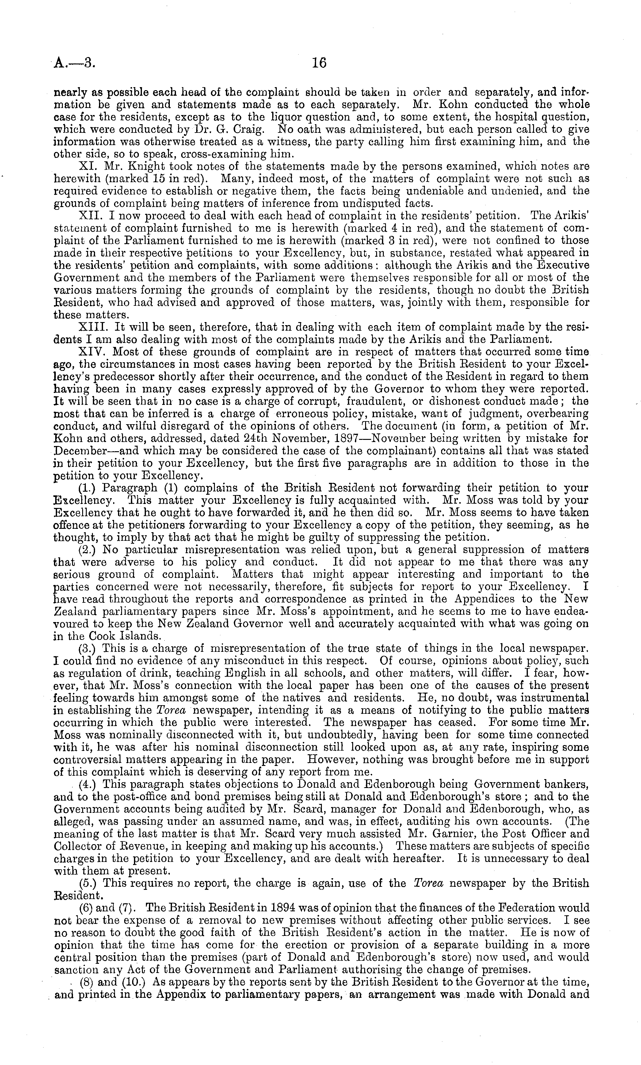 nearly as possible each head of the complaint should be taken in order and separately, and information be given and statements made as to each separately. Mr. Kohn conducted the whole case for the residents, except as to the liquor question and, to some extent, the hospital question, which were conducted by Dr. G. Craig. No oath was administered, but each person called to give information was otherwise treated as a witness, the party calling him first examining him, and the other side, so to speak, cross-examining him. XI. Mr. Knight took notes of the statements made by the persons examined, which notes are herewith (marked 15 in red). Many, indeed most, of the matters of complaint were not such as required evidence to establish or negative them, the facts being undeniable and undenied, and the grounds of complaint being matters of inference from undisputed facts. XII. I now proceed to deal with each head of complaint in the residents' petition. The Arikis' statement of complaint furnished to me is herewith (marked 4 in red), and the statement of complaint of the Parliament furnished to me is herewith (marked 3 in red), were not confined to those made in their respective petitions to your Excellency, but, in substance, restated what appeared in the residents' petition and complaints, with some additions : although the Arikis and the Executive Government and the members of the Parliament were themselves responsible for all or most of the various matters forming the grounds of complaint by the residents, though no doubt the British Eesident, who had advised and approved of those matters, was, jointly with them, responsible for these matters. XIII. It will be seen, therefore, that in dealing with each item of complaint made by the residents I am also dealing with most of the complaints made by the Arikis and the Parliament. XIV. Most of these grounds of complaint are in respect of matters that occurred some time ago, the circumstances in most cases having been reported by the British Eesident to your Excellency's predecessor shortly after their occurrence, and the conduct of the Eesident in regard to them having been in many cases expressly approved of by the Governor to whom they were reported. It will be seen that in no case is a charge of corrupt, fraudulent, or dishonest conduct made; the most that can be inferred is a charge of erroneous policy, mistake, want of judgment, overbearing conduct, and wilful disregard of the opinions of others. The document (in form, a petition of Mr. Kohn and others, addressed, dated 24th November, 1897 —November being written by mistake for December—and which may be considered the case of the complainant) contains all that was stated in their petition to your Excellency, but the first five paragraphs are in addition to those in the petition to your Excellency. (1.) Paragraph (1) complains of the British Eesident not forwarding their petition to your Excellency. This matter your Excellency is fully acquainted with. Mr. Moss was told by your Excellency that he ought to have forwarded it, and he then did so. Mr. Moss seems to have taken offence at the petitioners forwarding to your Excellency a copy of the petition, they seeming, as he thought, to imply by that act that he might be guilty of suppressing the petition. (2.) No particular misrepresentation was relied upon, but a general suppression of matters that were adverse to his policy and conduct. It did not appear to me that there was any serious ground of complaint. Matters that might appear interesting and important to the parties concerned were not necessarily, therefore, fit subjects for report to your Excellency. I have read throughout the reports and correspondence as printed in the Appendices to the New Zealand parliamentary papers since Mr. Moss's appointment, and he seems to me to have endeavoured to keep the New Zealand Governor well and accurately acquainted with what was going on in the Cook Islands. (3.) This is a charge of misrepresentation of the true state of things in the local newspaper. I could find no evidence of any misconduct in this respect. Of course, opinions about policy, such as regulation of drink, teaching English in all schools, and other matters, will differ. I fear, however, that Mr. Moss's connection with the local paper has been one of the causes of the present feeling towards him amongst some of the natives and residents. He, no doubt, was instrumental in establishing the Torea newspaper, intending it as a means of notifying to the public matters occurring in which the public were interested. The newspaper has ceased. For some time Mr. Moss was nominally disconnected with it, but undoubtedly, having been for some time connected with it, he was after his nominal disconnection still looked upon as, at any rate, inspiring some controversial matters appearing in the paper. However, nothing was brought before me in support of this complaint which is deserving of any report from me. (4.) This paragraph states objections to Donald and Edenborough being Government bankers, and to the post-office and bond premises being still at Donald and Edenborough's store ; and to the Government accounts being audited by Mr. Scard, manager for Donald and Edenborough, who, as alleged, was passing under an assumed name, and was, in effect, auditing his own accounts. (The meaning of the last matter is that Mr. Scard very much assisted Mr. Gamier, the Post Officer and Collector of Eevenue, in keeping and making up his accounts.) These matters are subjects of specific charges in the petition to your Excellency, and are dealt with hereafter. It is unnecessary to deal with them at present. (5.) This requires no report, the charge is again, use of the Torea newspaper by the British Eesident. (6) and (7). The British Eesident in 1894 was of opinion that the finances of the Federation would not bear the expense of a removal to new premises without affecting other public services. I see no reason t