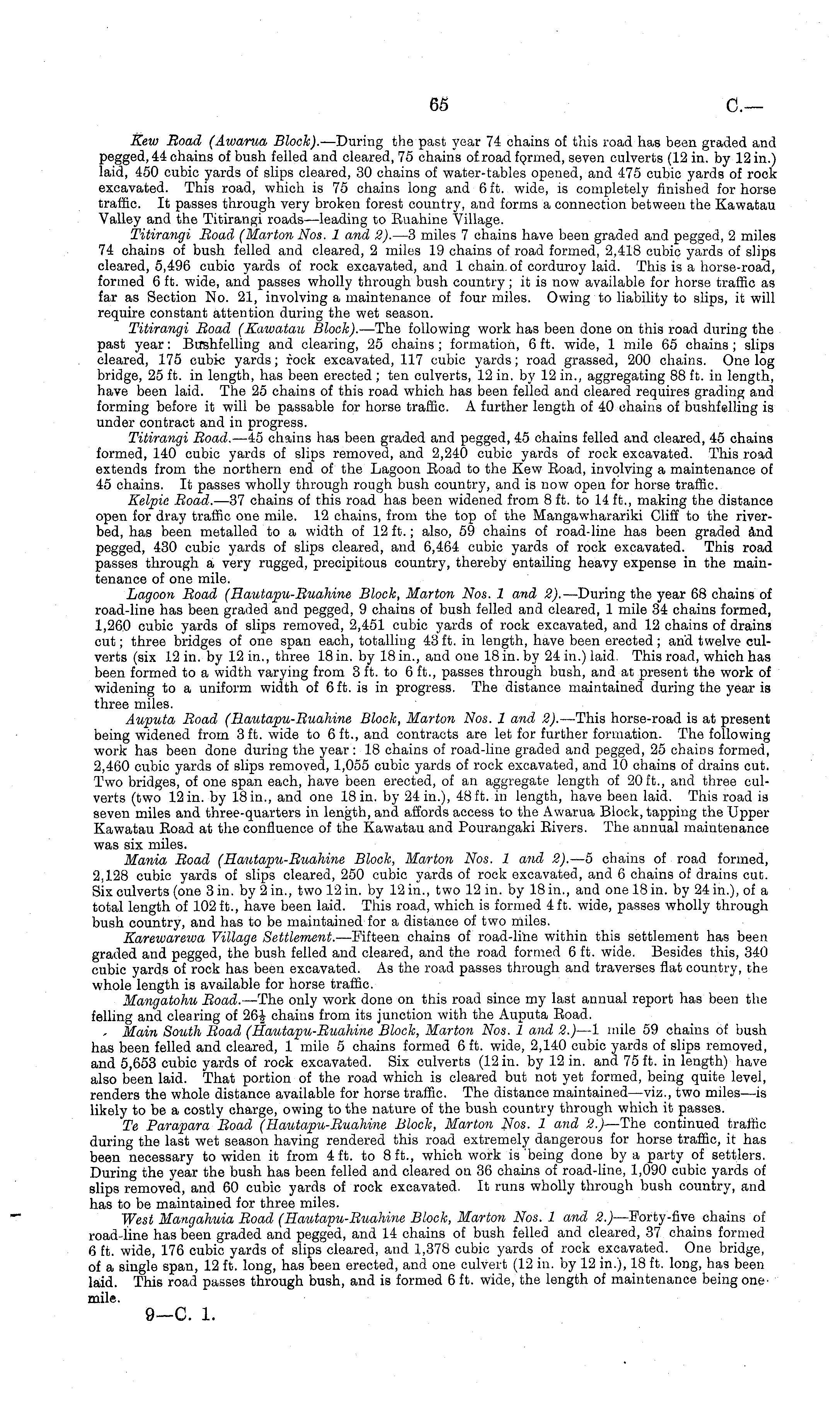 Kew Boad (Awarua Block). —During the past year 74 chains of this road has been graded and pegged, 44 chains of bush felled and cleared, 75 chains of road formed, seven culverts (12 in. by 12 in.) laid, 450 cubic yards of slips cleared, 30 chains of water-tables opened, and 475 cubic yards of rock excavated. This road, which is 75 chains long and 6 ft. wide, is completely finished for horse traffic. It passes through very broken forest country, and forms a connection between the Kawatau Valley and the Titirangi roads —leading to Euahine Village. Titirangi Boad (Mar ton Nos. 1 and 2). —3 miles 7 chains have been graded and pegged, 2 miles 74 chains of bush felled and cleared, 2 miles 19 chains of road formed, 2,418 cubic yards of slips cleared, 5,496 cubic yards of rock excavated, and 1 chain, of corduroy laid. This is a horse-road, formed 6 ft. wide, and passes wholly through bush country; it is now available for horse traffic as far as Section No. 21, involving a maintenance of four miles. Owing to liability to slips, it will require constant attention during the wet season. Titirangi Boad (Kawatau Block). —The following work has been done on this road during the past year: Btrshfelling and clearing, 25 chains ; formation, 6 ft. wide, 1 mile 65 chains ; slips cleared, 175 cubic yards; rock excavated, 117 cubic yards; road grassed, 200 chains. One log bridge, 25 ft. in length, has been erected ; ten culverts, 12 in. by 12 in., aggregating 88 ft. in length, have been laid. The 25 chains of this road which has been felled and cleared requires grading and forming before it will be passable for horse traffic. A further length of 40 chains of bushfelling is under contract and in progress. Titirangi 80ad. —45 chains has been graded and pegged, 45 chains felled and cleared, 45 chains formed, 140 cubic yards of slips removed, and 2,240 cubic yards of rock excavated. This road extends from the northern end of the Lagoon Boad to the Kew Boad, involving a maintenance of 45 chains. It passes wholly through rough bush country, and is now open for horse traffic. Kelpie 80ad. —37 chains of this road has been widened from 8 ft. to 14 ft., making the distance open for dray traffic one mile. 12 chains, from the top of the Mangawharariki Cliff to the riverbed, has been metalled to a width of 12 ft.; also, 59 chains of road-line has been graded and pegged, 430 cubic yards of slips cleared, and 6,464 cubic yards of rock excavated. This road passes through a very rugged, precipitous country, thereby entailing heavy expense in the maintenance of one mile. Lagoon Boad (Rautapu-Buahine Block, Marton Nos. 1 and 2). —During the year 68 chains of road-line has been graded and pegged, 9 chains of bush felled and cleared, 1 mile 34 chains formed, 1,260 cubic yards of slips removed, 2,451 cubic yards of rock excavated, and 12 chains of drains cut; three bridges of one span each, totalling 43 ft. in length, have been erected; and twelve culverts (six 12 in. by 12 in., three 18 in. by 18 in., and one 18 in. by 24 in.) laid. This road, which has been formed to a width varying from 3 ft. to 6 ft., passes through bush, and at present the work of widening to a uniform width of 6 ft. is in progress. The distance maintained during the year is three miles. Auputa Boad (Rautapu-Buahine Block, Marton Nos. 1 and 2). —This horse-road is at present being widened from 3 ft. wide to 6 ft., and contracts are let for further formation. The following work has been done during the year : 18 chains of road-line graded and pegged, 25 chains formed, 2,460 cubic yards of slips removed, 1,055 cubic yards of rock excavated, and 10 chains of drains cut. Two bridges, of one span each, have been erected, of an aggregate length of 20 ft., and three culverts (two 12 in. by 18 in., and one 18 in. by 24 in.), 48 ft. in length, have been laid. This road is seven miles and three-quarters in length, and affords access to the Awarua Block, tapping the Upper Kawatau Eoad at the confluence of the Kawatau and Pourangaki Eivers. The annual maintenance was six miles. Mania Boad (Rautapu-Buahine Block, Marton Nos. 1 and 2). —5 chains of road formed, 2,128 cubic yards of slips cleared, 250 cubic yards of rock excavated, and 6 chains of drains cut. Six culverts (one 3 in. by 2 in., two 12 in. by 12 in., two 12 in. by 18 in., and one 18 in. by 24 in.), of a total length of 102 ft., have been laid. This road, which is formed 4 ft. wide, passes wholly through bush country, and has to be maintained for a distance of two miles. Karewarewa Village Settlement. —Fifteen chains of road-line within this settlement has been graded and pegged, the bush felled and cleared, and the road formed 6 ft. wide. Besides this, 340 cubic yards of rock has been excavated. As the road passes through and traverses flat country, the whole length is available for horse traffic. Mangatohu Boad. —The only work done on this road since my last annual report has been the felling and clearing of 26i chains from its junction with the Auputa Eoad. Main South Boad (Rautapu-Buahine Block, Marton Nos. 1 and 2.) —1 mile 59 chains of bush has been felled and cleared, 1 mile 5 chains formed 6 ft. wide, 2,140 cubic yards of slips removed, and 5,653 cubic yards of rock excavated. Six culverts (12 in. by 12 in. and 75 ft. in length) have also been laid. That portion of the road which is cleared but not yet formed, being quite level, renders the whole distance available for horse traffic. The distance maintained—viz., two miles—is likely to be a costly charge, owing to the nature of the bush country through which it passes. Te Parapara Boad (Rautapu-Buahine Block, Marton Nos. 1 and 2.) —The continued traffic during the last wet season having rendered this road extremely dangerous for horse traffic, it has been necessary to widen it from 4 ft. to 8 ft., which work is 'being done by a party of settlers. During the year the bush has been felled and cleared on 36 chains of road-line