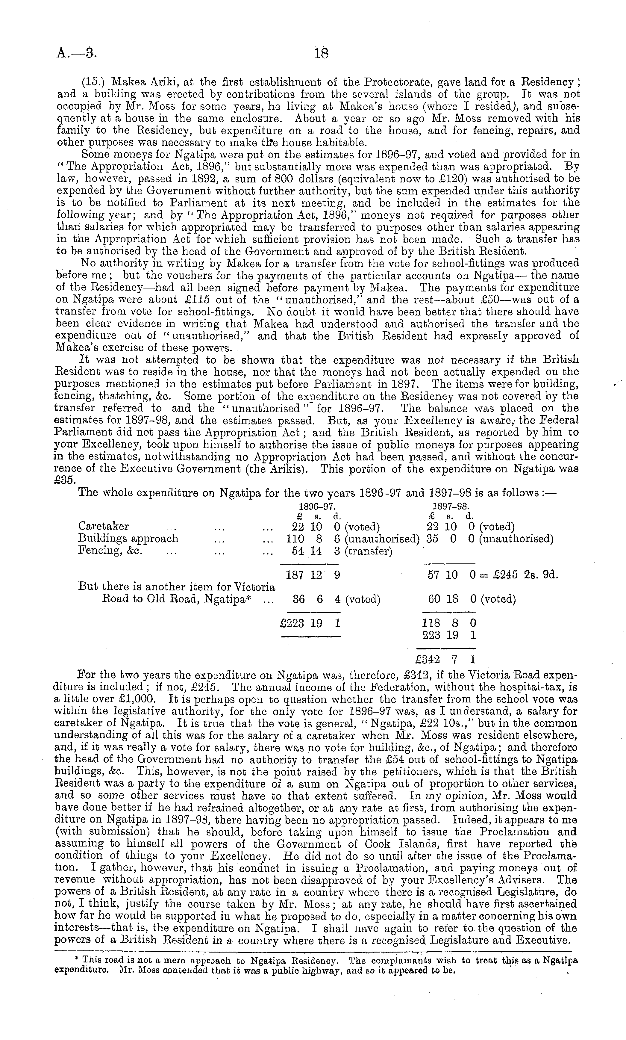 (15.) Makea Ariki, at the first establishment of the Protectorate, gave land for a Eesidency ; and a building was erected by contributions from the several islands of the group. It was not occupied by Mr. Moss for some years, he living at Makea's house (where I and subsequently at a house in the same enclosure. About a year or so ago Mr. Moss removed with his family to the Eesidency, but expenditure on a road to the house, and for fencing, repairs, and other purposes was necessary to make tfcte house habitable. Some moneys for Ngatipa were put on the estimates for 1896-97, and voted and provided for in " The Appropriation Act, 1896," but substantially more was expended than was appropriated. By law, however, passed in 1892, a sum of 800 dollars (equivalent now to £120) was authorised to be expended by the Government without further authority, but the sum expended under this authority is to be notified to Parliament at its next meeting, and be included in the estimates for the following year; and by " The Appropriation Act, 1896," moneys not required for purposes other than salaries for which appropriated may be transferred to purposes other than salaries appearing in the Appropriation Act for which sufficient provision has not been made. Such a transfer has to be authorised by the head of the Government and approved of by the British Resident. No authority in writing by Makea for a transfer from the vote for school-fittings was produced before me; but the vouchers for the payments of the particular accounts on Ngatipa— the name of the Eesidency—had all been signed before payment by Makea. The payments for expenditure on Ngatipa were about £115 out of the " unauthorised," and the rest—about £50—was out of a transfer from vote for school-fittings. No doubt it would have been better that there should have been clear evidence in writing that Makea had understood and authorised the transfer and the expenditure out of " unauthorised," and that the British Eesident had expressly approved of Makea's exercise of these powers. It was not attempted to be shown that the expenditure was not necessary if the British Eesident was to reside in the house, nor that the moneys had not been actually expended on the purposes mentioned in the estimates put before Parliament in 1897. The items were for building, fencing, thatching, &c. Some portion of the expenditure on the Eesidency was not covered by the transfer referred to and the "unauthorised" for 1896-97. The balance was placed on the estimates for 1897-98, and the estimates passed. But, as your Excellency is aware, the Federal Parliament did not pass the Appropriation Act; and the British Eesident, as reported by him to your Excellency, took upon himself to authorise the issue of public moneys for purposes appearing in the estimates, notwithstanding no Appropriation Act had been passed, and without the concurrence of the Executive Government (the Arikis). This portion of the expenditure on Ngatipa was £35. The whole expenditure on Ngatipa for the two years 1896-97 and 1897-98 is as follows : — 1896-97. 1897-98. £ s. d. £ fl. d. Caretaker ... ... ... 22 10 0 (voted) 22 10 0 (voted) Buildings approach ... ... 110 8 6 (unauthorised) 35 0 0 (unauthorised) Fencing, &c. ... ... ... 54 14 3 (transfer) 187 12 9 57 10 0 = £245 2s. 9d. But there is another item for Victoria Eoad to Old Eoad, Ngatipa* ... 36 6 4 (voted) 60 18 0 (voted) £223 19 1 118 8 0 223 19 1 £342 7 1 For the two years the expenditure on Ngatipa was, therefore, £342, if the Victoria Road expenditure is included ;if not, £245. The annual income of the Federation, without the hospital-tax, is a little over £1,000. It is perhaps open to question whether the transfer from the school vote was within the legislative authority, for the only vote for 1896-97 was, as I understand, a salary for caretaker of Ngatipa. It is true that the vote is general, " Ngatipa, £22 105.," but in the common understanding of all this was for the salary of a caretaker when Mr. Moss was resident elsewhere, and, if it was really a vote for salary, there was no vote for building, &c, of Ngatipa; and therefore the head of the Government had no authority to transfer the £54 out of school-fittings to Ngatipa buildings, &c. This, however, is not the point raised by the petitioners, which is that the British Resident was a party to the expenditure of a sum on Ngatipa out of proportion to other services, and so some other services must have to that extent suffered. In my opinion, Mr. Moss would have done better if he had refrained altogether, or at any rate at first, from authorising the expenditure on Ngatipa in 1897-9 d, there having been no appropriation passed. Indeed, it appears to me (with submission) that he should, before taking upon himself to issue the Proclamation and assuming to himself all powers of the Government of Cook Islands, first have reported the condition of things to your Excellency. He did not do so until after the issue of the Proclamation. I gather, however, that his conduct in issuing a Proclamation, and paying moneys out of revenue without appropriation, has not been disapproved of by your Excellency's Advisers. The powers of a British Resident, at any rate in a country where there is a recognised Legislature, do not, I think, justify the course taken by Mr. Moss; at any rate, he should have first ascertained how far he would be supported in what he proposed to do, especially in a matter concerning his own interests—that is, the expenditure on Ngatipa. I shall have again to refer to the question of the powers of a British Resident in a country where there is a recognised Legislature and Executive.