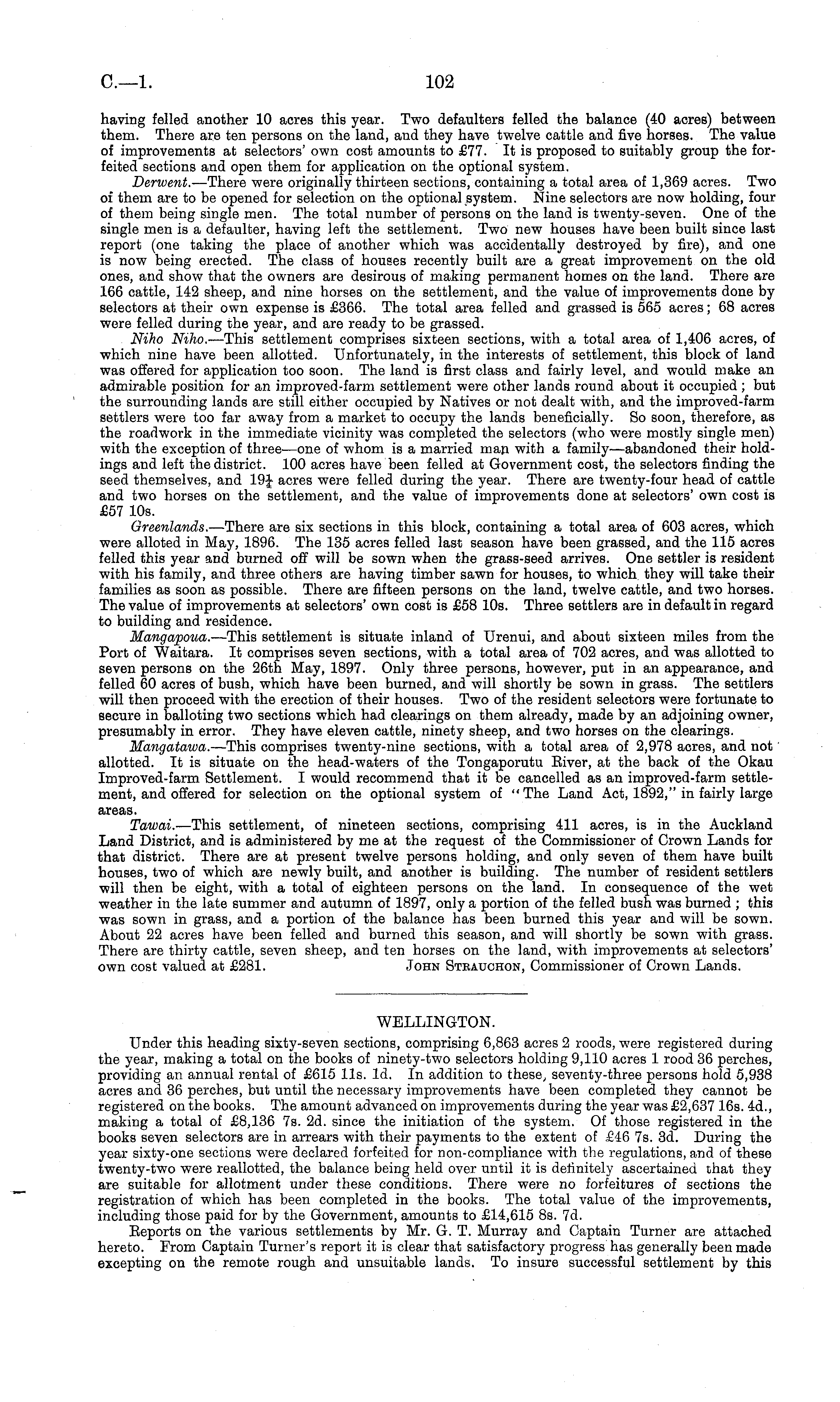 having felled another 10 acres this year. Two defaulters felled the balance (40 acres) between them. There are ten persons on the land, and they have twelve cattle and five horses. The value of improvements at selectors' own cost amounts to £77. It is proposed to suitably group the forfeited sections and open them for application on the optional system. Derwent.— There were originally thirteen sections, containing a total area of 1,369 acres. Two of them are to be opened for selection on the optional system. Nine selectors are now holding, four of them being single men. The total number of persons on the land is twenty-seven. One of the single men is a defaulter, having left the settlement. Two new houses have been built since last report (one taking the place of another which was accidentally destroyed by fire), and one is now being erected. The class of houses recently built are a great improvement on the old ones, and show that the owners are desirous of making permanent homes on the land. There are 166 cattle, 142 sheep, and nine horses on the settlement, and the value of improvements done by selectors at their own expense is £366. The total area felled and grassed is 565 acres; 68 acres were felled during the year, and are ready to be grassed. Niho Niho. —This settlement comprises sixteen sections, with a total area of 1,406 acres, of which nine have been allotted. Unfortunately, in the interests of settlement, this block of land was offered for application too soon. The land is first class and fairly level, and would make an admirable position for an improved-farm settlement were other lands round about it occupied ; but the surrounding lands are still either occupied by Natives or not dealt with, and the improved-farm settlers were too far away from a market to occupy the lands beneficially. So soon, therefore, as the roadwork in the immediate vicinity was completed the selectors (who were mostly single men) with the exception of three-—one of whom is a married man with a family—abandoned their holdings and left the district. 100 acres have been felled at Government cost, the selectors finding the seed themselves, and 19-J- acres were felled during the year. There are twenty-four head of cattle and two horses on the settlement, and the value of improvements done at selectors' own cost is £57 10s. Greenlands.— There are six sections in this block, containing a total area of 603 acres, which were alloted in May, 1896. The 135 acres felled last season have been grassed, and the 115 acres felled this year and burned off will be sown when the grass-seed arrives. One settler is resident with his family, and three others are having timber sawn for houses, to which they will take their families as soon as possible. There are fifteen persons on the land, twelve cattle, and two horses. The value of improvements at selectors' own cost is £58 10s. Three settlers are in default in regard to building and residence. Mangapoua. —This settlement is situate inland of Urenui, and about sixteen miles from the Port of Waitara. It comprises seven sections, with a total area of 702 acres, and was allotted to seven persons on the 26th May, 1897. Only three persons, however, put in an appearance, and felled 60 acres of bush, which have been burned, and will shortly be sown in grass. The settlers will then proceed with the erection of their houses. Two of the resident selectors were fortunate to secure in balloting two sections which had clearings on them already, made by an adjoining owner, presumably in error. They have eleven cattle, ninety sheep, and two horses on the clearings. Mangatawa. —This comprises twenty-nine sections, with a total area of 2,978 acres, and not allotted. It is situate on the head-waters of the Tongaporutu Eiver, at the back of the Okau Improved-farm Settlement. I would recommend that it be cancelled as an improved-farm settlement, and offered for selection on the optional system of "The Land Act, 1892," in fairly large areas. Tawai. —This settlement, of nineteen sections, comprising 411 acres, is in the Auckland Land District, and is administered by me at the request of the Commissioner of Crown Lands for that district. There are at present twelve persons holding, and only seven of them have built houses, two of which are newly built, and another is building. The number of resident settlers will then be eight, with a total of eighteen persons on the land. In consequence of the wet weather in the late summer and autumn of 1897, only a portion of the felled bush was burned ; this was sown in grass, and a portion of the balance has been burned this year and will be sown. About 22 acres have been felled and burned this season, and will shortly be sown with grass. There are thirty cattle, seven sheep, and ten horses on the land, with improvements at selectors' own cost valued at £281. John Steauchon, Commissioner of Crown Lands.