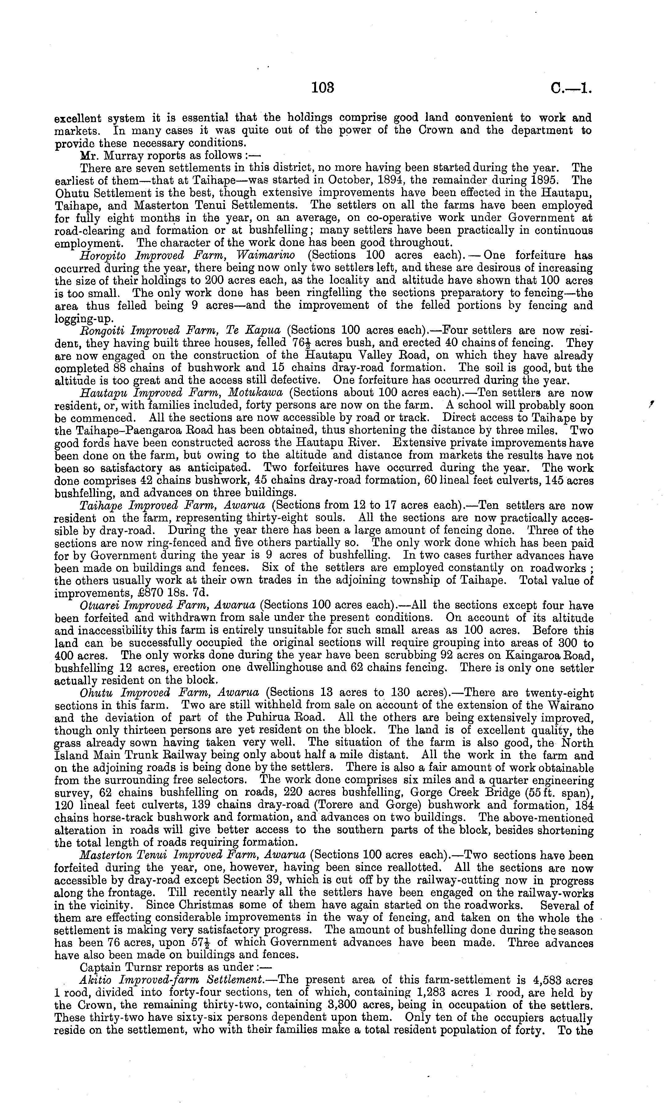 excellent system it is essential that the holdings comprise good land convenient to work and markets. In many cases it was quite out of the power of the Crown and the department to provide these necessary conditions. Mr. Murray roports as follows :— There are seven settlements in this district, no more having been started during the year. The earliest of them—that at Taihape —was started in October, 1894, the remainder during 1895. The Ohutu Settlement is the best, though extensive improvements have been effected in the Hautapu, Taihape, and Masterton Tenui Settlements. The settlers on all the farms have been employed for fully eight months in the year, on an average, on co-operative work under Government at road-clearing and formation or at bushfelling; many settlers have been practically in continuous employment. The character of the work done has been good throughout. Horopito Improved Farm, Waimarino (Sections 100 acres each). — One forfeiture has occurred during the year, there being now only two settlers left, and these are desirous of increasing the size of their holdings to 200 acres each, as the locality and altitude have shown that 100 acres is too small. The only work done has been ringfelling the sections preparatory to fencing—the area thus felled being 9 acres—and the improvement of the felled portions by fencing and logging-up. Bongoiti Improved Farm, Te Eapua (Sections 100 acres each). —Four settlers are now resident, they having built three houses, felled 76f acres bush, and erected 40 chains of fencing. They are now engaged on the construction of the Hautapu Valley Boad, on which they have already completed 88 chains of bushwork and 15 chains dray-road formation. The soil is good, but the altitude is too great and the access still defective. One forfeiture has occurred during the year. Hautapu Improved Farm, Motukawa (Sections about 100 acres each). —Ten settlers are now resident, or, with families included, forty persons are now on the farm. A school will probably soon be commenced. All the sections are now accessible by road or track. Direct access to Taihape by the Taihape-Paengaroa Eoad has been obtained, thus shortening the distance by three miles. Two good fords have been constructed across the Hautapu Eiver. Extensive private improvements have been done on the farm, but owing to the altitude and distance from markets the results have not been so satisfactory as anticipated. Two forfeitures have occurred during the year. The work done comprises 42 chains bushwork, 45 chains dray-road formation, 60 lineal feet culverts, 145 acres bushfelling, and advances on three buildings. Taihape Improved Farm, Awarua (Sections from 12 to 17 acres each). —Ten settlers are now resident on the farm, representing thirty-eight souls. All the sections are now practically accessible by dray-road. During the year there has been a large amount of fencing done. Three of the sections are now ring-fenced and five others partially so. The only work done which has been paid for by Government during the year is 9 acres of bushfelling. In two cases further advances have been made on buildings and fences. Six of the settlers are employed constantly on roadworks ; the others usually work at their own trades in the adjoining township of Taihape. Total value of improvements, £870 18s. 7d. Otuarei Improved Farm, Awarua (Sections 100 acres each). —All the sections except four have been forfeited and withdrawn from sale under the present conditions. On account of its altitude and inaccessibility this farm is entirely unsuitable for such small areas as 100 acres. Before this land can be successfully occupied the original sections will require grouping into areas of 300 to 400 acres. The only works done during the year have been scrubbing 92 acres on Kaingaroa Eoad, bushfelling 12 acres, erection one dwellinghouse and 62 chains fencing. There is only one settler actually resident on the block. Ohutu Improved Farm, Awarua (Sections 13 acres to 130 acres). —There are twenty-eight sections in this farm. Two are still withheld from sale on account of the extension of the Wairano and the deviation of part of the Puhirua Eoad. All the others are being extensively improved, though only thirteen persons are yet resident on the block. The land is of excellent quality, the grass already sown having taken very well. The situation of the farm is also good, the North Island Main Trunk Eailway being only about half a mile distant. All the work in the farm and on the adjoining roads is being done by the settlers. There is also a fair amount of work obtainable from the surrounding free selectors. The work done comprises six miles and a quarter engineering survey, 62 chains bushfelling on roads, 220 acres bushfelling, Gorge Creek Bridge (55ft. span), 120 lineal feet culverts, 139 chains dray-road (Torere and Gorge) bushwork and formation, 184 chains horse-track bushwork and formation, and advances on two buildings. The above-mentioned alteration in roads will give better access to the southern parts of the block, besides shortening the total length of roads requiring formation. Masterton Tenui Improved Farm, Awarua (Sections 100 acres each). —Two sections have been forfeited during the year, one, however, having been since reallotted. All the sections are now accessible by dray-road except Section 39, which is cut off by the railway-cutting now in progress along the frontage. Till recently nearly all the settlers have been engaged on the railway-works in the vicinity. Since Christmas some of them have again started on the roadworks. Several of them are effecting considerable improvements in the way of fencing, and taken on the whole the settlement is making very satisfactory progress. The amount of bushfelling done during the season has been 76 acres, upon 57-i of which Government advances have been made. Three advances have also been made on buildings and fences. Captain Turnsr reports as unde