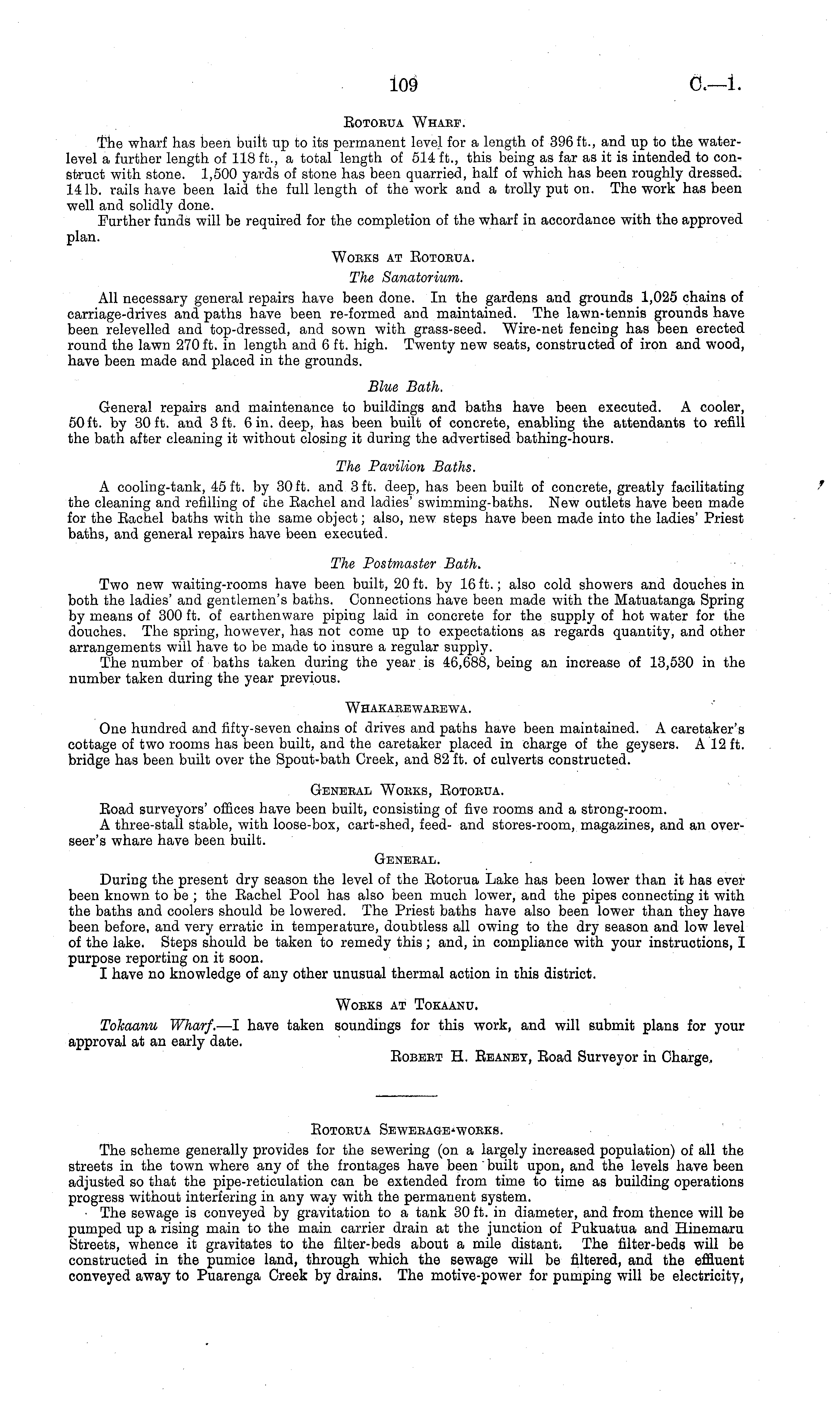 EOTOBUA WhAEF. The wharf has been built up to its permanent level for a length of 396 ft., and up to the waterlevel a further length of 118 ft., a total length of 514 ft., this being as far as it is intended to construct with stone. 1,500 yards of stone has been quarried, half of which has been roughly dressed. 141b. rails have been laid the full length of the work and a trolly put on. The work has been well and solidly done. Further funds will be required for the completion of the wharf in accordance with the approved plan. WOBKS AT BOTOBUA. The Sanatorium. All necessary general repairs have been done. In the gardens and grounds 1,025 chains of carriage-drives and paths have been re-formed and maintained. The lawn-tennis grounds have been relevelled and top-dressed, and sown with grass-seed. Wire-net fencing has been erected round the lawn 270 ft. in length and 6 ft. high. Twenty new seats, constructed of iron and wood, have been made and placed in the grounds. Blue Bath. General repairs and maintenance to buildings and baths have been executed. A cooler, 50 ft. by 30 ft. and 3 ft. 6 in. deep, has been built of concrete, enabling the attendants to refill the bath after cleaning it without closing it during the advertised bathing-hours. The Pavilion Baths. A cooling-tank, 45 ft. by 30 ft. and 3 ft. deep, has been built of concrete, greatly facilitating the cleaning and refilling of ohe Eachel and ladies' swimming-baths. New outlets have been made for the Eachel baths with the same object; also, new steps have been made into the ladies' Priest baths, and general repairs have been executed. The Postmaster Bath, Two new waiting-rooms have been built, 20 ft. by 16 ft.; also cold showers and douches in both the ladies' and gentlemen's baths. Connections have been made with the Matuatanga Spring by means of 300 ft. of earthenware piping laid in concrete for the supply of hot water for the douches. The spring, however, has not come up to expectations as regards quantity, and other arrangements will have to be made to insure a regular supply. The number of baths taken during the year is 46,688, being an increase of 13,530 in the number taken during the year previous. Whakaee wake wa . One hundred and fifty-seven chains of drives and paths have been maintained. A caretaker's cottage of two rooms has been built, and the caretaker placed in charge of the geysers. Al2 ft. bridge has been built over the Spout-bath Creek, and 82 ft. of culverts constructed. General Woeks, Eotoeua. Eoad surveyors' offices have been built, consisting of five rooms and a strong-room. A three-stall stable, with loose-box, cart-shed, feed- and stores-room, magazines, and an overseer's whare have been built. Geneeal. During the present dry season the level of the Eotorua Lake has been lower than it has ever been known to be ; the Eachel Pool has also been much lower, aud the pipes connecting it with the baths and coolers should be lowered. The Priest baths have also been lower than they have been before, and very erratic in temperature, doubtless all owing to the dry season and low level of the lake. Steps should be taken to remedy this ; and, in compliance with your instructions, I purpose reporting on it soon. I have no knowledge of any other unusual thermal action in this district. Woeks at Tokaanu. Tohaanu Wharf. —I have taken soundings for this work, and will submit plans for your approval at an early date. Eobeet H. Reaney, Road Surveyor in Charge, Eotoeua Sewebage-woeks. The scheme generally provides for the sewering (on a largely increased population) of all the streets in the town where any of the frontages have been' built upon, and the levels have been adjusted so that the pipe-reticulation can be extended from time to time as building operations progress without interfering in any way with the permanent system. The sewage is conveyed by gravitation to a tank 30 ft. in diameter, and from thence will be pumped up a rising main to the main carrier drain at the junction of Pukuatua and Hinemaru Streets, whence it gravitates to the filter-beds about a mile distant. The filter-beds will be constructed in the pumice land, through which the sewage will be filtered, and the effluent conveyed away to Puarenga Creek by drains. The motive-power for pumping will be electricity,