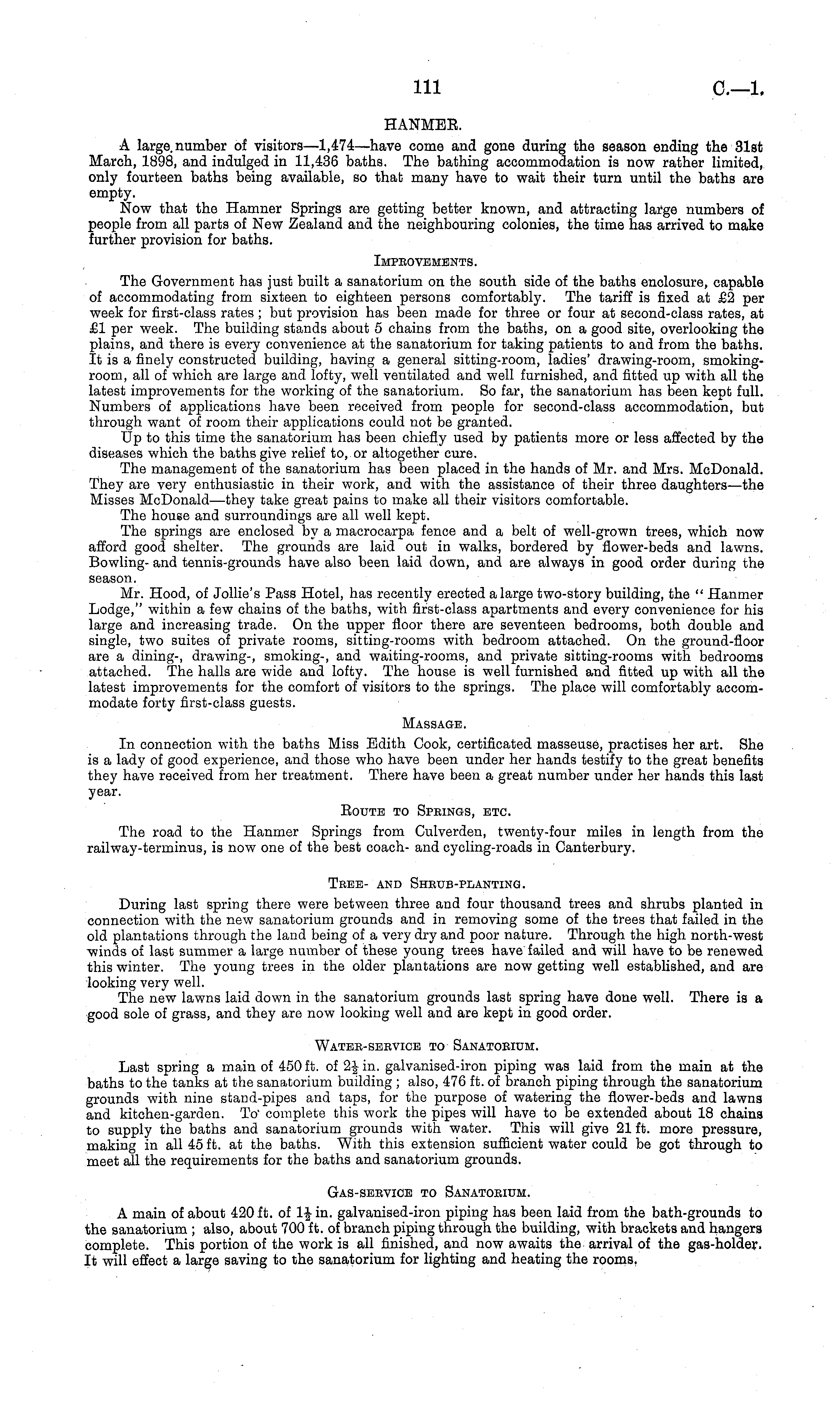 HANMBE. A large, number of visitors—l,474 —have come and gone during the season ending the 31st March, 1898, and indulged in 11,436 baths. The bathing accommodation is now rather limited, only fourteen baths being available, so that many have to wait their turn until the baths are empty. Now that the Hamner Springs are getting better known, and attracting large numbers of people from all parts of New Zealand and the neighbouring colonies, the time has arrived to make further provision for baths. Improvements. The Government has just built a sanatorium on the south side of the baths enclosure, capable of accommodating from sixteen to eighteen persons comfortably. The tariff is fixed at £2 per week for first-class rates ; but provision has been made for three or four at second-class rates, at £1 per week. The building stands about 5 chains from the baths, on a good site, overlooking the plains, and there is every convenience at the sanatorium for taking patients to and from the baths. It is a finely constructed building, having a general sitting-room, ladies' drawing-room, smokingroom, all of which are large and lofty, well ventilated and well furnished, and fitted up with all the latest improvements for the working of the sanatorium. So far, the sanatorium has been kept full. Numbers of applications have been received from people for second-class accommodation, but through want of room their applications could not be granted. Up to this time the sanatorium has been chiefly used by patients more or less affected by the diseases which the baths give relief to, or altogether cure. The management of the sanatorium has been placed in the hands of Mr. and Mrs. McDonald. They are very enthusiastic in their work, and with the assistance of their three daughters—the Misses McDonald—they take great pains to make all their visitors comfortable. The house and surroundings are all well kept. The springs are enclosed by a macrocarpa fence and a belt of well-grown trees, which now afford good shelter. The grounds are laid out in walks, bordered by flower-beds and lawns. Bowling- and tennis-grounds have also been laid down, and are always in good order during the season. Mr. Hood, of Jollies Pass Hotel, has recently erected a large two-story building, the " Hanmer Lodge," within a few chains of the baths, with first-class apartments and every convenience for his large and increasing trade. On the upper floor there are seventeen bedrooms, both double and single, two suites of private rooms, sitting-rooms with bedroom attached. On the ground-floor are a dining-, drawing-, smoking-, and waiting-rooms, and private sitting-rooms with bedrooms attached. The halls are wide and lofty. The house is well furnished and fitted up with all the latest improvements for the comfort of visitors to the springs. The place will comfortably accommodate forty first-class guests. Massage. In connection with the baths Miss Edith Cook, certificated masseuse, practises her art. She is a lady of good experience, and those who have been under her hands testify to the great benefits they have received from her treatment. There have been a great number under her hands this last year. Eoute to Springs, etc. The road to the Hanmer Springs from Culverden, twenty-four miles in length from the railway-terminus, is now one of the best coach- and cycling-roads in Canterbury. Tree- and Shrub-planting. During last spring there were between three and four thousand trees and shrubs planted in connection with the new sanatorium grounds and in removing some of the trees that failed in the old plantations through the land being of a very dry and poor nature. Through the high north-west winds of last summer a large number of these young trees have failed and will have to be renewed this winter. The young trees in the older plantations are now getting well established, and are looking very well. The new lawns laid down in the sanatorium grounds last spring have done well. There is a good sole of grass, and they are now looking well and are kept in good order. Water-service to Sanatorium. Last spring a main of 450 ft. of in. galvanised-iron piping was laid from the main at the baths to the tanks at the sanatorium building ; also, 476 ft. of branch piping through the sanatorium grounds with nine stand-pipes and taps, for the purpose of watering the flower-beds and lawna and kitchen-garden. To" complete this work the pipes will have to be extended about 18 chains to supply the baths and sanatorium grounds with water. This will give 21 ft. more pressure, making in all 45 ft. at the baths. With this extension sufficient water could be got through to meet all the requirements for the baths and sanatorium grounds. Gas-service to Sanatorium. A main of about 420 ft. of 1J in. galvanised-iron piping has been laid from the bath-grounds to the sanatorium ; also, about 700 ft. of branch piping through the building, with brackets and hangers complete. This portion of the work is all finished, and now awaits the arrival of the gas-holder. It will effect a large saving to the sanatorium for lighting and heating the rooms.