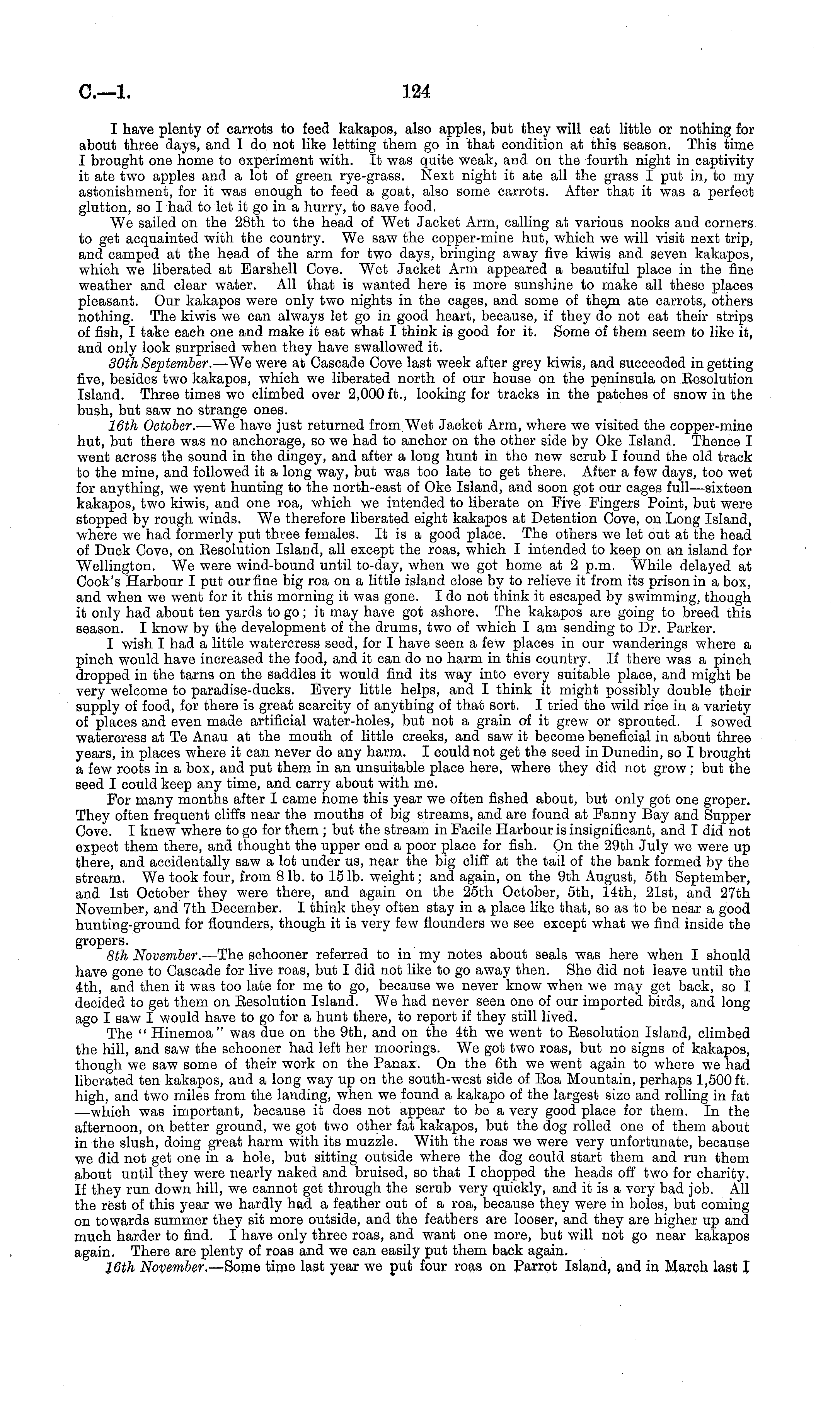 I have plenty of carrots to feed kakapos, also apples, but they will eat little or nothing for about three days, and I do not like letting them go in "that condition at this season. This time I brought one home to experiment with. It was quite weak, and on the fourth night in captivity it ate two apples and a lot of green rye-grass. Next night it ate all the grass I put in, to my astonishment, for it was enough to feed a goat, also some carrots. After that it was a perfect glutton, so I had to let it go in a hurry, to save food. We sailed on the 28th to the head of Wet Jacket Arm, calling at various nooks and corners to get acquainted with the country. We saw the copper-mine hut, which we will visit next trip, and camped at the head of the arm for two days, bringing away five kiwis and seven kakapos, which we liberated at Barshell Cove. Wet Jacket Arm appeared a beautiful place in the fine weather and clear water. All that is wanted here is more sunshine to make all these places pleasant. Our kakapos were only two nights in the cages, and some of thejn ate carrots, others nothing. The kiwis we can always let go in good heart, because, if they do not eat their strips of fish, I take each one and make it eat what I think is good for it. Some of them seem to like it, and only look surprised when they have swallowed it. 30th September. —We were at Cascade Cove last week after grey kiwis, and succeeded in getting five, besides two kakapos, which we liberated north of our house on the peninsula on Eesolution Island. Three times we climbed over 2,000 ft., looking for tracks in the patches of snow in the bush, but saw no strange ones. 16th October. —We have just returned from Wet Jacket Arm, where we visited the copper-mine hut, but there was no anchorage, so we had to anchor on the other side by Oke Island. Thence I went across the sound in the dingey, and after a long hunt in the new scrub I found the old track to the mine, and followed it a long way, but was too late to get there. After a few days, too wet for anything, we went hunting to the north-east of Oke Island, and soon got our cages full—sixteen kakapos, two kiwis, and one roa, which we intended to liberate on Five Fingers Point, but were stopped by rough winds. We therefore liberated eight kakapos at Detention Cove, on Long Island, where we had formerly put three females. It is a good place. The others we let out at the head of Duck Cove, on Eesolution Island, all except the roas, which I intended to keep on an island for Wellington. We were wind-bound until to-day, when we got home at 2 p.m. While delayed at Cook's Harbour I put our fine big roa on a little island close by to relieve it from its prison in a box, and when we went for it this morning it was gone. Ido not think it escaped by swimming, though it only had about ten yards to go; it may have got ashore. The kakapos are going to breed this season. I know by the development of the drums, two of which I am sending to Dr. Parker. I wish I had a little watercress seed, for I have seen a few places in our wanderings where a pinch would have increased the food, and it can do no harm in this country. If there was a pinch dropped in the tarns on the saddles it would find its way into every suitable place, and might be very welcome to paradise-ducks. Every little helps, and I think it might possibly double their supply of food, for there is great scarcity of anything of that sort. I tried the wild rice in a variety of places and even made artificial water-holes, but not a grain of it grew or sprouted, I sowed watercress at Te Anau at the mouth of little creeks, and saw it become beneficial in about three years, in places where it can never do any harm. I could not get the seed in Dunedin, so I brought a few roots in a box, and put them in an unsuitable place here, where they did not grow; but the seed I could keep any time, and carry about with me. For many months after I came home this year we often fished about, but only got one groper. They often frequent cliffs near the mouths of big streams, and are found at Fanny Bay and Supper Cove. I knew where to go for them ; but the stream in Facile Harbour is insignificant, and I did not expect them there, and thought the upper end a poor place for fish. On the 29th July we were up there, and accidentally saw a lot under us, near the big cliff at the tail of the bank formed by the stream. We took four, from 8 lb. to 15 lb. weight; and again, on the 9th August, sth September, and Ist October they were there, and again on the 25th October, sth, 14th, 21st, and 27th November, and 7th December. I think they often stay in a place like that, so as to be near a good hunting-ground for flounders, though it is very few flounders we see except what we find inside the gropers. Bth November. —The schooner referred to in my notes about seals was here when I should have gone to Cascade for live roas, but I did not like to go away then. She did not leave until the 4th, and then it was too late for me to go, because we never know when we may get back, so I decided to get them on Eesolution Island. We had never seen one of our imported birds, and long ago I saw I would have to go for a hunt there, to report if they still lived. The " Hinemoa" was due on the 9th, and on the 4th we went to Eesolution Island, climbed the hill, and saw the schooner had left her moorings. We got two roas, but no signs of kakapos, though we saw some of their work on the Panax. On the 6th we went again to where we had liberated ten kakapos, and a long way up on the south-west side of Eoa Mountain, perhaps 1,500 ft. high, and two miles from the landing, when we found a kakapo of the largest size and rolling in fat —which was important, because it does not appear to be a very good place for them. In the afternoon, on better ground, we got two other fat kakapos, but the dog rolled one of them about in the slush, doing great harm with its muzzle. With the roas we were ver