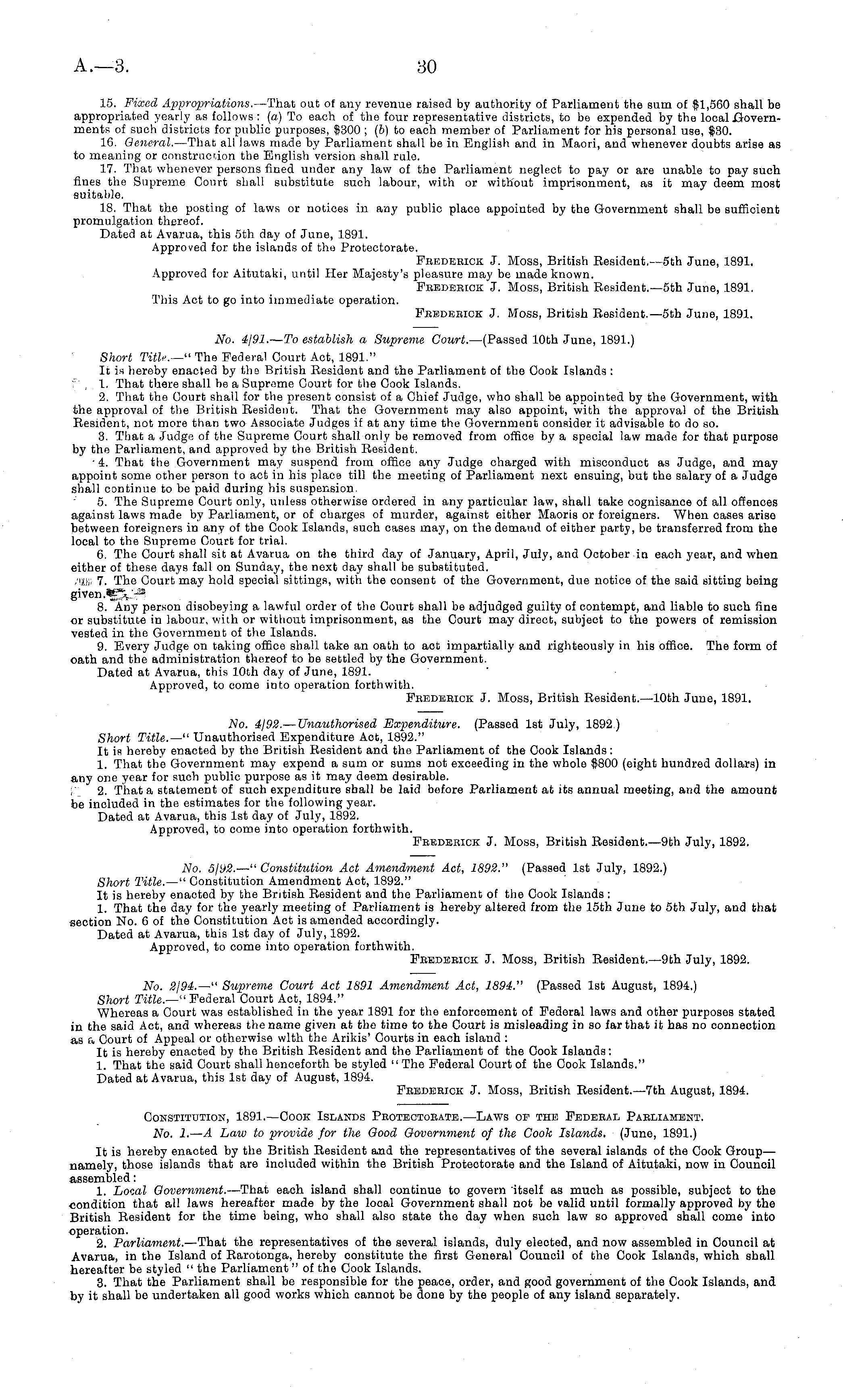 Constitution, 1891.—Cook Islands Protectorate.—Laws of the Federal Paeliament. No. I. — A Law to provide for the Good Government of the Cook Islands. (June, 1891.) It is hereby enacted by the British Resident and the representatives of the several islands of the Cook Group— namely, those islands that are included within the British Protectorate and the Island of Aitutaki, now in Council assembled: 1. Local Government. —That each island shall continue to govern itself as much as possible, subject to the condition that all laws hereafter made by the local Government shall not be valid until formally approved by the British Resident for the time being, who shall also state the day when such law so approved shall come into operation. 2. Parliament. —That the representatives of the several islands, duly elected, and now assembled in Council at Avarua, in the Island of Rarotonga, hereby constitute the first General Council of the Cook Islands, which shall hereafter be styled " the Parliament" of the Cook Islands. 3. That the Parliament shall be responsible for the peace, order, and good government of the Cook Islands, and by it shall be undertaken all good works which cannot be done by the people of any island separately.