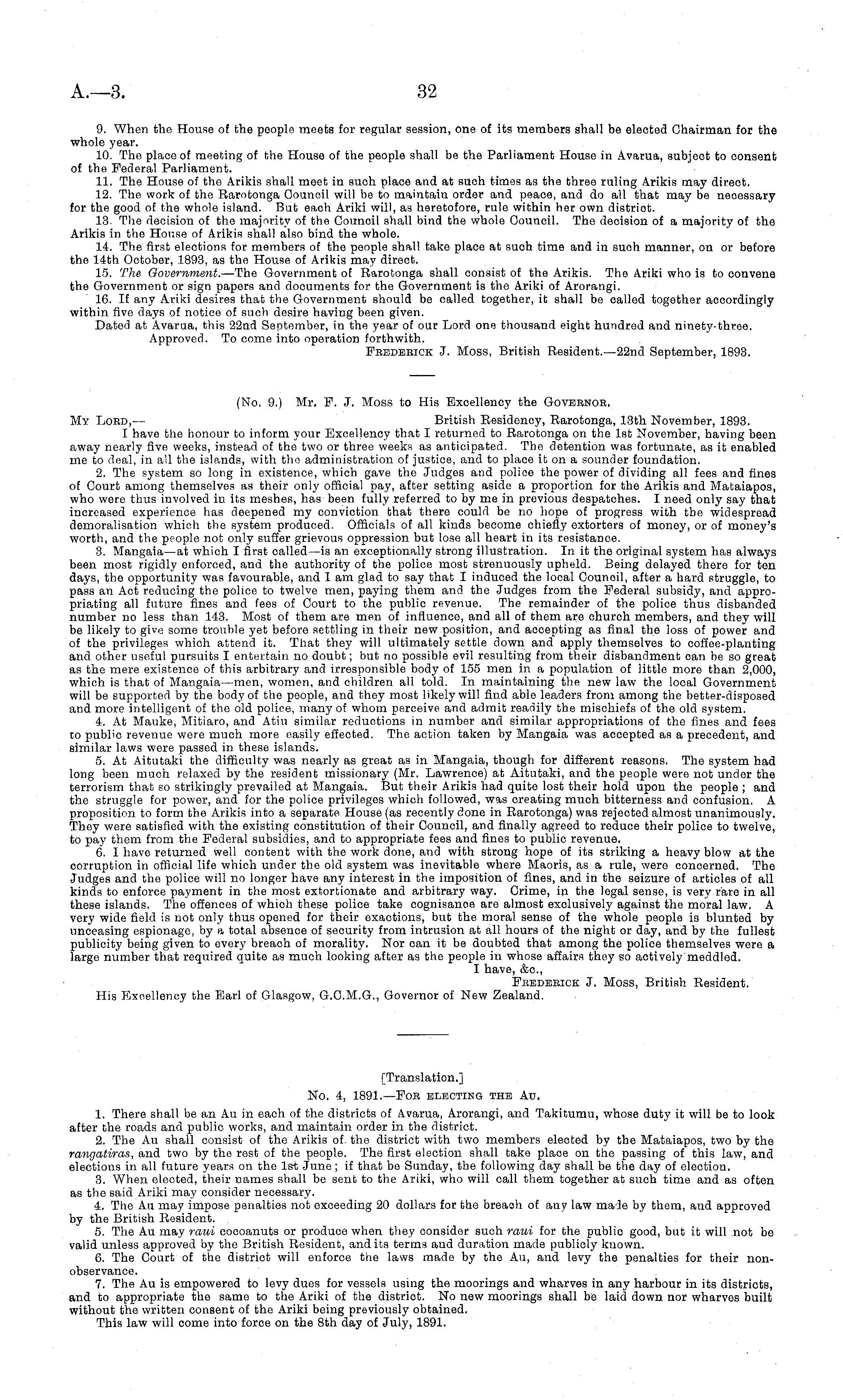 9. When the House of the people meets for regular session, one of its members shall be elected Chairman for the whole year. 10. The place of meeting of the House of the people shall be the Parliament House in Avarua, subject to consent of the Federal Parliament. 11. The House of the Arikis shall meet in such place and at such times as the three ruling Arikis may direct. 12. The work of the Rarotonga Council will be to maintain order and peace, and do all that may be necessary for the good of the whole island. But each Ariki will, as heretofore, rule within her own district. 13. The decision of the majority of the Council shall bind the whole Council. The decision of a majority of the Arikis in the House of Arikis shall also bind the whole. 14. The first elections for members of the people shall take place at such time and in such manner, on or before the 14th October, 1893, as the House of Arikis may direct. 15. The Government. —The Government o£ Rarotonga shall consist of the Arikis. The Ariki who is to convene the Government or sign papers and documents for the Government is the Ariki of Arorangi. 16. If any Ariki desires that the Government should be called together, it shall be called together accordingly within five days of notice of such desire having been given. Dated at Avarua, this 22nd September, in the year of our Lord one thousand eight hundred and ninety-three. Approved. To come into operation forthwith. Frederick J. Moss, British Resident.—22nd September, 1893.