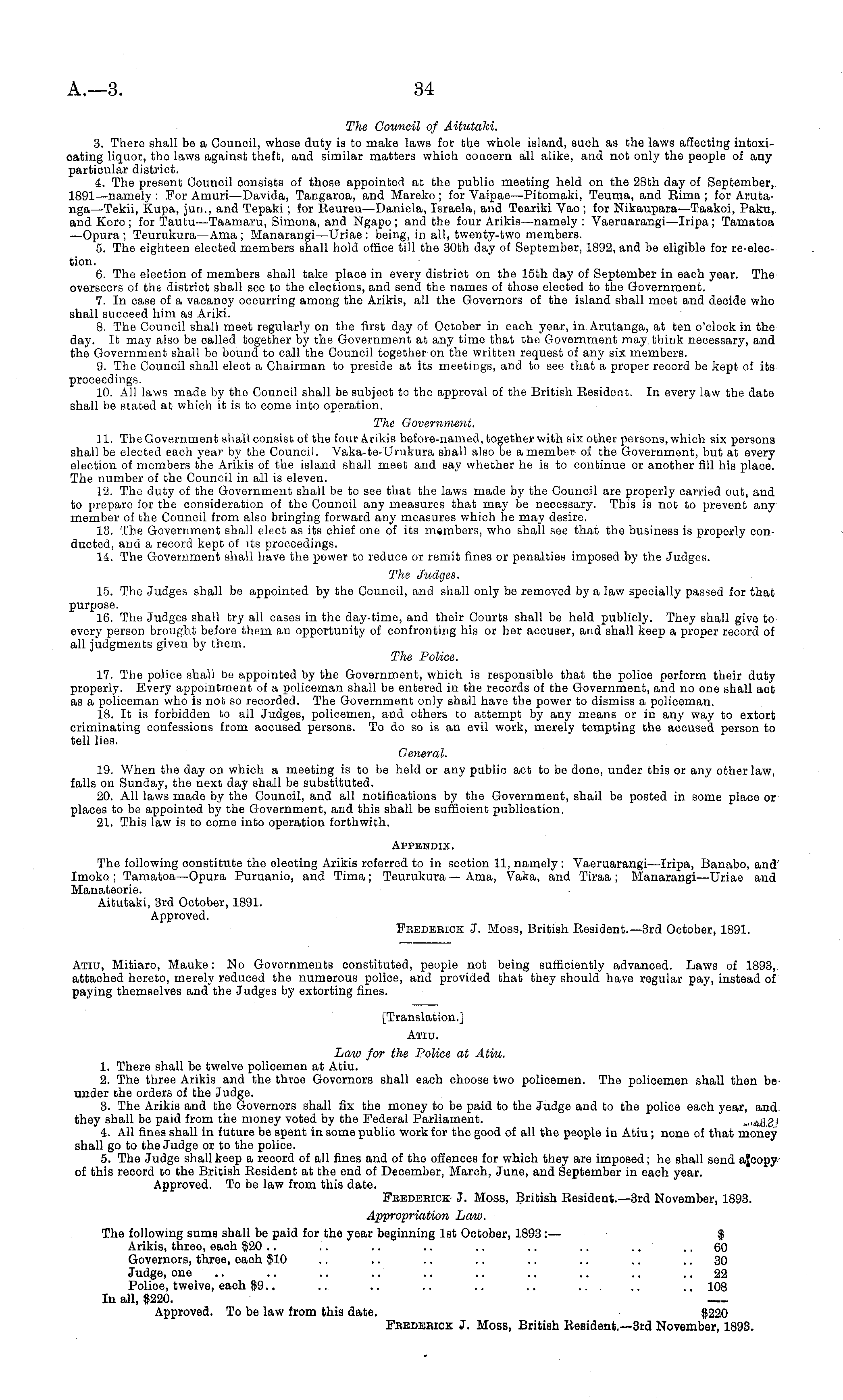 The Council of Aitutahi. 3. There shall be a Council, whose duty is to make laws for the whole island, such as the laws affecting intoxicating liquor, the laws against theft, and similar matters which concern all alike, and not only the people of any particular district. 4. The present Council consists of those appointed at the public meeting held on the 28th day of September, 1891—namely : For Amuri—Davida, Tangaroa, and Mareko ; for Vaipae—Pitomaki, Teuma, and Rima; for Arutanga—Tekii, Kupa, jun., and Tepaki; for Reureu—Daniela, Israela, and Teariki Vao; for Nikaupara—Taakoi, Paku, and Koro ; for Tautu—Taamaru, Simona, and Ngapo ; and the four Arikis—namely : Vaeruarangi—lripa; Tamatoa —Opura ; Teurukura —Ama ; Manarangi—Uriae : being, in all, twenty-two members. 5. The eighteen elected members shall hold office till the 30th day of September, 1892, and be eligible for re-elec-tion. 6. The election of members shall take place in every district on the 15th day of September in each year. The overseers of the district shall see to the elections, and send the names of those elected to the Government. 7. In case of a vacancy occurring among the Arikis, all the Governors of the island shall meet and decide who shall succeed him as Ariki. 8. The Council shall meet regularly on the first day of October in each year, in Arutanga, at ten o'clock in the day. It may also be called together by the Government at any time that the Government may think necessary, and the Government shall be bound to call the Council together on the written request of any six members. 9. The Council shall elect a Chairman to preside at its meetings, and to see that a proper record be kept of its proceedings. 10. All laws made by the Council shall be subject to the approval of the British Resident. In every law the date shall be stated at which it is to come into operation. The Government. 11. The Government shall consist of the four Arikis before-named, together with six other persons, which six persons shall be elected each year by the Council. Vaka-te-Urukura shall also be a member of the Government, but at every election of members the Arikis of the island shall meet and say whether he is to continue or another fill his place. The number of the Council in all is eleven. 12. The duty of the Government shall be to see that the laws made by the Council are properly carried out, and to prepare for the consideration of the Council any measures that may be necessary. This is not to prevent any member of the Council from also bringing forward any measures which he may desire. 13. The Government shall elect as its chief one of its members, who shall see that the business is properly conducted, and a record kept of its proceedings. 14. The Government shall have the power to reduce or remit fines or penalties imposed by the Judges. The Judges. 15. The Judges shall be appointed by the Council, and shall only be removed by a law specially passed for that purpose. 16. The Judges shall try all cases in the day-time, and their Courts shall be held publicly. They shall give to every person brought before them an opportunity of confronting his or her accuser, and shall keep a proper record of all judgments given by them. The Police. 17. The police shall be appointed by the Government, which is responsible that the police perform their duty properly. Every appointment of a policeman shall be entered in the records of the Government, and no one shall act as a policeman who is not so recorded. The Government only shall have the power to dismiss a policeman. 18. It is forbidden to all Judges, policemen, and others to attempt by any means or in any way to extort criminating confessions from accused persons. To do so is an evil work, merely tempting the accused person to tell lies. General. 19. When the day on which a meeting is to be held or any public act to be done, under this or any other law, falls on Sunday, the next day shall be substituted. 20. All laws made by the Council, and all notifications by the Government, shall be posted in some place or places to be appointed by the Government, and this shall be sufficient publication. 21. This law is to come into operation forthwith. Appendix. The following constitute the electing Arikis referred to in section 11, namely : Vaeruarangi—lripa, Banabo, and' Imoko ; Tamatoa —Opura Puruanio, and Tima; Teurukura — Ama, Vaka, and Tiraa ; Manarangi—Uriae and Manateorie. Aitutaki, 3rd October, 1891. Approved. Fbedebick J. Moss, British Resident.—3rd October, 1891.