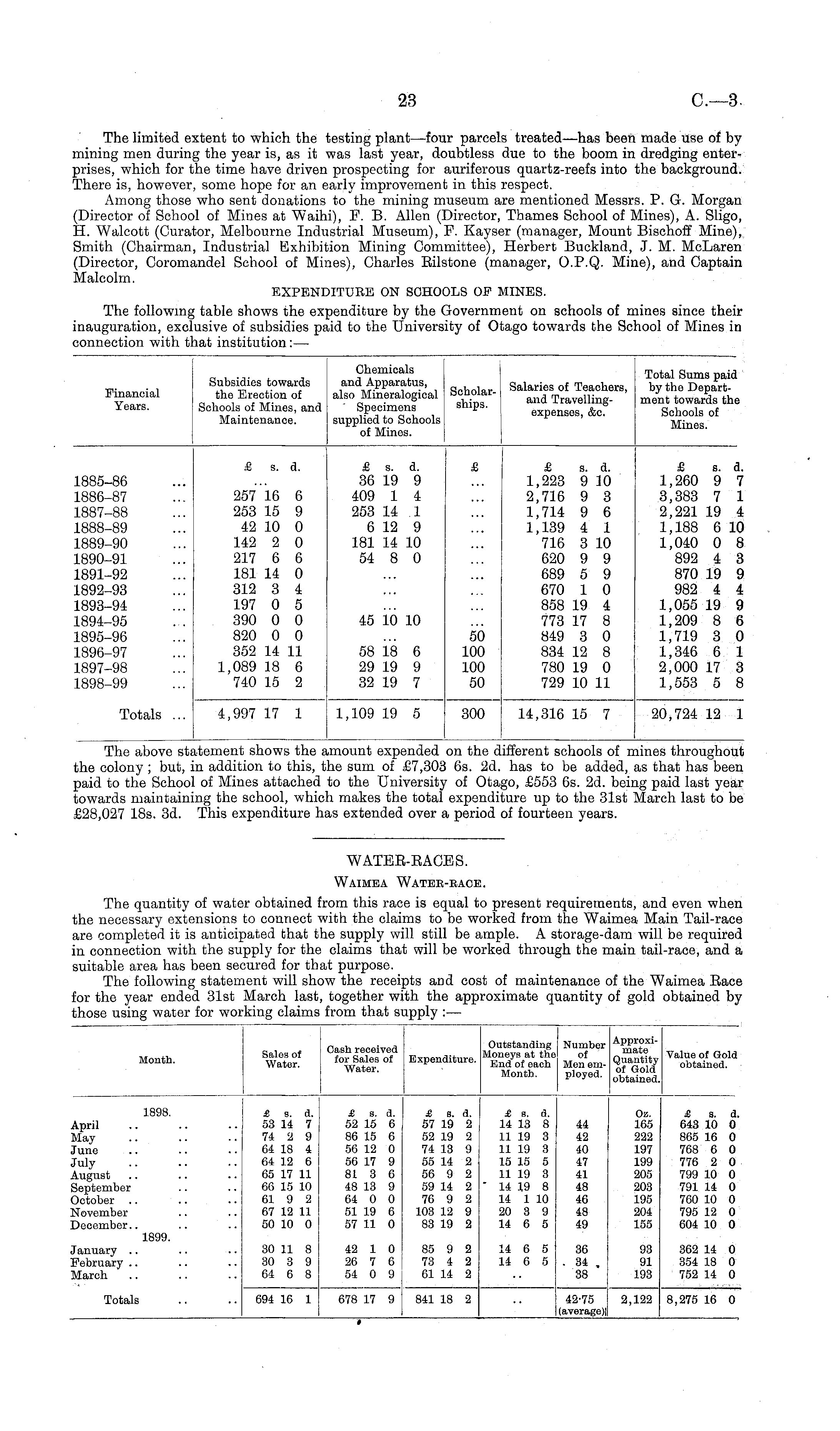 The above statement shows the amount expended on the different schools of mines throughout the colony ; but, in addition to this, the sum of £7,303 6s. 2d. has to be added, as that has been paid to the School of Mines attached to the University of Otago, £553 6s. 2d. being paid last year towards maintaining the school, which makes the total expenditure up to the 31st March last to be £28,027 18s. 3d. This expenditure has extended over a period of fourteen years.