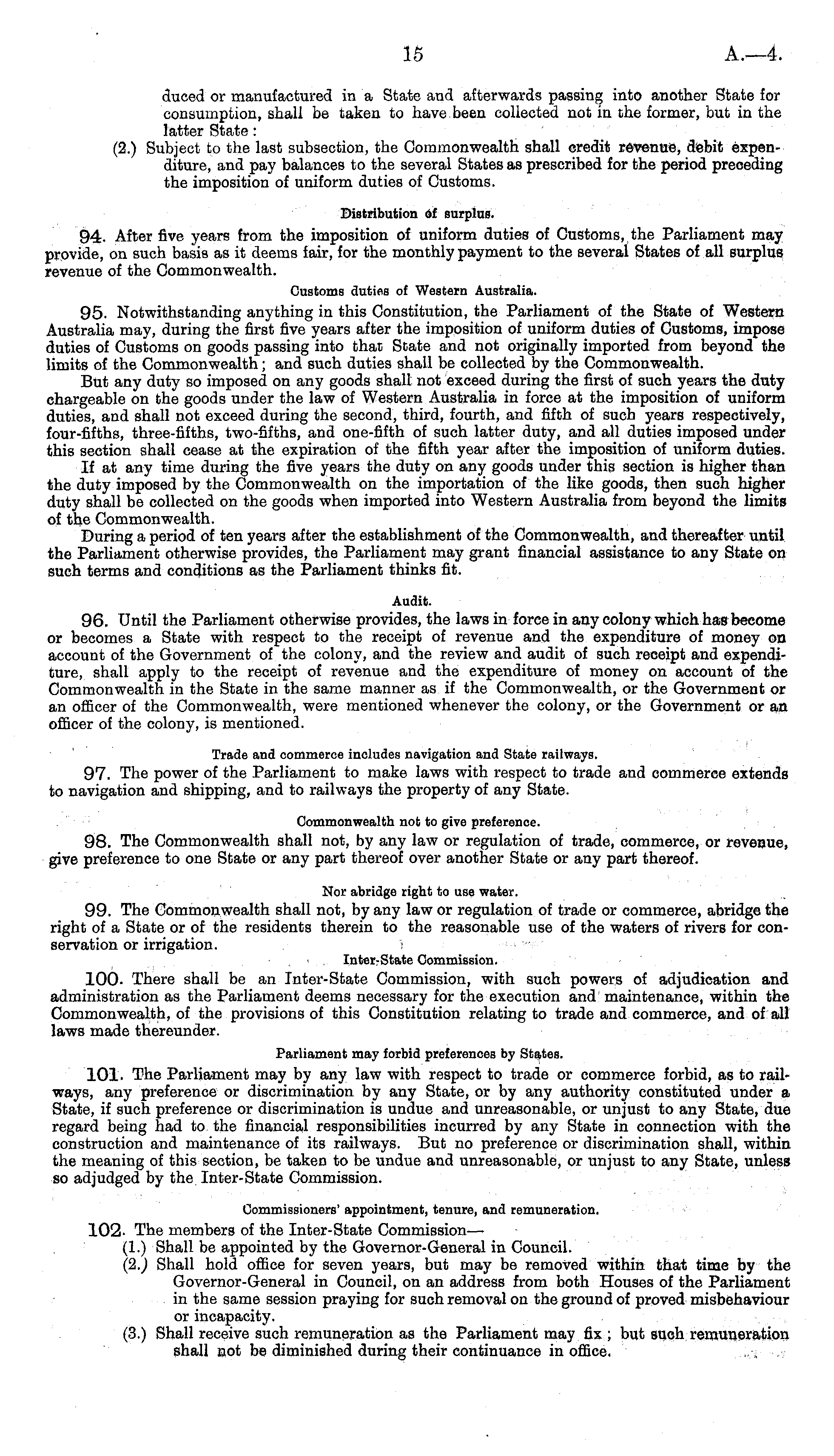 duced or manufactured in a State and afterwards passing into another State for consumption, shall be taken to have been collected not in the former, but in the latter State: (2.) Subject to the last subsection, the Commonwealth shall credit revenue, debit expenditure, and pay balances to the several States as prescribed for the period preceding the imposition of uniform duties of Customs. Distribution of surplus. 94. After five years from the imposition of uniform duties of Customs, the Parliament may provide, on such basis as it deems fair, for the monthly payment to the several States of all surplus revenue of the Commonwealth. Customs duties of Western Australia. 95. Notwithstanding anything in this Constitution, the Parliament of the State of Western Australia may, during the first five years after the imposition of uniform duties of Customs, impose duties of Customs on goods passing into that State and not originally imported from beyond the limits of the Commonwealth; and such duties shall be collected by the Commonwealth. But any duty so imposed on any goods shall not exceed during the first of such years the duty chargeable on the goods under the law of Western Australia in force at the imposition of uniform duties, and shall not exceed during the second, third, fourth, and fifth of such years respectively, four-fifths, three-fifths, two-fifths, and one-fifth of such latter duty, and all duties imposed under this section shall cease at the expiration of the fifth year after the imposition of uniform duties. If at any time during the five years the duty on any goods under this section is higher than the duty imposed by the Commonwealth on the importation of the like goods, then such higher duty shall be collected on the goods when imported into Western Australia from beyond the limits of the Commonwealth. During a period of ten years after the establishment of the Commonwealth, and thereafter until the Parliament otherwise provides, the Parliament may grant financial assistance to any State on such terms and conditions as the Parliament thinks fit. Audit. 96. Until the Parliament otherwise provides, the laws in force in any colony which has become or becomes a State with respect to the receipt of revenue and the expenditure of money on account of the Government of the colony, and the review and audit of such receipt and expenditure, shall apply to the receipt of revenue and the expenditure of money on account of the Commonwealth in the State in the same manner as if the Commonwealth, or the Government or an officer of the Commonwealth, were mentioned whenever the colony, or the Government or an officer of the colony, is mentioned. Trade and commerce includes navigation and State railways. 97. The power of the Parliament to make laws with respect to trade and commerce extends to navigation and shipping, and to railways the property of any State. Commonwealth not to give preference. 98. The Commonwealth shall not, by any law or regulation of trade, commerce, or revenue, give preference to one State or any part thereof over another State or any part thereof. Nor abridge right to use water. 99. The Commonwealth shall not, by any law or regulation of trade or commerce, abridge the right of a State or of the residents therein to the reasonable use of the waters of rivers for conservation or irrigation. ! ■ . Inter-State Commission. 100- There shall be an Inter-State Commission, with such powers of adjudication and administration as the Parliament deems necessary for the execution and maintenance, within the Commonwealth, of the provisions of this Constitution relating to trade and commerce, and of all laws made thereunder. Parliament may forbid preferences by States. 101. The Parliament may by any law with respect to trade or commerce forbid, as to railways, any preference or discrimination by any State, or by any authority constituted under a State, if such preference or discrimination is undue and unreasonable, or unjust to any State, due regard being had to the financial responsibilities incurred by any State in connection with the construction and maintenance of its railways. But no preference or discrimination shall, within the meaning of this section, be taken to be undue and unreasonable, or unjust to any State, unless so adjudged by the Inter-State Commission. Commissioners' appointment, tenure, and remuneration. 102. The members of the Inter-State Commission— (1.) Shall be appointed by the Governor-General in Council. (2. ) Shall hold office for seven years, but may be removed within that time by the Governor-General in Council, on an address from both Houses of the Parliament in the same session praying for such removal on the ground of proved misbehaviour or incapacity. (3.) Shall receive such remuneration as the Parliament may fix ; but such remuneration shall not be diminished during their continuance in office.