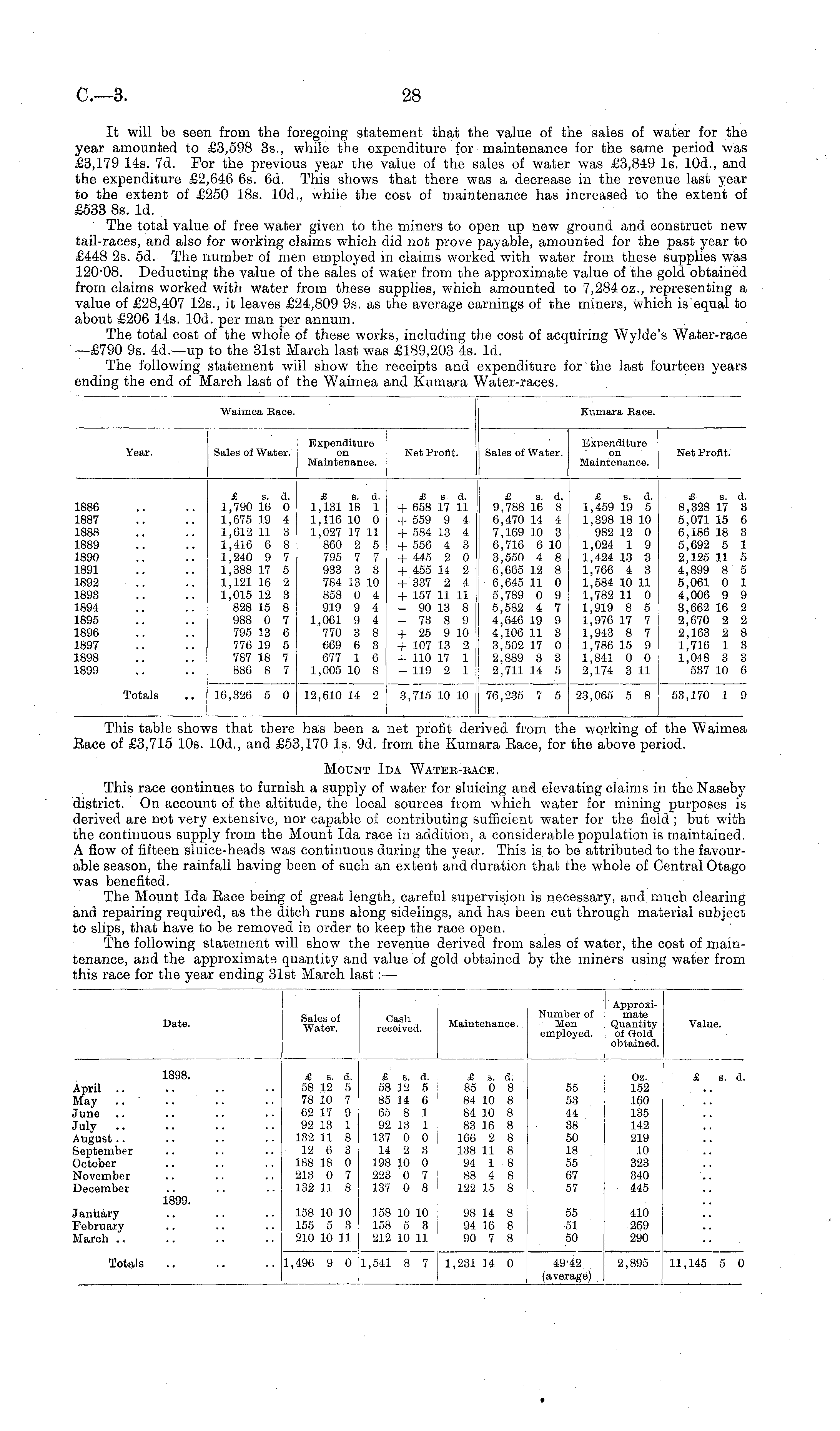 It will be seen from the foregoing statement that the value of the sales of water for the year amounted to £3,598 35., while the expenditure for maintenance for the same period was £3,179 14s. 7d. For the previous year the value of the sales of water was £3,849 Is. 10d., and the expenditure £2,646 6s. 6d. This shows that there was a decrease in the revenue last year to the extent of £250 18s. 10d,, while the cost of maintenance has increased to the extent of £533 Bs. Id. The total value of free water given to the miners to open up new ground and construct new tail-races, and also for working claims which did not prove payable, amounted for the past year to £448 2s. sd. The number of men employed in claims worked with water from these supplies was 12008. Deducting the value of the sales of water from the approximate value of the gold obtained from claims worked, with water from these supplies, which amounted to 7,284 oz., representing a value of £28,407 125., it leaves £24,809 9s. as the average earnings of the miners, which is equal to about £206 14s. 10d. per man per annum. The total cost of the whole of these works, including the cost of acquiring Wylde's Water-race —£790 9s. 4d.—up to the 31st March last was £189,203 4s. Id. The following statement will show the receipts and expenditure for the last fourteen years ending the end of March last of the Waimea and Kumara Water-races.