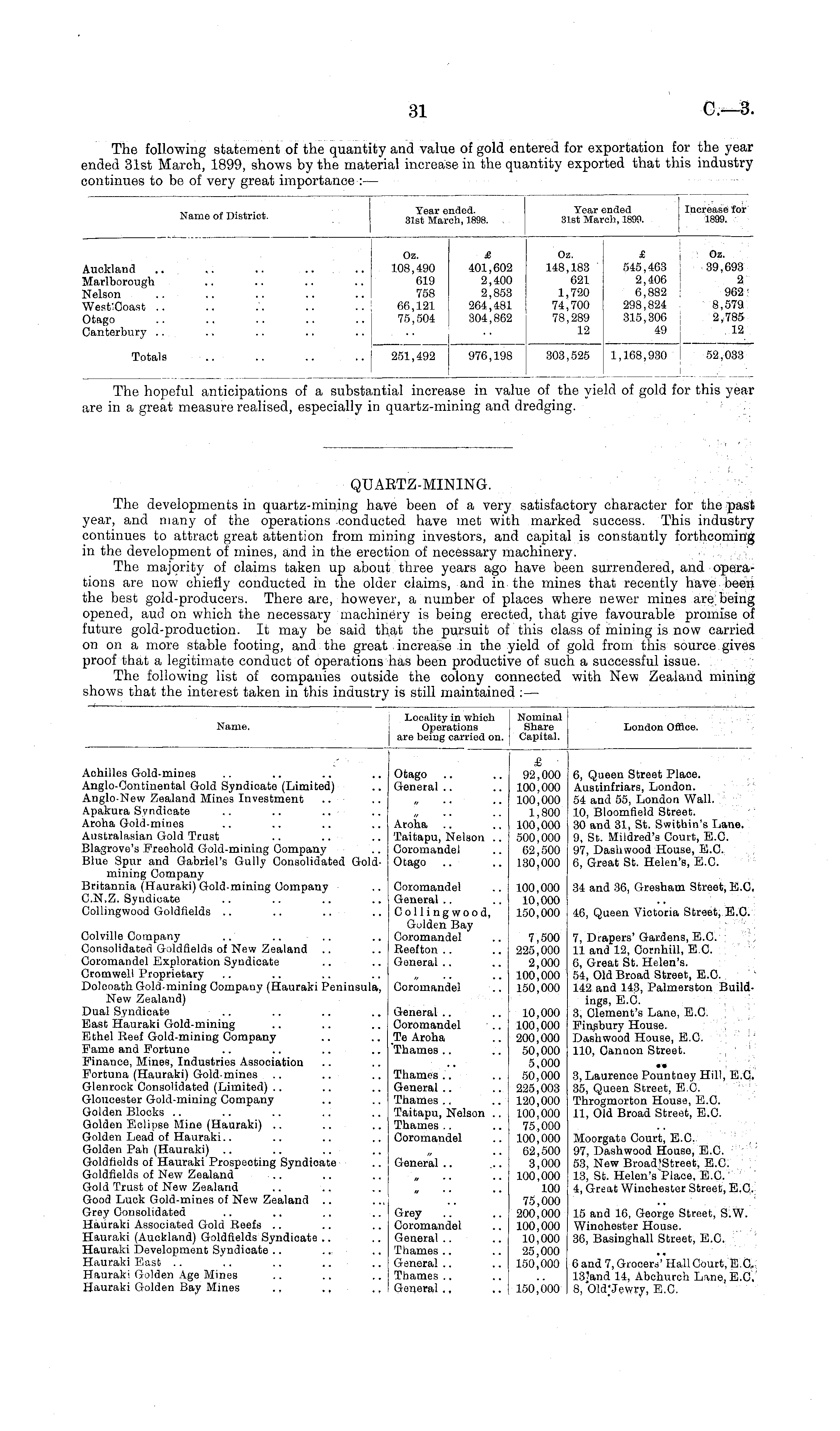 QUAETZ-MINING. The developments in quartz-mining have been of a very satisfactory character for the past year, and many of the operations conducted have met with marked success. This industry continues to attract great attention from mining investors, and capital is constantly forthcoming in the development of mines, and in the erection of necessary machinery. The majority of claims taken up about three years ago have been surrendered, and operations are now chiefly conducted in the older claims, and in the mines that recently have been the best gold-producers. There are, however, a number of places where newer mines are being opened, aud on which the necessary machinery is being erected, that give favourable promise of future gold-production. It may be said that the pursuit of this class of mining is now carried on on a more stable footing, and the great increase in the yield of gold from this source gives proof that a legitimate conduct of operations has been productive of such a successful issue. The following list of companies outside the colony connected with New Zealand mining shows that the interest taken in this industry is still maintained : —