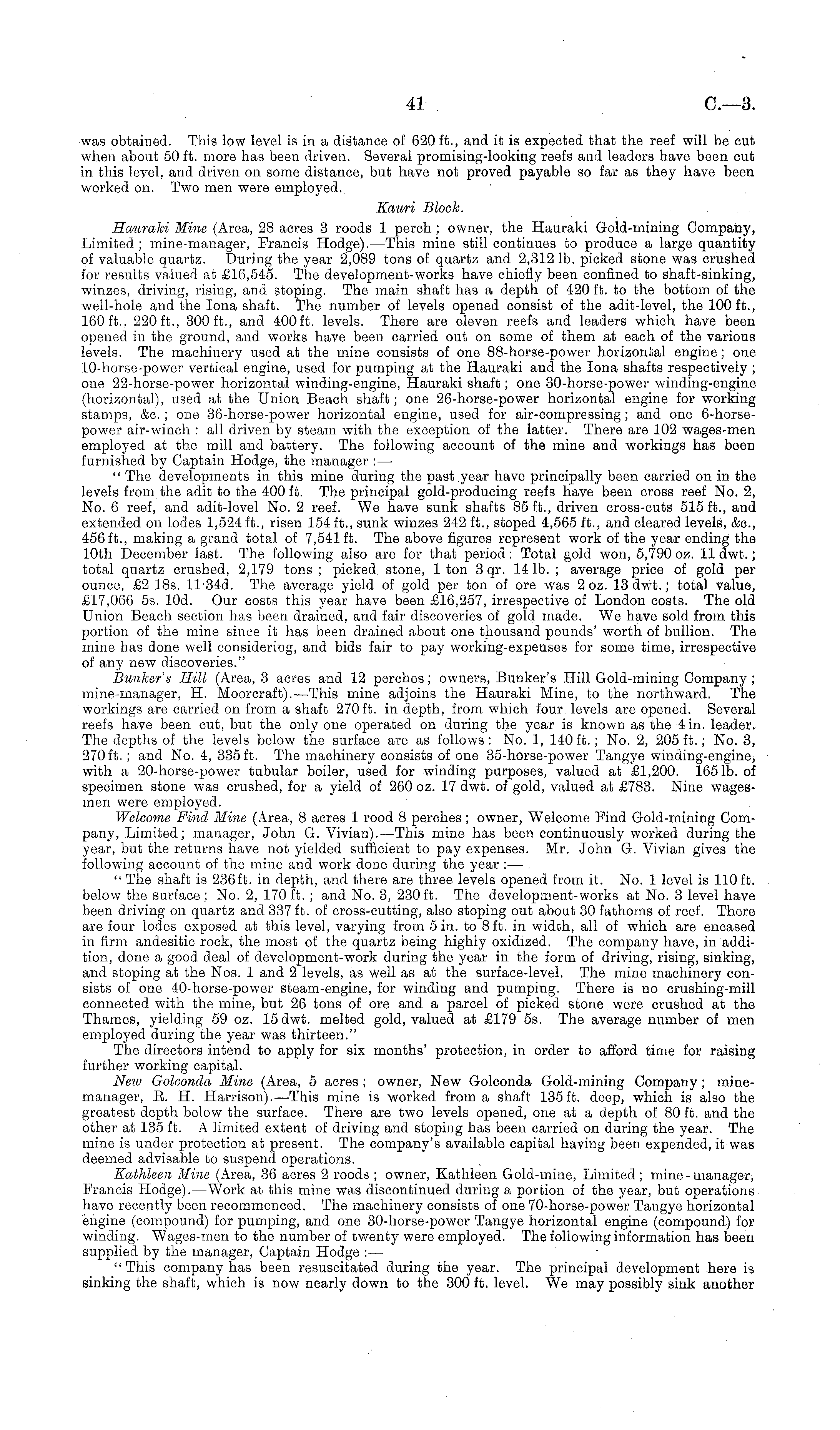 was obtained. This low level is in a distance of 620 ft., and it is expected that the reef will be cut when about 50 ft. more has been driven. Several promising-looking reefs aud leaders have been cut in this level, and driven on some distance, but have not proved payable so far as they have been worked on. Two men were employed. Kauri Block. Hauraki Mine (Area, 28 acres 3 roods 1 perch ; owner, the Hauraki Gold-mining Company, Limited ; mine-manager, Francis Hodge).—This mine still continues to produce a large quantity of valuable quartz. During the year 2,089 tons of quartz and 2,312 lb. picked stone was crushed for results valued at £16,545. The development-works have chiefly been confined to shaft-sinking, winzes, driving, rising, and stoping. The main shaft has a depth of 420 ft. to the bottom of the well-hole and the lona shaft. The number of levels opened consist of the adit-level, the 100 ft., 160 ft.. 220 ft., 300 ft., and 400 ft. levels. There are eleven reefs and leaders which have been opened in the ground, and works have been carried out on some of them at each of the various levels. The machinery used at the mine consists of one 88-horse-power horizontal engine; one 10-horse-power vertical engine, used for pumping at the Hauraki and the lona shafts respectively ; one 22-horse-power horizontal winding-engine, Hauraki shaft ; one 30-horse-power winding-engine (horizontal), used at the Union Beach shaft; one 26-horse-power horizontal engine for working stamps, &c. ; one 36-horse-power horizontal engine, used for air-compressing; and one 6-horse-power air-winch : all driven by steam with the exception of the latter. There are 102 wages-men employed at the mill and battery. The following account of the mine and workings has been furnished by Captain Hodge, the manager : — " The developments in this mine during the past year have principally been carried on in the levels from the adit to the 400 ft. The principal gold-producing reefs have been cross reef No. 2, No. 6 reef, and adit-level No. 2 reef. We have sunk shafts 85 ft., driven cross-cuts 515 ft., and extended on lodes 1,524 ft., risen 154 ft., sunk winzes 242 ft., stoped 4,565 ft., and cleared levels, &c, 456 ft., making a grand total of 7,541 ft. The above figures represent work of the year ending the 10th December last. The following also are for that period: Total gold won, 5,790 oz. 11 dwt.; total quartz crushed, 2,179 tons ; picked stone, 1 ton 3 qr. 14 lb. ; average price of gold per ounce, £2 18s. 1134 d. The average yield of gold per ton of ore was 2 oz. 13 dwt.; total value, £17,066 ss. 10d. Our costs this year have been £16,257, irrespective of London costs. The old Union Beach section has been drained, and fair discoveries of gold made. We have sold from this portion of the mine since it has been drained about one thousand pounds' worth of bullion. The mine has done well considering, and bids fair to pay working-expenses for some time, irrespective of any new discoveries." Bunker's Hill (Area, 3 acres and 12 perches; owners, Bunker's Hill Gold-mining Company ; mine-manager, H. Moorcraft). —This mine adjoins the Hauraki Mine, to the northward. The workings are carried on from a shaft 270 ft. in depth, from which four levels are opened. Several reefs have been cut, but the only one operated on during the year is known as the 4 in. leader. The depths of the levels below the surface are as follows: No. 1, 140 ft. ; No. 2, 205 ft. ; No. 3, 270 ft.; and No. 4, 335 ft. The machinery consists of one 35-horse-power Tangye winding-engine, with a 20-horse-power tubular boiler, used for winding purposes, valued at £1,200. 165 lb. of specimen stone was crushed, for a yield of 260 oz. 17 dwt. of gold, valued at £783. Nine wagesmen were employed. Welcome Find Mine (Area, 8 acres 1 rood 8 perches; owner, Welcome Find Gold-mining Company, Limited; manager, John G. Vivian). —This mine has been continuously worked during the year, but the returns have not yielded sufficient to pay expenses. Mr. John G. Vivian gives the following account of the mine and work done during the year : — . "The shaft is 236 ft. in depth, and there are three levels opened from it. No. 1 level is 110 ft. below the surface ; No. 2, 170 ft. ; and No. 3, 230 ft. The development-works at No. 3 level have been driving on quartz and 337 ft. of cross-cutting, also stoping out about 30 fathoms of reef. There are four lodes exposed at this level, varying from 5 in. to 8 ft. in width, all of which are encased in firm andesitic rock, the most of the quartz being highly oxidized. The company have, in addition, done a good deal of development-work during the year in the form of driving, rising, sinking, and stoping at the Nos. 1 and 2 levels, as well as at the surface-level. The mine machinery consists of one 40-horse-power steam-engine, for winding and pumping. There is no crushing-mill connected with the mine, but 26 tons of ore and a parcel of picked stone were crushed at the Thames, yielding 59 oz. 15 dwt. melted gold, valued at £179 ss. The average number of men employed during the year was thirteen." The directors intend to apply for six months' protection, in order to afford time for raising further working capital. Neiv Golconda Mine (Area, 5 acres ; owner, New Golconda Gold-mining Company ; minemanager, R. H. Harrison). —This mine is worked from a shaft 135 ft. deep, which is also the greatest depth below the surface. There are two levels opened, one at a depth of 80 ft. and the other at 135 ft. A limited extent of driving and stoping has been carried on during the year. The mine is under protection at present. The company's available capital having been expended, it was deemed advisable to suspend operations. Kathleen Mine (Area, 36 acres 2 roods ; owner, Kathleen Gold-mine, Limited; mine - manager, Francis Hodge).—Work at this mine was discontinued during a portion of the year, but operations have recently been recommenced. The machiner