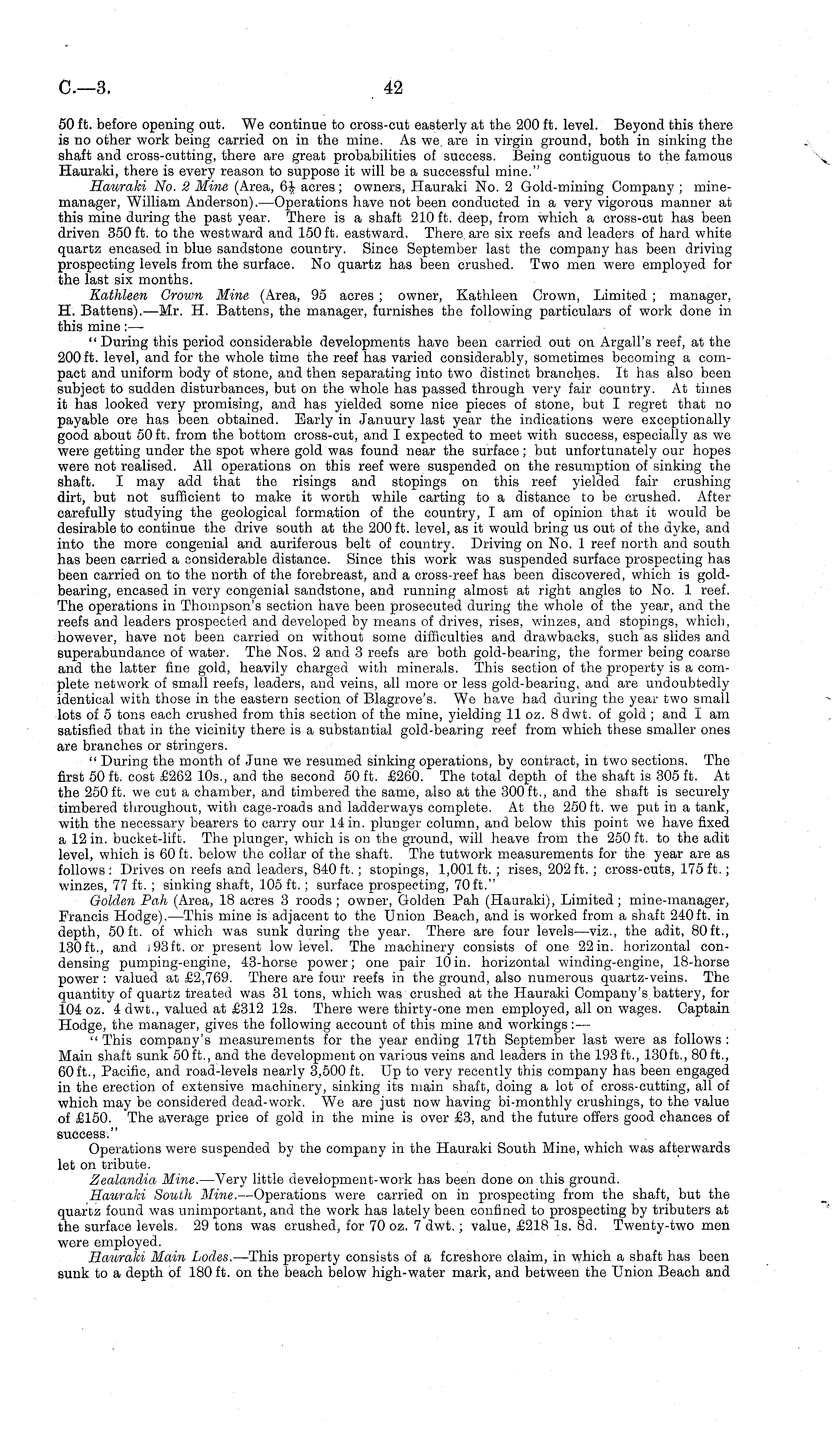 50 ft. before opening out. We continue to cross-cut easterly at the 200 ft. level. Beyond this there is no other work being carried on in the mine. As we. are in virgin ground, both in sinking the shaft and cross-cutting, there are great probabilities of success. Being contiguous to the famous Hauraki, there is every reason to suppose it will be a successful mine." Hauraki No. 2 Mine (Area, acres; owners, Hauraki No. 2 Gold-mining Company ; minemanager, William Anderson). —Operations have not been conducted in a very vigorous manner at this mine during the past year. There is a shaft 210 ft. deep, from which a cross-cut has been driven 350 ft. to the westward and 150 ft. eastward. There are six reefs and leaders of hard white quartz encased in blue sandstone country. Since September last the company has been driving prospecting levels from the surface. No quartz has been crushed. Two men were employed for the last six months. Kathleen Grown Mine (Area, 95 acres ; owner, Kathleen Crown, Limited ; manager, H. Battens). —Mr. H. Battens, the manager, furnishes the following particulars of work done in this mine:— " During this period considerable developments have been carried out on Argall's reef, at the 200 ft. level, and for the whole time the reef has varied considerably, sometimes becoming a compact and uniform body of stone, and then separating into two distinct branches. It has also been subject to sudden disturbances, but on the whole has passed through very fair country. At times it has looked very promising, and has yielded some nice pieces of stone, but I regret that no payable ore has been obtained. Early in Januury last year the indications were exceptionally good about 50 ft. from the bottom cross-cut, and I expected to meet with success, especially as we were getting under the spot where gold was found near the surface; but unfortunately our hopes were not realised. All operations on this reef were suspended on the resumption of sinking the shaft. I may add that the risings and stopings on this reef yielded fair crushing dirt, but not sufficient to make it worth while carting to a distance to be crushed. After carefully studying the geological formation of the country, I am of opinion that it would be desirable to continue the drive south at the 200 ft. level, as it would bring us out of the dyke, and into the more congenial and auriferous belt of country. Driving on No. 1 reef north and south has been carried a considerable distance. Since this work was suspended surface prospecting has been carried on to the north of the forebreast, and a cross-reef has been discovered, which is goldbearing, encased in very congenial sandstone, and running almost at right angles to No. 1 reef. The operations in Thompson's section have been prosecuted during the whole of the year, and the reefs and leaders prospected and developed by means of drives, rises, winzes, and stopings, which, however, have not been carried on without some difficulties and drawbacks, such as slides and superabundance of water. The Nos. 2 and 3 reefs are both gold-bearing, the former being coarse and the latter fine gold, heavily charged with minerals. This section of the property is a complete network of small reefs, leaders, and veins, all more or less gold-bearing, and are undoubtedly identical with those in the eastern section of Blagrove's. We have had during the year two small lots of 5 tons each crushed from this section of the mine, yielding 11 oz. 8 dwt. of gold ; and I am satisfied that in the vicinity there is a substantial gold-bearing reef from which these smaller ones are branches or stringers. " During the month of June we resumed sinking operations, by contract, in two sections. The first 50 ft. cost £262 10s., and the second 50 ft. £260. The total depth of the shaft is 305 ft. At the 250 ft. we cut a chamber, and timbered the same, also at the 300 ft., and the shaft is securely timbered throughout, with cage-roads and ladderways complete. At the 250 ft. we put in a tank, with the necessary bearers to carry our 14 in. plunger column, and below this point we have fixed al2 in. bucket-lift. The plunger, which is on the ground, will heave from the 250 ft. to the adit level, which is 60 ft. below the collar of the shaft. The tutwork measurements for the year are as follows : Drives on reefs and leaders, 840 ft. ; stopings, 1,001 ft. ; rises, 202 ft. ; cross-cuts, 175 ft.; winzes, 77 ft. ; sinking shaft, 105 ft.; surface prospecting, 70 ft." Golden Pah (Area, 18 acres 3 roods; owner, Golden Pah (Hauraki), Limited; mine-manager, Francis Hodge). —This mine is adjacent to the Union Beach, and is worked from a shaft 240 ft. in depth, 50ft. of which was sunk during the year. There are four levels —viz., the adit, 80ft., 130 ft., and 193 ft. or present low level. The machinery consists of one 22 in. horizontal condensing pumping-engine, 43-horse power; one pair 10in. horizontal winding-engine, 18-horse power : valued at £2,769. There are four reefs in the ground, also numerous quartz-veins. The quantity of quartz treated was 31 tons, which was crushed at the Hauraki Company's battery, for 104 oz. 4 dwt., valued at £312 12s. There were thirty-one men employed, all on wages. Captain Hodge, the manager, gives the following account of this mine and workings : — " This company's measurements for the year ending 17th September last were as follows : Main shaft sunk 50 ft., and the development on various veins and leaders in the 193 ft., 130 ft., 80 ft., 60 ft., Pacific, and road-levels nearly 3,500 ft. Up to very recently this company has been engaged in the erection of extensive machinery, sinking its main shaft, doing a lot of cross-cutting, all of which may be considered dead-work. We are just now having bi-monthly crushings, to the value of £150. The average price of gold in the mine is over £3, and the future offers good chances of success." Operations were suspended by the company in the Hauraki