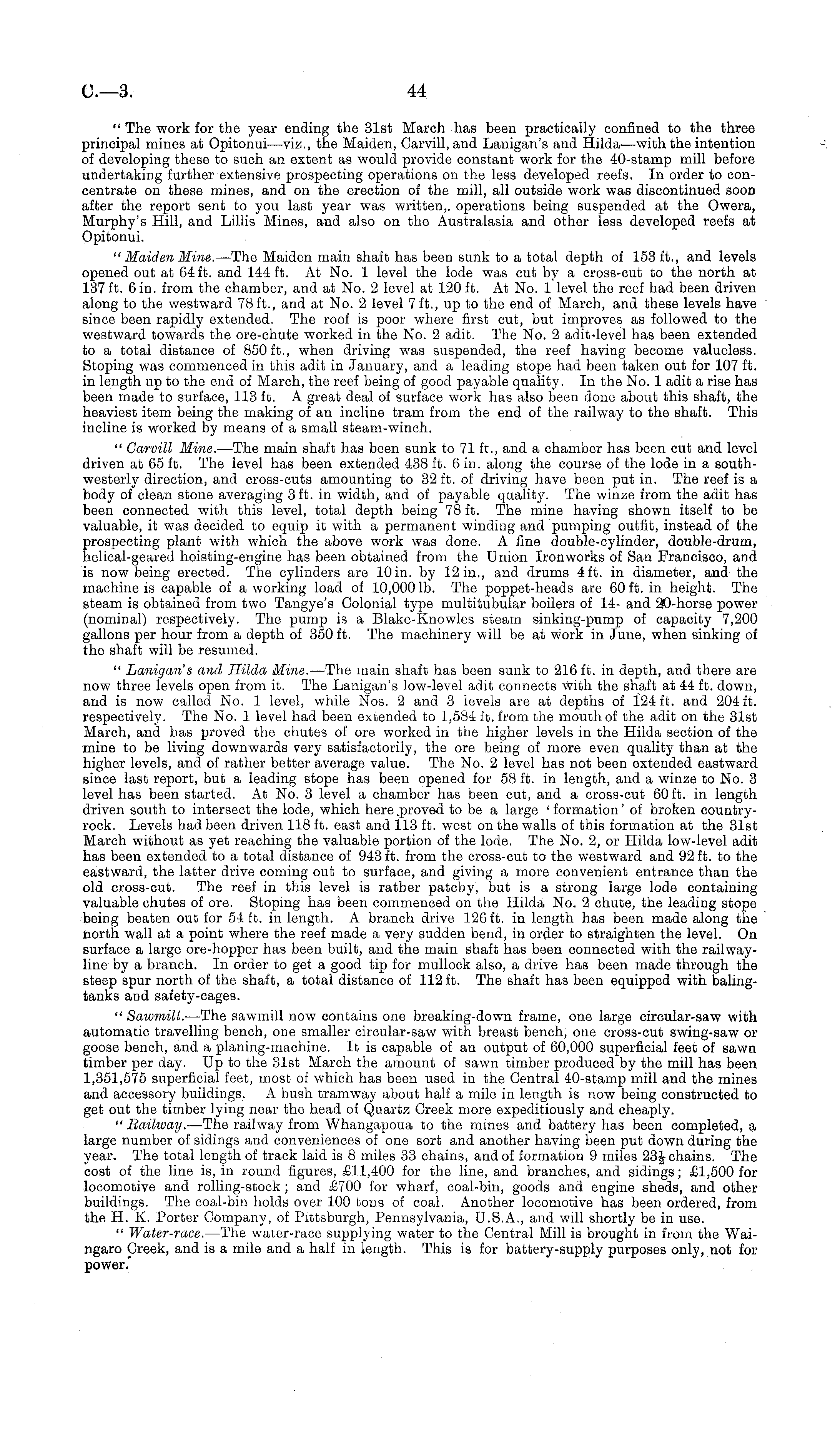 " The work for the year ending the 31st March has been practically confined to the three principal mines at Opitonui—viz., the Maiden, Carvill, and Lanigan's and Hilda-—with the intention of developing these to such an extent as would provide constant work for the 40-stamp mill before undertaking further extensive prospecting operations on the less developed reefs. In order to concentrate on these mines, and on the erection of the mill, all outside work was discontinued soon after the report sent to you last year was written,, operations being suspended at the Owera, Murphy's Hill, and Lillis Mines, and also on the Australasia and other less developed reefs at Opitonui. " Maiden Mine. —The Maiden main shaft has been sunk to a total depth of 153 ft., and levels opened out at 64 ft. and 144 ft. At No. 1 level the lode was cut by a cross-cut to the north at 137 ft. 6 in. from the chamber, and at No. 2 level at 120 ft. At No. 1 level the reef had been driven along to the westward 78 ft., and at No. 2 level 7 ft., up to the end of March, and these levels have since been rapidly extended. The roof is poor where first cut, but improves as followed to the westward towards the ore-chute worked in the No. 2 adit. The No. 2 adit-level has been extended to a total distance of 850 ft., when driving was suspended, the reef having become valueless. Stoping was commenced in this adit in January, and a leading stope had been taken out for 107 ft. in length up to the end of March, the reef being of good payable quality, In the No. 1 adit a rise has been made to surface, 113 ft. A great deal of surface work has also been done about this shaft, the heaviest item being the making of an incline tram from the end of the railway to the shaft. This incline is worked by means of a small steam-winch. " Garvill Mine. —The main shaft has been sunk to 71 ft., and a chamber has been cut and level driven at 65 ft. The level has been extended 438 ft. 6 in. along the course of the lode in a southwesterly direction, and cross-cuts amounting to 32 ft. of driving have been put in. The reef is a body of clean stone averaging 3 ft. in width, and of payable quality. The winze from the adit has been connected with this level, total depth being 78 ft. The mine having shown itself to be valuable, it was decided to equip it with a permanent winding and pumping outfit, instead of the prospecting plant with which the above work was done. A fine double-cylinder, double-drum, helical-geared hoisting-engine has been obtained from the Union Ironworks of San Francisco, and is now being erected. The cylinders are 10 in. by 12 in., and drums 4 ft. in diameter, and the machine is capable of a working load of 10,0001b. The poppet-heads are 60 ft. in height. The steam is obtained from two Tangye's Colonial type multitubular boilers of 14- and 90-horse power (nominal) respectively. The pump is a Blake-Knowles steam sinking-pump of capacity 7,200 gallons per hour from a depth of 350 ft. The machinery will be at work in June, when sinking of the shaft will be resumed. " Lanigan's and Hilda Mine. —The main shaft has been sunk to 216 ft. in depth, and there are now three levels open from it. The Lanigan's low-level adit connects with the shaft at 44 ft. down, and is now called No. 1 level, while Nos. 2 and 3 levels are at depths of 124 ft. and 204 ft. respectively. The No. 1 level had been extended to 1,584 ft. from the mouth of the adit on the 31st March, and has proved the chutes of ore worked in the higher levels in the Hilda section of the mine to be living downwards very satisfactorily, the ore being of more even quality than at the higher levels, and of rather better average value. The No. 2 level has not been extended eastward since last report, but a leading stope has been opened for 58 ft. in length, and a winze to No. 3 level has been started. At No. 3 level a chamber has been cut, and a cross-cut 60 ft. in length driven south to intersect the lode, which here .proved to be a large ' formation' of broken countryrock. Levels had been driven 118 ft. east and 113 ft. west on the walls of this formation at the 31st March without as yet reaching the valuable portion of the lode. The No. 2, or Hilda low-level adit has been extended to a total distance of 943 ft. from the cross-cut to the westward and 92 ft. to the eastward, the latter drive coming out to surface, and giving a more convenient entrance than the old cross-cut. The reef in this level is rather patchy, but is a strong large lode containing valuable chutes of ore. Stoping has been commenced on the Hilda No. 2 chute, the leading stope being beaten out for 54 ft. in length. A branch drive 126 ft. in length has been made along the north wall at a point where the reef made a very sudden bend, in order to straighten the level. On surface a large ore-hopper has been built, and the main shaft has been connected with the railwayline by a branch. In order to get a good tip for mullock also, a drive has been made through the steep spur north of the shaft, a total distance of 112 ft. The shaft has been equipped with balingtanks and safety-cages. " Sawmill. —The sawmill now contains one breaking-down frame, one large circular-saw with automatic travelling bench, one smaller circular-saw with breast bench, one cross-cut swing-saw or goose bench, and a planing-machine. It is capable of an output of 60,000 superficial feet of sawn timber per day. Up to the 31st March the amount of sawn timber produced by the mill has been 1,351,575 superficial feet, most of which has been used in the Central 40-stamp mill and the mines and accessory buildings. A bush tramway about half a mile in length is now being constructed to get out the timber lying near the head of Quartz Creek more expeditiously and cheaply. "Railway. —The railway from Whangapoua to the mines and battery has been completed, a large number of sidings and conveniences of one sort and another having been put down during the year.