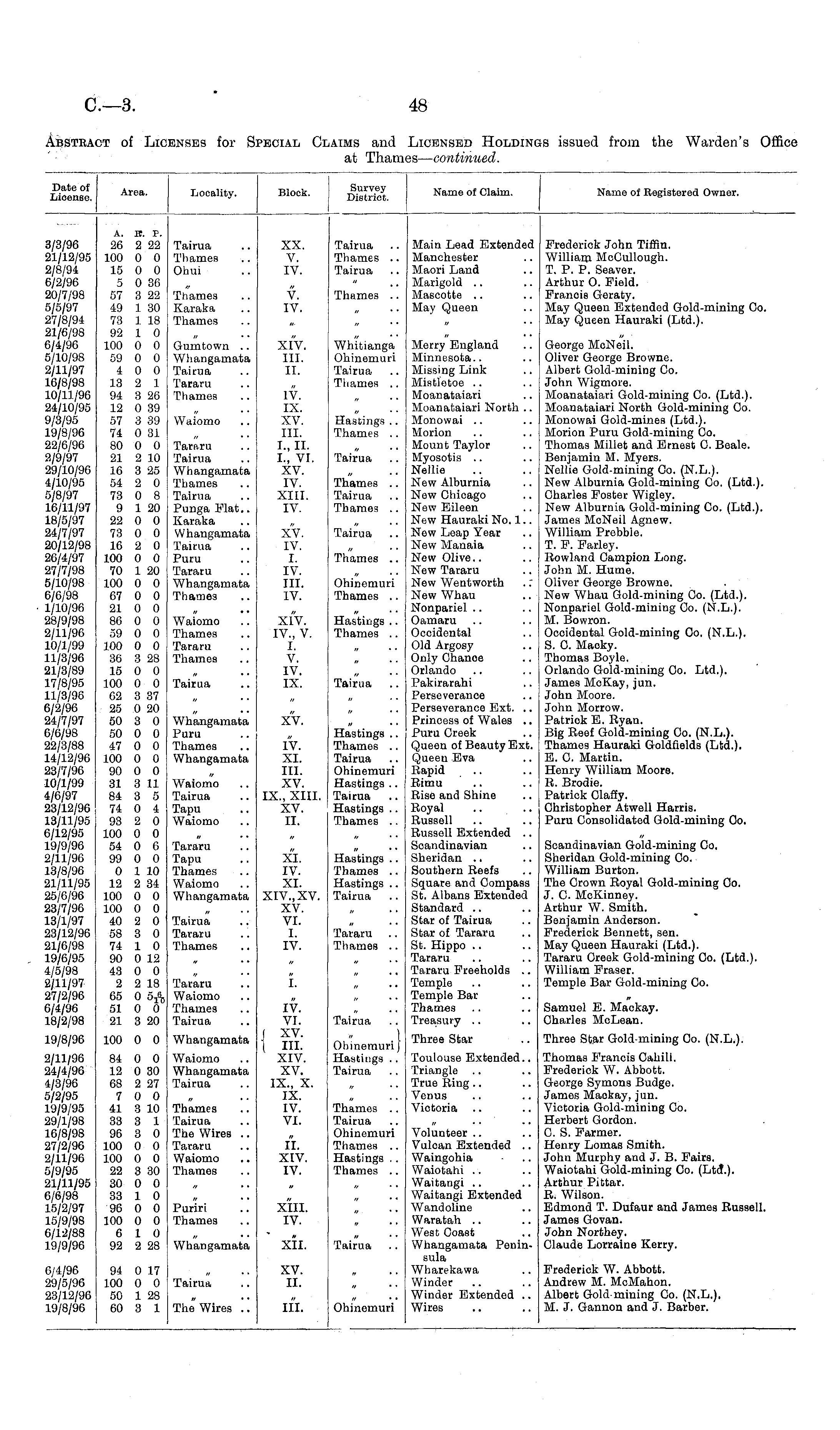 Date of License. Area. Locality. Block. Survey District. Name of Claim. Name of Registered Owner. 3/3/96 21/12/95 2/8/94 6/2/96 20/7/98 5/5/97 27/8/94 21/6/98 6/4/96 5/10/98 2/11/97 16/8/98 10/11/96 24/10/95 9/3/95 19/8/96 22/6/96 2/9/97 29/10/96 4/10/95 5/8/97 16/11/97 18/5/97 24/7/97 20/12/98 26/4/97 27/7/98 5/10/98 6/6/98 1/10/96 28/9/98 2/11/96 10/1/99 11/3/96 21/3/89 17/8/95 11/3/96 6/2/96 24/7/97 6/6/98 22/3/88 14/12/96 23/7/96 10/1/99 4/6/97 23/12/96 13/11/95 6/12/95 19/9/96 2/11/96 13/8/96 21/11/95 25/6/96 23/7/96 13/1/97 23/12/96 21/6/98 19/6/95 4/5/98 2/11/97 27/2/96 6/4/96 18/2/98 19/8/96 A. B. P. 26 2 22 100 0 0 15 0 0 5 0 36 57 3 22 49 1 30 73 1 18 92 1 0 100 0 0 59 0 0 4 0 0 13 2 1 94 3 26 12 0 39 57 3 39 74 0 31 80 0 0 21 2 10 16 3 25 54 2 0 73 0 8 9 1 20 22 0 0 73 0 0 16 2 0 100 0 0 70 1 20 100 0 0 67 0 0 21 0 0 86 0 0 59 0 0 100 0 0 36 3 28 15 0 0 100 0 0 62 3 37 25 0 20 50 3 0 50 0 0 47 0 0 100 0 0 90 0 0 31 3 11 84 3 5 74 0 4 93 2 0 100 0 0 54 0 6 99 0 0 0 1 10 12 2 34 100 0 0 100 0 0 40 2 0 58 3 0 74 1 0 90 0 12 43 0 0 2 2 18 65 0 5-ft 51 0 0 21 3 20 Tairua Thames Ohui Thames Karaka Thames Gumtown .. Whangamata Tairua Tararu Thames Waiomo Tararu Tairua Whangamata Thames Tairua Punga Flat.. Karaka Whangamata Tairua Puru Tararu Whangamata Thames Waiomo Thames Tararu Thames XX. V. IV. V. IV. XIV. III. II. IV. IX. XV. III. I., II. I., VI. XV. IV. XIII. IV. XV. IV. I. IV. III. IV. XIV. IV., V. I. V. IV. IX. Tairua Thames .. Tairua Thames .. Whitianga Ohinemuri Tairua Thames .. Hastings .. Thames .. Tairua Thames .. Tairua Thames .. Tairua Thames .. Ohinemuri Thames .. Hastings .. Thames .. Main Lead Extended Manchester Maori Land Marigold Mascotte May Queen Merry England Minnesota.. Missing Link Mistletoe Moanataiari Moanataiari North .. Monowai Morion Mount Taylor Myosotis Nellie New Alburnia New Chicago New Eileen New Hauraki No. 1.. New Leap Year New Manaia New Olive.. New Tararu New Wentworth New Whau Nonpariel Oamaru Occidental Old Argosy Only Chanoe Orlando Pakirarahi Perseverance Perseverance Ext. .. Princess of Wales .. Puru Creek Queen of Beauty Ext. Queen Eva Rapid Rimu Rise and Shine Royal Russell Russell Extended .. Scandinavian Sheridan Southern Reefs Square and Compass St. Albans Extended Standard Star of Tairua Star of Tararu St. Hippo Tararu Tararu Freeholds .. Temple Temple Bar Thames Treasury Frederick John Tiffin. William McCullough. T. P. P. Seaver. Arthur 0. Field. Francis Geraty. May Queen Extended Gold-mining Co. May Queen Hauraki (Ltd.). George McNeil. Oliver George Browne. Albert Gold-mining Co. John Wigmore. Moanataiari Gold-mining Co. (Ltd.). Moanataiari North Gold-mining Co. Monowai Gold-mines (Ltd.). Morion Puru Gold-mining Co. Thomas Millet and Ernest C. Beale. Benjamin M. Myers. Nellie Gold-mining Co. (N.L.). New Alburnia Gold-mining Co. (Ltd.). Charles Foster Wigley. New Alburnia Gold-mining Co. (Ltd.). James McNeil Agnew. William Prebble. T. F. Farley. Rowland Campion Long. John M. Hume. Oliver George Browne. New Whau Gold-mining Co. (Ltd.). Nonpariel Gold-mining Co. (N.L.). M. Bowron. Occidental Gold-mining Co. (N.L.). S. C. Maoky. Thomas Boyle. Orlando Gold-mining Co. Ltd.). James McKay, jun. John Moore. John Morrow. Patrick E. Ryan. Big Reef Gold-mining Co. (N.L.). Thames Hauraki Goldfields (Ltd.). E. C. Martin. Henry William Moore. R. Brodie. Patrick Olafiy. Christopher Atwell Harris. Puru Consolidated Gold-mining Oo. Tairua Tairua Whangamata Puru Thames Whangamata XV. IV. XI. III. XV. IX., XIII. XV. II. Hastings .. Thames .. Tairua Ohinemuri Hastings .. Tairua Hastings .. Thames .. Waiomo Tairua Tapu Waiomo Tararu Tapu Thames Waiomo Whangamata XI. IV. XI. XIV., XV. XV. VI. I. IV. Hastings .. Thames .. Hastings .. Tairua Scandinavian Gold-mining Co. Sheridan Gold-mining Co. William Burton. The Crown Royal Gold-mining Oo. J. 0. McKinney. Arthur W. Smith. Benjamin Anderson. Frederick Bennett, sen. May Queen Hauraki (Ltd.). Tararu Creek Gold-mining Oo. (Ltd.). William Fraser. Temple Bar Gold-mining Co. Tairua Tararu . '. Thames Tararu Thames .. Tararu Waiomo Thames Tairua i. IV. VI. j XV. t III. XIV. XV. IX., X. IX. IV. VI. Samuel E. Mackay. Charles McLean. 100 0 0 Whangamata Tairua Ohinemuri} Hastings .. Tairua Three Star Three Star Gold-mining Co. (N.L.). 2/11/96 24/4/96 4/3/96 5/2/95 19/9/95 29/1/98 16/8/98 27/2/96 2/11/96 5/9/95 21/11/95 6/6/98 15/2/97 15/9/98 6/12/88 19/9/96 84 0 0 12 0 30 68 2 27 7 0 0 41 3 10 33 3 1 96 3 0 100 0 0 100 0 0 22 3 30 30 0 0 33 1 0 96 0 0 100 0 0 6 10 92 2 28 Waiomo Whangamata Tairua Toulouse Extended.. Triangle True Ring Venus Victoria Thomas Francis Cahill. Frederick W. Abbott. George Symons Budge. James Mackay, jun. Victoria Gold-mining Co. Herbert Gordon. G. S. Farmer. Henry Lomas Smith. John Murphy and J. B. Fairs. Waiotahi Gold-mining Co. (Ltd.). Arthur Pittar. R. Wilson. Edmond T. Dufaur and James Russell. James Govan. John Northey. Claude Lorraine Kerry. Thames Tairua The Wires .. Tararu Waiomo Thames II. XIV. IV. Thames .. Tairua Ohinemuri Thames .. Hastings .. Thames .. Volunteer Vulcan Extended .. Waingohia Waiotahi Waitangi Waitangi Extended Wandoline Waratah West Coast Whangamata Peninsula Wharekawa Winder Winder Extended .. Wires Puriri Thames x'iii. IV. Whangamata XII. Tairua 6/4/96 29/5/96 23/12/96 19/8/96 94 0 17 100 0 0 50 1 28 60 3 1 Tairua XV. II. Frederick W. Abbott. Andrew M. McMahon. Albert Gold mining Oo. (N.L.). M. J. Gannon and J. Barber. The Wires .. III. Ohinemuri