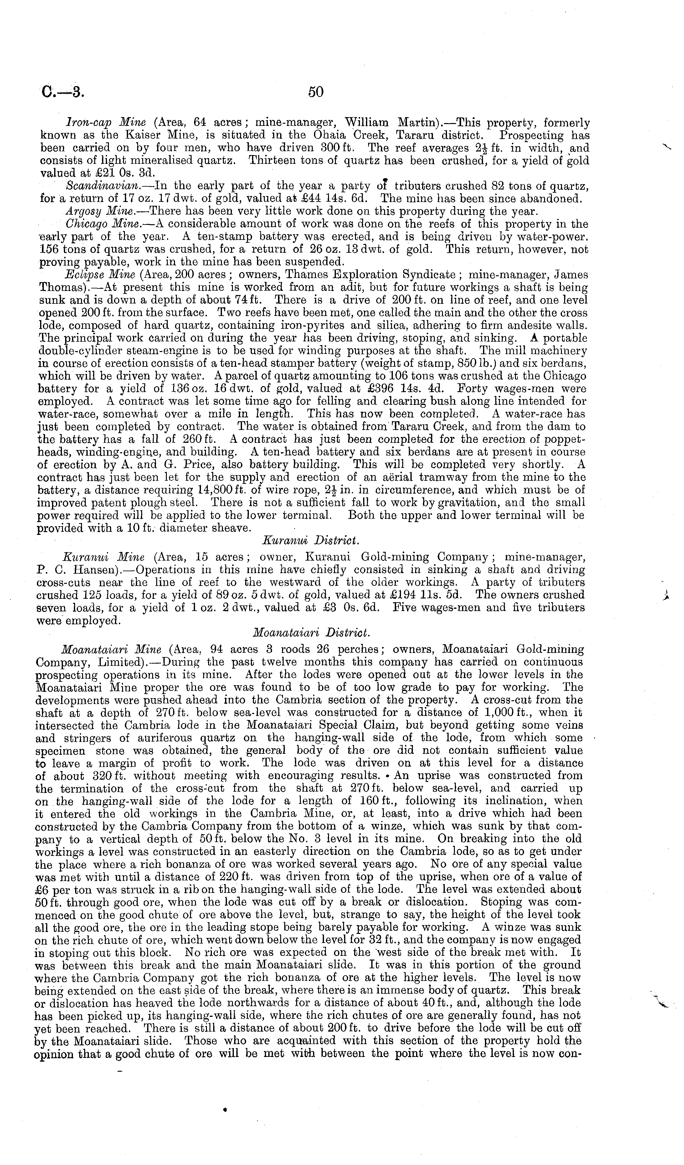 Iron-cap Mine (Area, 64 acres; mine-manager, William Martin). —This property, formerly known as the Kaiser Mine, is situated in the Ohaia Creek, Tararu district. Prospecting has been carried on by four men, who have driven 300 ft. The reef averages 2 J ft. in width, and consists of light mineralised quartz. Thirteen tons of quartz has been crushed, for a yield of gold valued at £21 os. 3d. Scandinavian. —In the early part of the year a party of tributers crushed 82 tons of quartz, for a return of 17 oz. 17 dwfc. of gold, valued at £44 14s. 6d. The mine has been since abandoned. Argosy Mine. —There has been very little work done on this property during the year. Chicago Mine. —A considerable amount of work was done on the reefs of this property in the early part of the year. A ten-stamp battery was erected, and is being driven by water-power. 156 tons of quartz was crushed, for a return of 26 oz. 13dwt. of gold. This return, however, not proving payable, work in the mine has been suspended. Eclipse Mine (Area, 200 acres ; owners, Thames Exploration Syndicate ; mine-manager, James Thomas). —At present this mine is worked from an adit, but for future workings a shaft is being sunk and is down a depth of about 74 ft. There is a drive of 200 ft. on line of reef, and one level opened 200 ft. from the surface. Two reefs have been met, one called the main and the other the cross lode, composed of hard quartz, containing iron-pyrites and silica, adhering to firm andesite walls. The principal work carried on during the year has been driving, stoping, and sinking. A portable double-cylinder steam-engine is to be used for winding purposes at the shaft. The mill machinery in course of erection consists of a ten-head stamper battery (weight of stamp, 850 lb.) and six berdans, which will be driven by water. A parcel of quartz amounting to 106 tons was crushed at the Chicago battery for a yield of 136 oz. 16 dwt. of gold, valued at £396 14s. 4d. Forty wages-men were employed. A contract was let some time ago for felling and clearing bush along line intended for water-race, somewhat over a mile in length. This has now been completed. A water-race has just been completed by contract. The water is obtained from Tararu Creek, and from the dam to the battery has a fall of 260 ft. A contract has just been completed for the erection of poppetheads, winding-engine, and building. A ten-head battery and six berdans are at present in course of erection by A. and G. Price, also battery building. This will be completed very shortly. A contract has just been let for the supply and erection of an aerial tramway from the mine to the battery, a distance requiring 14,800 ft. of wire rope, 2Jin. in circumference, and which must be of improved patent plough steel. There is not a sufficient fall to work by gravitation, and the small power required will be applied to the lower terminal. Both the upper and lower terminal will be provided with a 10 ft. diameter sheave. Kuranui District. Kuranui Mine (Area, 15 acres; owner, Kuranui Gold-mining Company; mine-manager, P. C. Hansen). —Operations in this mine have chiefly consisted in sinking a shaft and driving cross-cuts near the line of reef to the westward of the older workings. A party of tributers crushed 125 loads, for a yield of 89 oz. 5 dwt. of gold, valued at £194 11s. sd. The owners crushed seven loads, for a yield of 1 oz. 2 dwt., valued at £3 os. 6d. Five wages-men and five tributers were employed. Moanataiari District. Moanataiari Mine (Area, 94 acres 3 roods 26 perches; owners, Moanataiari Gold-mining Company, Limited). —During the past twelve months this company has carried on continuous prospecting operations in its mine. After the lodes were opened out at the lower levels in the Moanataiari Mine proper the ore was found to be of too low grade to pay for working. The developments were pushed ahead into the Cambria section of the property. A cross-cut from the shaft at a depth of 270 ft. below sea-level was constructed for a distance of 1,000 ft., when it intersected the Cambria lode in the Moanataiari Special Claim, but beyond getting some veins and stringers of auriferous quartz on the hanging-wall side of the lode, from which some specimen stone was obtained, the general body of the ore did not contain sufficient value to leave a margin of profit to work. The lode was driven on at this level for a distance of about 320 ft. without meeting with encouraging results. • An uprise was constructed from the termination of the cross-cut from the shaft at 270 ft. below sea-level, and carried up on the hanging-wall side of the lode for a length of 160 ft., following its inclination, when it entered the old workings in the Cambria Mine, or, at least, into a drive which had been constructed by the Cambria Company from the bottom of a winze, which was sunk by that company to a vertical depth of 50 ft. below the No. 3 level in its mine. On breaking into the old workings a level was constructed in an easterly direction on the Cambria lode, so as to get under the place where a rich bonanza of ore was worked several years ago. No ore of any special value was met with until a distance of 220 ft. was driven from top of the uprise, when ore of a value of £6 per ton was struck in a rib on the hanging-wall side of the lode. The level was extended about 50 ft. through good ore, when the lode was cut off by a break or dislocation. Stoping was commenced on the good chute of ore above the level, but, strange to say, the height of the level took all the good ore, the ore in the leading stope being barely payable for working. A winze was sunk on the rich chute of ore, which went down below the level for 32 ft., and the company is now engaged in stoping out this block. No rich ore was expected on the 'west side of the break met with. It was between this break and the main Moanataiari slide. It was in this portion of the ground where the Cambria Company got the rich bona