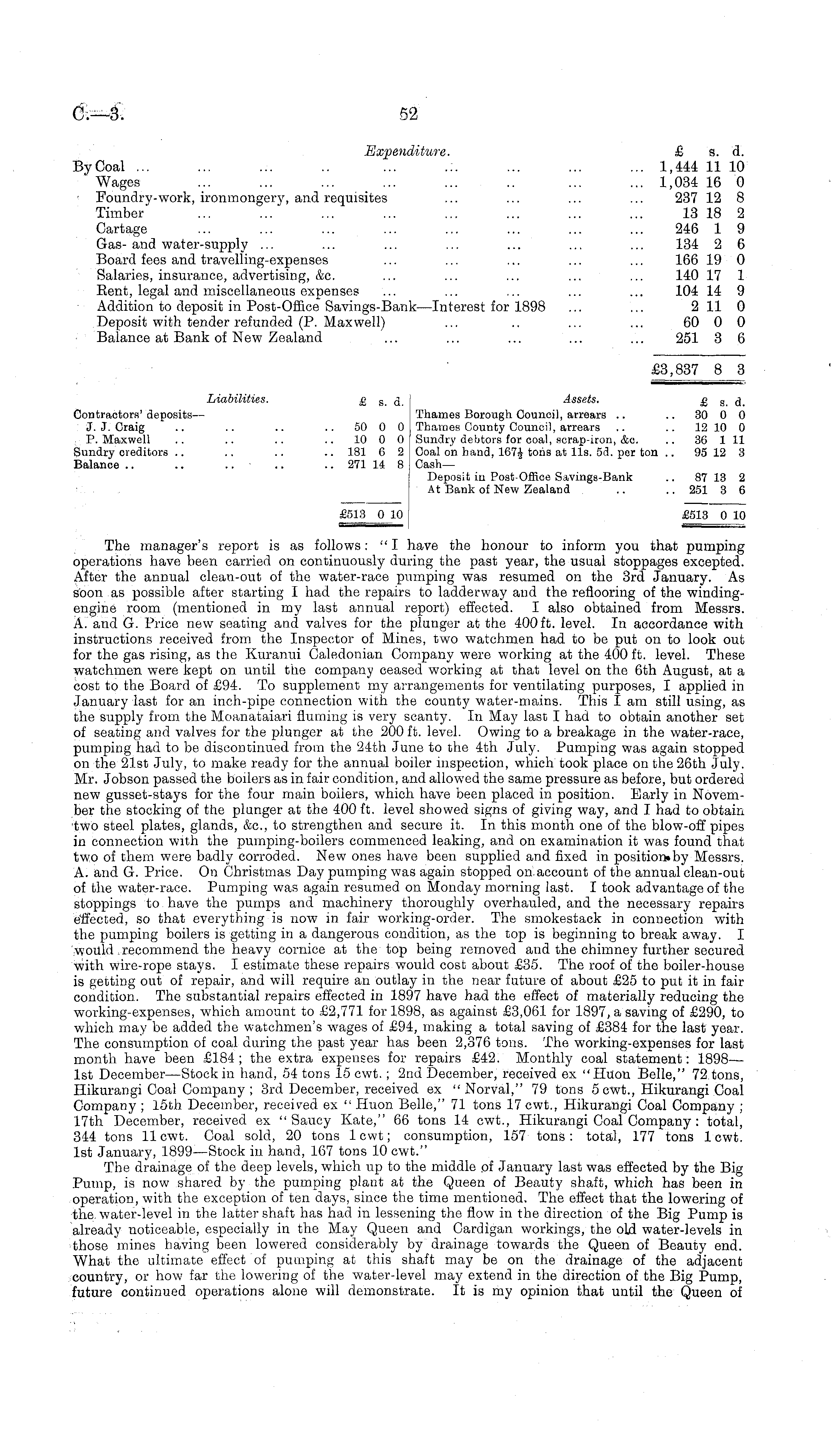 Expenditure. £ s. d. ByCoal ... ... ... .. ... ... ... ... ... 1,444 11 10 Wages ... ... ... ... ... .. ... ... 1,034 16 0 Foundry-work, ironmongery, and requisites ... ... ... ... 237 12 8 Timber ... ... ... ... ... ... ... ... 13 18 2 Cartage ... ... ... ... ... ... ... ... 246 1 9 Gas- and water-supply ... ... ... ... ... ... ... 134 2 6 Board fees and travelling-expenses ... ... ... ... ... 166 19 0 Salaries, insurance, advertising, &c. ... ... ... ... ... 140 17 1 Rent, legal and miscellaneous expenses ... ... ... ... ... 104 14 9 Addition to deposit in Post-Office Savings-Bank—lnterest for 1898 ... ... 211 0 Deposit with tender refunded (P. Maxwell) ... .. ... ... 60 0 0 Balance at Bank of New Zealand ... ... ... ... ... 251 3 6 £3,837 8 3 Liabilities. £ s _ 3 Assets. jg g $ Contractor?! , deposits— Thames Borough Council, arrears .. .. 30 0 0 J.J.Craig .. .. .. 50 0 0 Thames County Council, arrears .. .. 12 10 0 P. Maxwell .. .. .. 10 0 0 Sundry debtors for coal, scrap-iron, &a. .. 36 111 Sundry creditors .. .. .. .. 181 6 2 Coal on hand, 167J tons at lls. sd. per ton .. 95 12 3 Balance .. .. .. .. .. 271 14 8 CashDeposit in Post- Office Savings-Bank .. 87 13 2 ■ , At Bank of New Zealand .. .. 251 3 6 £513 0 10 £513 0 10 The manager's report is as follows: " I have the honour to inform you that pumping operations have been carried on continuously during the past year, the usual stoppages excepted. After the annual clean-out of the water-race pumping was resumed on the 3rd January. As soon as possible after starting I had the repairs to ladderway and the rerlooring of the windingengine room (mentioned in my last annual report) effected. I also obtained from Messrs. A. and G. Price new seating and valves for the plunger at the 400 ft. level. In accordance with instructions received from the Inspector of Mines, two watchmen had to be put on to look out for the gas rising, as the Kuranui Caledonian Company were working at the 400 ft. level. These watchmen were kept on until the company ceased working at that level on the 6th August, at a cost to the Board of £94. To supplement my arrangements for ventilating purposes, I applied in January last for an inch-pipe connection with the county water-mains. This lam still using, as the supply from the Moanataiari fluming is very scanty. In May last I had to obtain another set of seating and valves for the plunger at the 200 ft. level. Owing to a breakage in the water-race, pumping had to be discontinued from the 24th June to the 4th July. Pumping was again stopped on the 21st July, to make ready for the annual boiler inspection, which took place on the 26th July. Mr. Jobson passed the boilers as in fair condition, and allowed the same pressure as before, but ordered new gusset-stays for the four main boilers, which have been placed in position. Early in November the stocking of the plunger at the 400 ft. level showed signs of giving way, and I had to obtain two steel plates, glands, &c, to strengthen and secure it. In this month one of the blow-off pipes in connection with the pumping-boilers commenced leaking, and on examination it was found that two of them were badly corroded. New ones have been supplied and fixed in position»by Messrs. A. and G. Price. On Christmas Day pumping was again stopped onaccount of the annual clean-out of the water-race. Pumping was again resumed on Monday morning last. I took advantage of the stoppings to have the pumps and machinery thoroughly overhauled, and the necessary repairs effected, so that everything is now in fair working-order. The smokestack in connection with the pumping boilers is getting in a dangerous condition, as the top is beginning to break away. I would recommend the heavy cornice at the top being removed and the chimney further secured with wire-rope stays. I estimate these repairs would cost about £35. The roof of the boiler-house is getting out of repair, and will require an outlay in the near future of about £25 to put it in fair condition. The substantial repairs effected in 1897 have had the effect of materially reducing the working-expenses, which amount to £2,771 for 1898, as against £3,061 for 1897, a saving of £290, to which may be added the watchmen's wages of £94, making a total saving of £384 for the last year. The consumption of coal during the past year has been 2,376 tons. The working-expenses for last month have been £184; the extra expenses for repairs £42. Monthly coal statement: 1898— Ist December —Stock in hand, 54 tons 15 cwt.; 2nd December, received ex "Huon Belle," 72 tons, Hikurangi Coal Company ; 3rd December, received ex " Norval," 79 tons 5 cwt., Hikurangi Coal Company ; 15th December, received ex " Huon Belle," 71 tons 17 cwt., Hikurangi Coal Company ; 17th December, received ex " Saucy Kate," 66 tons 14 cwt., Hikurangi Coal Company : total, 344 tons 11 cwt. Coal sold, 20 tons 1 cwt; consumption, 157 tons: total, 177 tons 1 cwt. Ist January, 1899—Stock in hand, 167 tons 10 cwt." The drainage of the deep levels, which up to the middle of January last was effected by the Big Pump, is now shared by the pumping plant at the Queen of Beauty shaft, which has been in operation, with the exception of ten days, since the time mentioned. The effect that the lowering of the. water-level in the latter shaft has had in lessening the flow in the direction of the Big Pump is already noticeable, especially in the May Queen and Cardigan workings, the oLd water-levels in those mines having been lowered considerably by drainage towards the Queen of Beauty end. What the ultimate effect of pumping at this shaft may be on the drainage of the adjacent country, or how far the lowering of the water-level may extend in the direction of the Big Pump, future continued operations alone will demonstrate. It is my opinion that until the Queen of