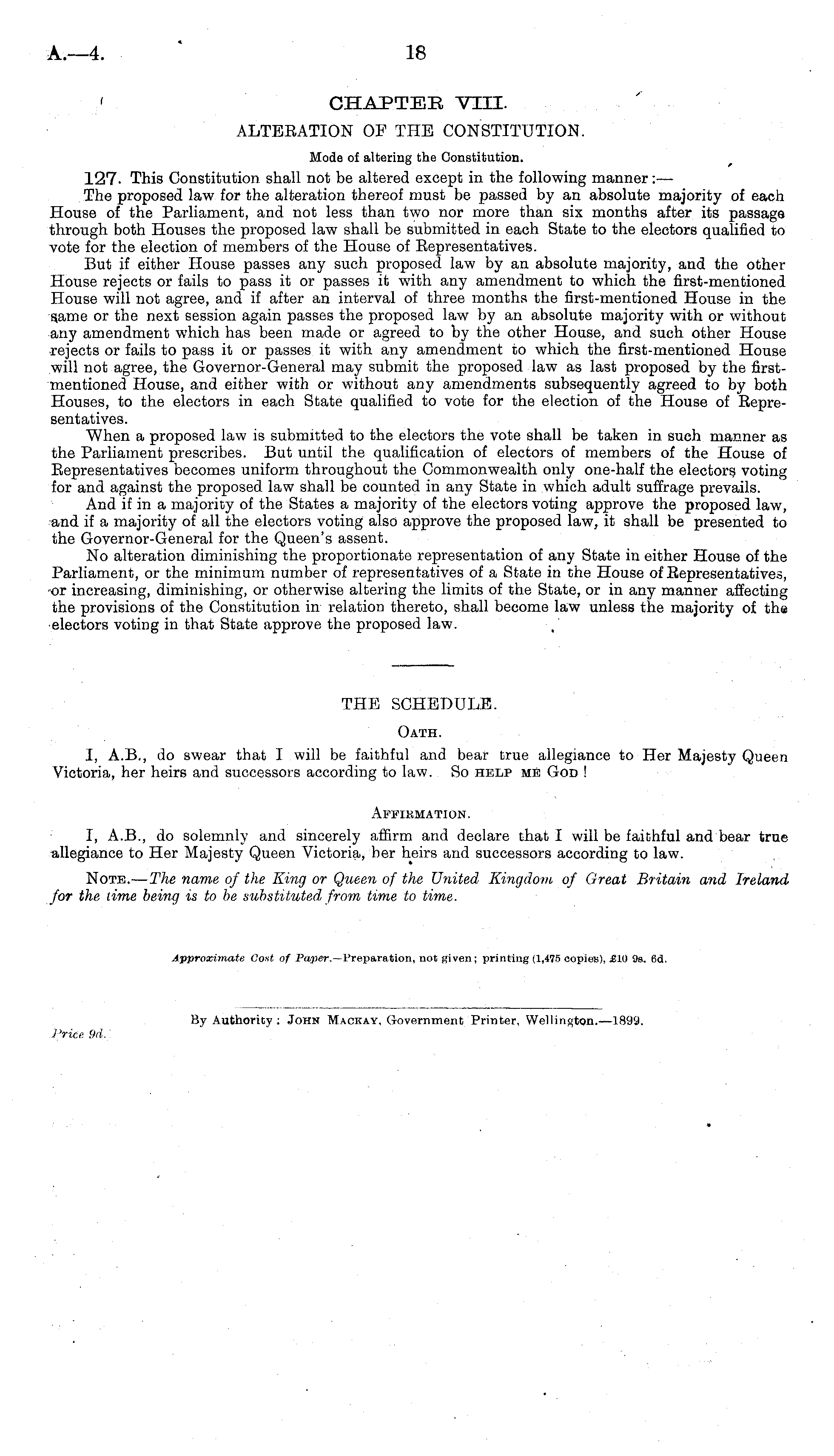 ' CHAPTER VIII. ALTEEATION OF THE CONSTITUTION. Mode of altering the Constitution. 127. This Constitution shall not be altered except in the following manner:— The proposed law for the alteration thereof must be passed by an absolute majority of each House of the Parliament, and not less than two nor more than six months after its passage through both Houses the proposed law shall be submitted in each State to the electors qualified to vote for the election of members of the House of Eepresentatives. But if either House passes any such proposed law by an absolute majority, and the other House rejects or fails to pass it or passes it with any amendment to which the first-mentioned House will not agree, and if after an interval of three months the first-mentioned House in the or the next session again passes the proposed law by an absolute majority with or without any amendment which has been made or agreed to by the other House, and such other House rejects or fails to pass it or passes it with any amendment to which the first-mentioned House will not agree, the Governor-General may submit the proposed law as last proposed by the firstTnentioned House, and either with or without any amendments subsequently agreed to by both Houses, to the electors in each State qualified to vote for the election of the House of Eepresentatives. When a proposed law is submitted to the electors the vote shall be taken in such manner as the Parliament prescribes. But until the qualification of electors of members of the House of Eepresentatives becomes uniform throughout the Commonwealth only one-half the electors voting for and against the proposed law shall be counted in any State in which adult suffrage prevails. And if in a majority of the States a majority of the electors voting approve the proposed law, and if a majority of all the electors voting also approve the proposed law, it shall be presented to the Governor-General for the Queen's assent. No alteration diminishing the proportionate representation of any State in either House of the Parliament, or the minimum number of representatives of a State in the House of Eepresentatives, or increasing, diminishing, or otherwise altering the limits of the State, or in any manner affecting the provisions of the Constitution in relation thereto, shall become law unless the majority of the electors voting in that State approve the proposed law.