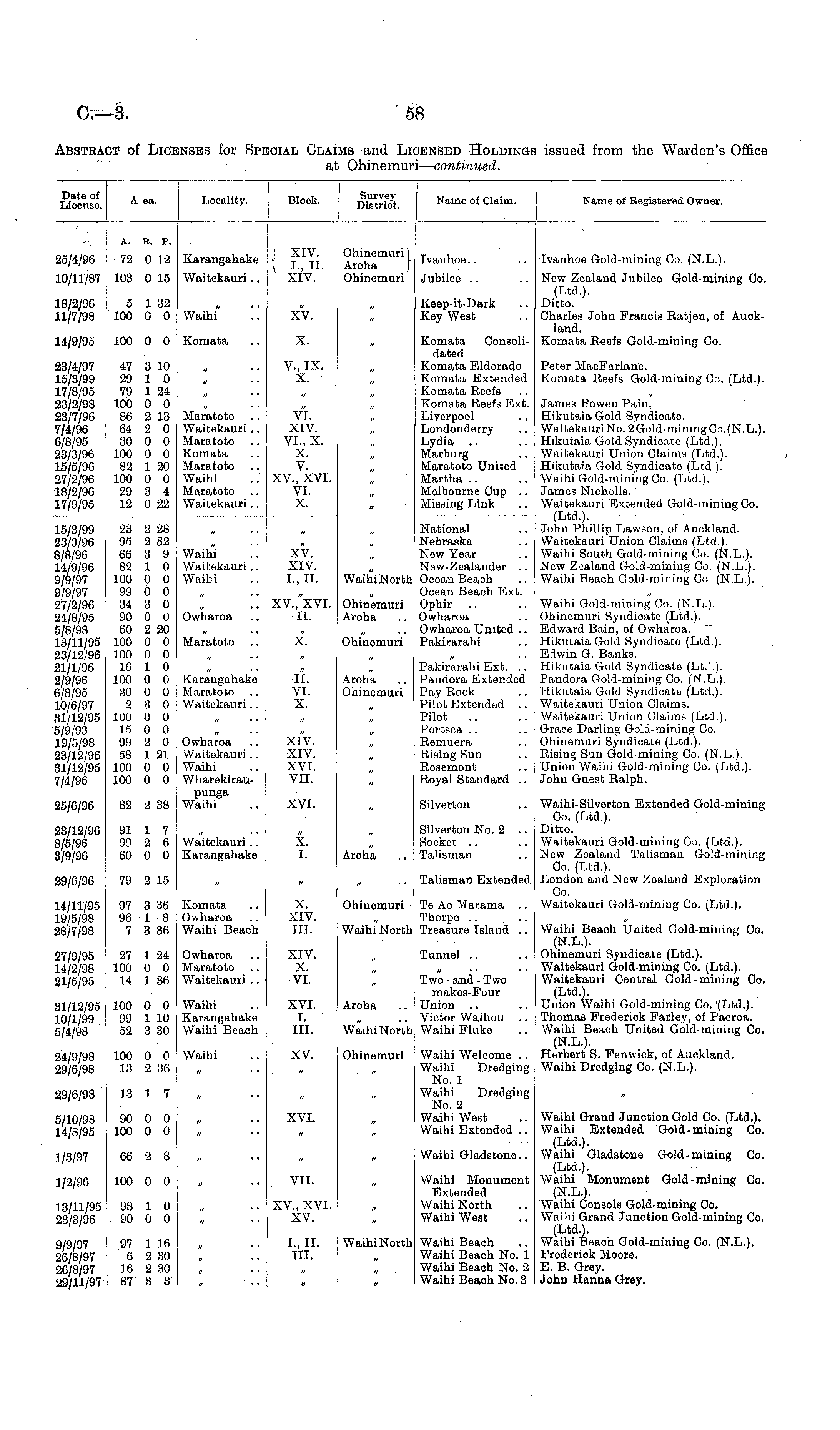 Abstract of Licenses for Special Claims and Licensed Holdings issued from the Warden's Office at Ohinemuri— continued.