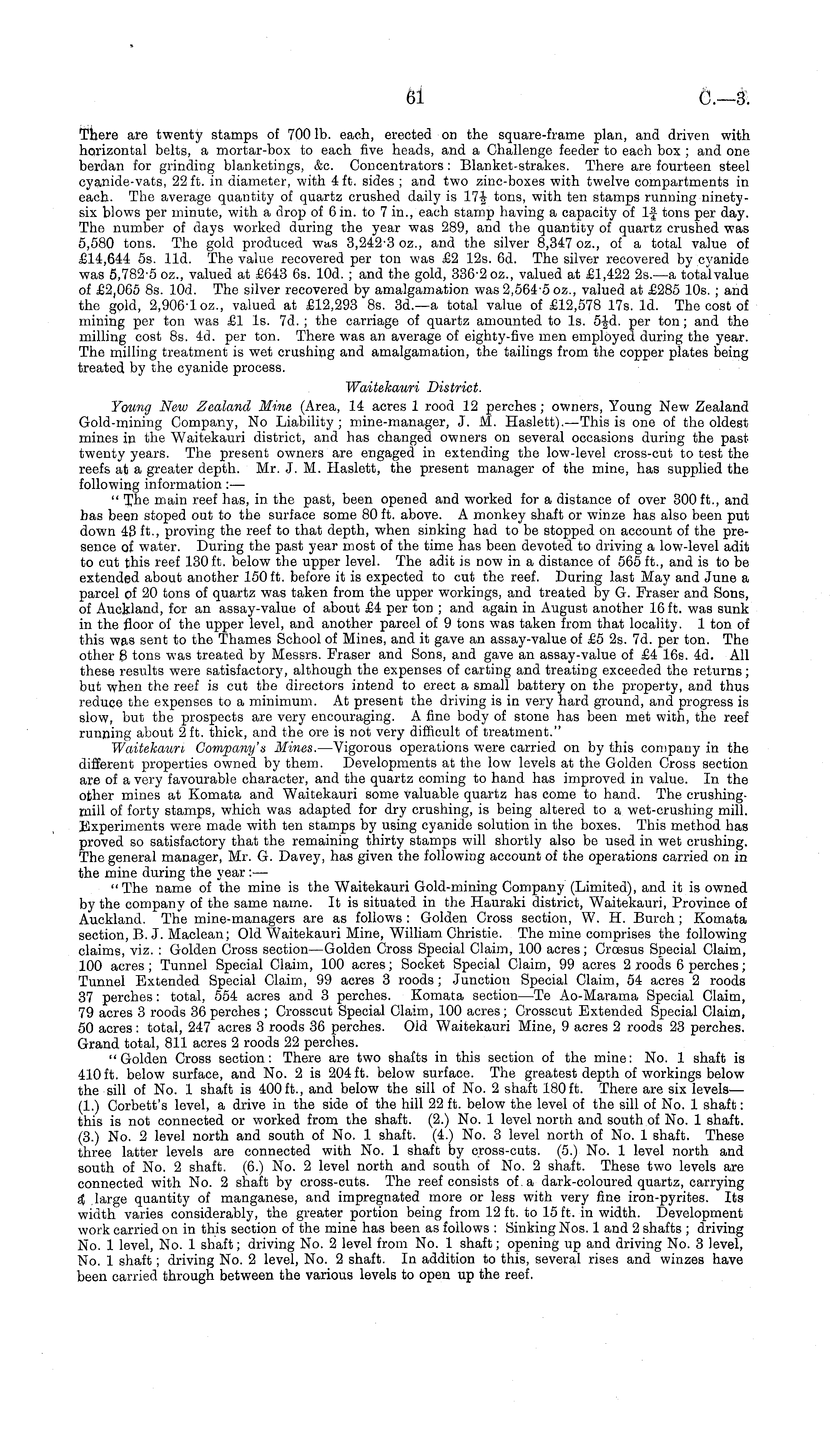 There are twenty stamps of 700 lb. each, erected on the square-frame plan, and driven with horizontal belts, a mortar-box to each five heads, and a Challenge feeder to each box ; and one berdan for grinding blanketings, &c. Concentrators : Blanket-strakes. There are fourteen steel cyanide-vats, 22 ft. in diameter, with 4 ft. sides ; and two zinc-boxes with twelve compartments in each. The average quantity of quartz crushed daily is 17-J tons, with ten stamps running ninetysix blows per minute, with a drop of 6 in. to 7 in., each stamp having a capacity of If tons per day. The number of days worked during the year was 289, and the quantity of quartz crushed was 5,580 tons. The gold produced was 3,242-3 oz., and the silver 8,347 oz., of a total value of £14,644 ss. lid. The value recovered per ton was £2 12s. 6d. The silver recovered by cyanide was 5,782-5 oz., valued at £643 6s. 10d. ; and the gold, 336-2 oz., valued at £1,422 2s.—a total value of £2,065 Bs. 10d. The silver recovered by amalgamation was 2,564-5 oz., valued at £285 10s.; and the gold, 2,906-1 oz., valued at £12,293 Bs. 3d.—a total value of £12,578 17s. Id. The cost of mining per ton was £1 Is. 7d. ; the carriage of quartz amounted to Is. 5-Jd. per ton; and the milling cost Bs. 4d. per ton. There was an average of eighty-five men employed during the year. The milling treatment is wet crushing and amalgamation, the tailings from the copper plates being treated by the cyanide process. Waitekauri District. Young New Zealand Mine (Area, 14 acres 1 rood 12 perches ; owners, Young New Zealand Gold-mining Company, No Liability ; mine-manager, J. M. Haslett). —This is one of the oldest mines in the Waitekauri district, and has changed owners on several occasions during the past twenty years. The present owners are engaged in extending the low-level cross-cut to test the reefs at a greater depth. Mr. J. M. Haslett, the present manager of the mine, has supplied the following information: — " The main reef has, in the past, been opened and worked for a distance of over 300 ft., and has been stoped out to the surface some 80 ft. above. A monkey shaft or winze has also been put down 43 ft., proving the reef to that depth, when sinking had to be stopped on account of the presence of water. During the past year most of the time has been devoted to driving a low-level adit to cut this reef 130 ft. below the upper level. The adit is now in a distance of 565 ft., and is to be extended about another 150 ft. before it is expected to cut the reef. During last May and June a parcel of 20 tons of quartz was taken from the upper workings, and treated by G. Fraser and Sons, of Auckland, for an assay-value of about £4 per ton ; and again in August another 16 ft. was sunk in the floor of the upper level, and another parcel of 9 tons was taken from that locality. 1 ton of this was sent to the Thames School of Mines, and it gave an assay-value of £5 2s. 7d. per ton. The other 8 tons was treated by Messrs. Fraser and Sons, and gave an assay-value of £4 16s. 4d. All these results were satisfactory, although the expenses of carting and treating exceeded the returns; but when the reef is cut the directors intend to erect a small battery on the property, and thus reduce the expenses to a minimum. At present the driving is in very hard ground, and progress is slow, but the prospects are very encouraging. A fine body of stone has been met with, the reef running about 2 ft. thick, and the ore is not very difficult of treatment." Waitekauri Company's Mines. —Vigorous operations were carried on by this company in the different properties owned by them. Developments at the low levels at the Golden Cross section are of a very favourable character, and the quartz coming to hand has improved in value. In the other mines at Komata and Waitekauri some valuable quartz has come to hand. The crushingmill of forty stamps, which was adapted for dry crushing, is being altered to a wet-crushing mill. Experiments were made with ten stamps by using cyanide solution in the boxes. This method has proved so satisfactory that the remaining thirty stamps will shortly also be used in wet crushing. The general manager, Mr. G. Davey, has given the following account of the operations carried on in the mine during the year : — "The name of the mine is the Waitekauri Gold-mining Company (Limited), and it is owned by the company of the same name. It is situated in the Hauraki district, Waitekauri, Province of Auckland. The mine-managers are as follows : Golden Cross section, W. H. Burch; Komata section, B. J. Maclean; Old Waitekauri Mine, William Christie. The mine comprises the following claims, viz. : Golden Cross section —Golden Cross Special Claim, 100 acres; Croesus Special Claim, 100 acres ; Tunnel Special Claim, 100 acres; Socket Special Claim, 99 acres 2 roods 6 perches; Tunnel Extended Special Claim, 99 acres 3 roods; Junction Special Claim, 54 acres 2 roods 37 perches: total, 554 acres and 3 perches. Komata section —Te Ao-Marama Special Claim, 79 acres 3 roods 36 perches ; Crosscut Special Claim, 100 acres; Crosscut Extended Special Claim, 50 acres: total, 247 acres 3 roods 36 perches. Old Waitekauri Mine, 9 acres 2 roods 23 perches. Grand total, 811 acres 2 roods 22 perches. "Golden Cross section: There are two shafts in this section of the mine: No. 1 shaft is 410 ft. below surface, and No. 2 is 204 ft. below surface. The greatest depth of workings below the sill of No. 1 shaft is 400 ft., and below the sill of No. 2 shaft 180 ft. There are six levels— (1.) Corbett's level, a drive in the side of the hill 22 ft. below the level of the sill of No. 1 shaft: this is not connected or worked from the shaft. (2.) No. 1 level north and south of No. 1 shaft. (3.) No. 2 level north and south of No. 1 shaft. (4.) No. 3 level north of No. 1 shaft. These three latter levels are connected with No. 1 shaft by cross-cuts. (5.) No. 1 level north and south of No. 