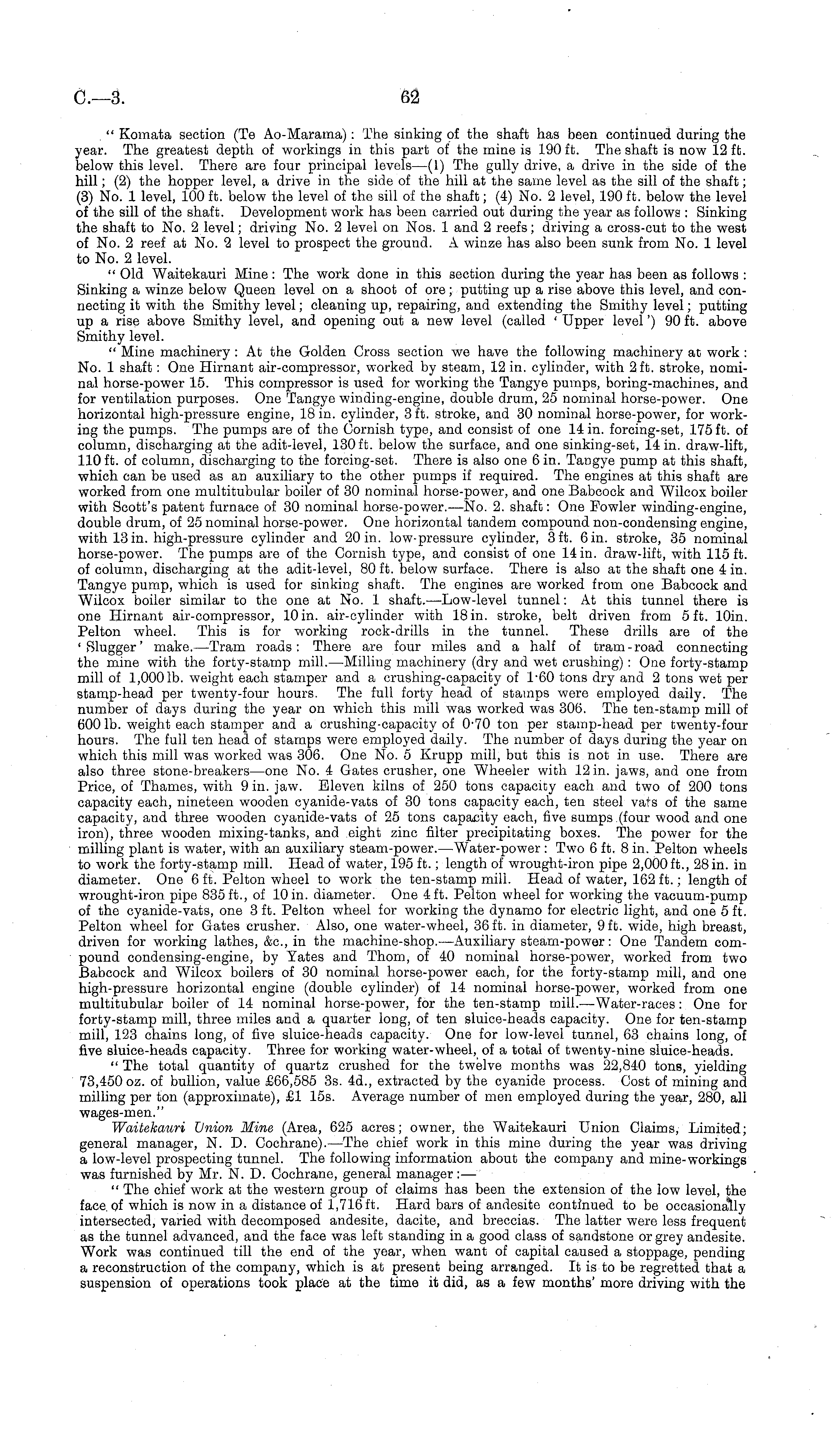 " Komata section (Te Ao-Marama): The sinking of the shaft has been continued during the year. The greatest depth of workings in this part of the mine is 190 ft. The shaft is now 12 ft. below this level. There are four principal levels—(l) The gully drive, a drive in the side of the hill; (2) the hopper level, a drive in the side of the hill at the same level as the sill of the shaft; (3) No. 1 level, 100 ft. below the level of the sill of the shaft; (4) No. 2 level, 190 ft. below the level of the sill of the shaft. Development work has been carried out during the year as follows : Sinking the shaft to No. 2 level; driving No. 2 level on Nos. 1 and 2 reefs; driving a cross-cut to the west of No. 2 reef at No. 2 level to prospect the ground. A winze has also been sunk from No. 1 level to No. 2 level. " Old Waitekauri Mine : The work done in this section during the year has been as follows : Sinking a winze below Queen level on a shoot of ore; putting up a rise above this level, and connecting it with the Smithy level; cleaning up, repairing, and extending the Smithy level; putting up a rise above Smithy level, and opening out a new level (called ' Upper level') 90 ft. above Smithy level. " Mine machinery : At the Golden Cross section we have the following machinery at work : No. 1 shaft: One Hirnant air-compressor, worked by steam, 12 in. cylinder, with 2 ft. stroke, nominal horse-power 15. This compressor is used for working the Tangye pumps, boring-machines, and for ventilation purposes. One Tangye winding-engine, double drum, 25 nominal horse-power. One horizontal high-pressure engine, 18 in. cylinder, 3 ft. stroke, and 30 nominal horse-power, for working the pumps. The pumps are of the Cornish type, and consist of one 14 in. forcing-set, 175 ft. of column, discharging at the adit-level, 130 ft. below the surface, and one sinking-set, 14 in. draw-lift, 110 ft. of column, discharging to the forcing-set. There is also one 6 in. Tangye pump at this shaft, which can be used as an auxiliary to the other pumps if required. The engines at this shaft are worked from one multitubular boiler of 30 nominal horse-power, and one Babcock and Wilcox boiler with Scott's patent furnace of 30 nominal horse-power.—No. 2. shaft: One Fowler winding-engine, double drum, of 25 nominal horse-power. One horizontal tandem compound non-condensing engine, with 13 in. high-pressure cylinder and 20 in. low-pressure cylinder, 3 ft. 6 in. stroke, 35 nominal horse-power. The pumps are of the Cornish type, and consist of one 14 in. draw-lift, with 115 ft. of column, discharging at the adit-level, 80 ft. below surface. There is also at the shaft one 4 in. Tangye pump, which is used for sinking shaft. The engines are worked from one Babcock and Wilcox boiler similar to the one at No. 1 shaft.—Low-level tunnel: At this tunnel there is one Hirnant air-compressor, 10 in. air-cylinder with 18 in. stroke, belt driven from 5 ft. 10in. Pelton wheel. This is for working rock-drills in the tunnel. These drills are of the 'Slugger' make.—Tram roads: There are four miles and a half of tram-road connecting the mine with the forty-stamp mill.—Milling machinery (dry and wet crushing): One forty-stamp mill of I,ooolb. weight each stamper and a crushing-capacity of l"60 tons dry and 2 tons wet per stamp-head per twenty-four hours. The full forty head of stamps were employed daily. The number of days during the year on which this mill was worked was 306. The ten-stamp mill of 6001b. weight each stamper and a crushing-capacity of o'7o ton per stamp-head per twenty-four hours. The full ten head of stamps were employed daily. The number of days during the year on which this mill was worked was 306. One No. 5 Krupp mill, but this is not in use. There are also three stone-breakers—one No. 4 Gates crusher, one Wheeler with 12 in. jaws, and one from Price, of Thames, with 9 in. jaw. Eleven kilns of 250 tons capacity each and two of 200 tons capacity each, nineteen wooden cyanide-vats of 30 tons capacity each, ten steel vafs of the same capacity, and three wooden cyanide-vats of 25 tons capacity each, five sumps (four wood and one iron), three wooden mixing-tanks, and eight zinc filter precipitating boxes. The power for the milling plant is water, with an auxiliary steam-power. —Water-power : Two 6 ft, 8 in. Pelton wheels to work the forty-stamp mill. Head of water, 195 ft.; length of wrought-iron pipe 2,000 ft., 28 in. in diameter. One 6 ft. Pelton wheel to work the ten-stamp mill. Head of water, 162 ft.; length of wrought-iron pipe 835 ft., of 10 in. diameter. One 4 ft. Pelton wheel for working the vacuum-pump of the cyanide-vats, one 3 ft. Pelton wheel for working the dynamo for electric light, and one 5 ft. Pelton wheel for Gates crusher. Also, one water-wheel, 36 ft. in diameter, 9 ft. wide, high breast, driven for working lathes, &c, in the machine-shop.—Auxiliary steam-power: One Tandem compound condensing-engine, by Yates and Thorn, of 40 nominal horse-power, worked from two Babcock and Wilcox boilers of 30 nominal horse-power each, for the forty-stamp mill, and one high-pressure horizontal engine (double cylinder) of 14 nominal horse-power, worked from one multitubular boiler of 14 nominal horse-power, for the ten-stamp mill.—Water-races: One for forty-stamp mill, three miles and a quarter long, of ten sluice-heads capacity. One for ten-stamp mill, 123 chains long, of five sluice-heads capacity. One for low-level tunnel, 63 chains long, of five sluice-heads capacity. Three for working water-wheel, of a total of twenty-nine sluice-heads. " The total quantity of quartz crushed for the twelve months was 22,840 tons, yielding 73,450 oz. of bullion, value £66,585 3s. 4d., extracted by the cyanide process. Cost of mining and milling per ton (approximate), £1 15s. Average number of men employed during the year, 280, all wages-men." Waitekauri Union Mine (Area, 625 acres; owner, the Waitekauri Union Claims, Limited; general m