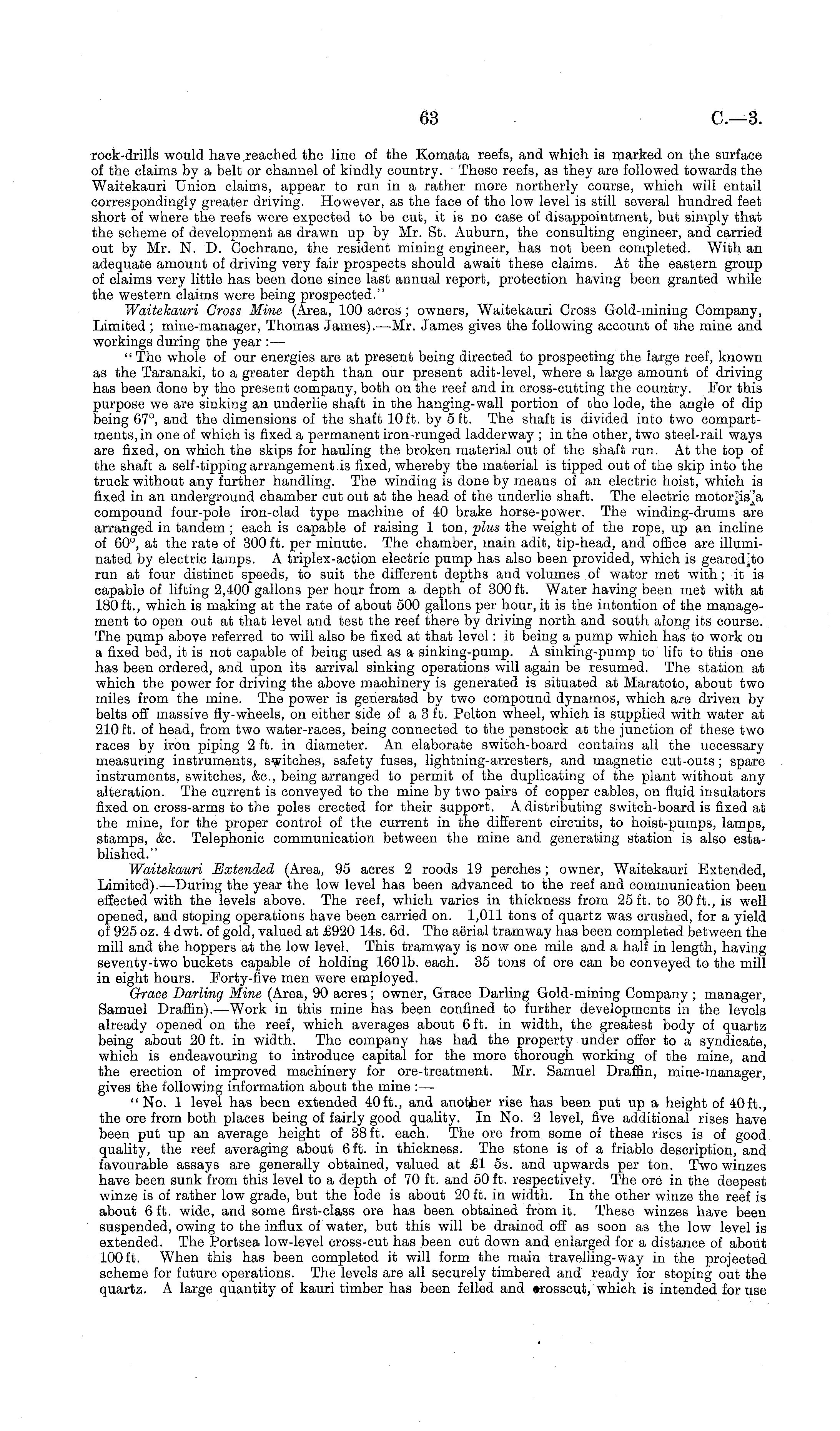 rock-drills would have .reached the line of the Komata reefs, and which is marked on the surface of the claims by a belt or channel of kindly country. " These reefs, as they are followed towards the Waitekauri Union claims, appear to run in a rather more northerly course, which will entail correspondingly greater driving. However, as the face of the low level is still several hundred feet short of where the reefs were expected to be cut, it is no case of disappointment, but simply that the scheme of development as drawn up by Mr. St. Auburn, the consulting engineer, and carried out by Mr. N. D. Cochrane, the resident mining engineer, has not been completed. With an adequate amount of driving very fair prospects should await these claims. At the eastern group of claims very little has been done eince last annual report, protection having been granted while the western claims were being prospected." Waitekauri Gross Miyie (Area, 100 acres ; owners, Waitekauri Cross Gold-mining Company, Limited ; mine-manager, Thomas James). —Mr. James gives the following account of the mine and workings during the year : — "The whole of our energies are at present being directed to prospecting the large reef, known as the Taranaki, to a greater depth than our present adit-level, where a large amount of driving has been done by the present company, both on the reef and in cross-cutting the country. For this purpose we are sinking an underlie shaft in the hanging-wall portion of the lode, the angle of dip being 67°, and the dimensions of the shaft 10 ft. by 5 ft. The shaft is divided into two compartments, in one of which is fixed a permanent iron-runged ladderway ; in the other, two steel-rail ways are fixed, on which the skips for hauling the broken material out of the shaft run. At the top of the shaft a self-tipping arrangement is fixed, whereby the material is tipped out of the skip into the truck without any further handling. The winding is done by means of an electric hoist, which is fixed in an underground chamber cut out at the head of the underlie shaft. The electric motorjis'a compound four-pole iron-clad type machine of 40 brake horse-power. The winding-drums are arranged in tandem ; each is capable of raising 1 ton, plus the weight of the rope, up an incline of 60°, at the rate of 300 ft. per minute. The chamber, main adit, tip-head, and office are illuminated by electric lamps. A triplex-action electric pump has also been provided, which is geared,to run at four distinct speeds, to suit the different depths and volumes of water met with; it is capable of lifting 2,400 gallons per hour from a depth of 300 ft. Water having been met with at 180 ft., which is making at the rate of about 500 gallons per hour, it is the intention of the management to open out at that level and test the reef there by driving north and south along its course. The pump above referred to will also be fixed at that level: it being a pump which has to work on a fixed bed, it is not capable of being used as a sinking-pump. A sinking-pump to lift to this one has been ordered, and upon its arrival sinking operations will again be resumed. The station at which the power for driving the above machinery is generated is situated at Maratoto, about two miles from the mine. The power is generated by two compound dynamos, which are driven by belts off massive fly-wheels, on either side of a 3 ft. Pelton wheel, which is supplied with water at 210 ft. of head, from two water-races, being connected to the penstock at the junction of these two races by iron piping 2 ft. in diameter. An elaborate switch-board contains all the necessary measuring instruments, switches, safety fuses, lightning-arresters, and magnetic cut-outs; spare instruments, switches, &c, being arranged to permit of the duplicating of the plant without any alteration. The current is conveyed to the mine by two pairs of copper cables, on fluid insulators fixed on cross-arms to the poles erected for their support. A distributing switch-board is fixed at the mine, for the proper control of the current in the different circuits, to hoist-pumps, lamps, stamps, &c. Telephonic communication between the mine and generating station is also established." Waitekauri Extended (Area, 95 acres 2 roods 19 perches; owner, Waitekauri Extended, Limited). —During the year the low level has been advanced to the reef and communication been effected with the levels above. The reef, which varies in thickness from 25 ft. to 30 ft., is well opened, and stoping operations have been carried on. 1,011 tons of quartz was crushed, for a yield of 925 oz. 4 dwt. of gold, valued at £920 14s. 6d. The aerial tramway has been completed between the mill and the hoppers at the low level. This tramway is now one mile and a half in length, having seventy-two buckets capable of holding 1601b. each. 35 tons of ore can be conveyed to the mill in eight hours. Forty-five men were employed. Grace Darling Mine (Area, 90 acres ; owner, Grace Darling Gold-mining Company ; manager, Samuel Draffin). —Work in this mine has been confined to further developments in the levels already opened on the reef, which averages about 6 ft. in width, the greatest body of quartz being about 20 ft. in width. The company has had the property under offer to a syndicate, which is endeavouring to introduce capital for the more thorough working of the mine, and the erection of improved machinery for ore-treatment. Mr. Samuel Draffin, mine-manager, gives the following information about the mine : — "No. 1 level has been extended 40ft., and another rise has been put up a height of 40ft., the ore from both places being of fairly good quality. In No. 2 level, five additional rises have been put up an average height of 38 ft. each. The ore from some of these rises is of good quality, the reef averaging about 6 ft. in thickness. The stone is of a friable description, and favourable assays are generally obtained, valued at £1 ss. an