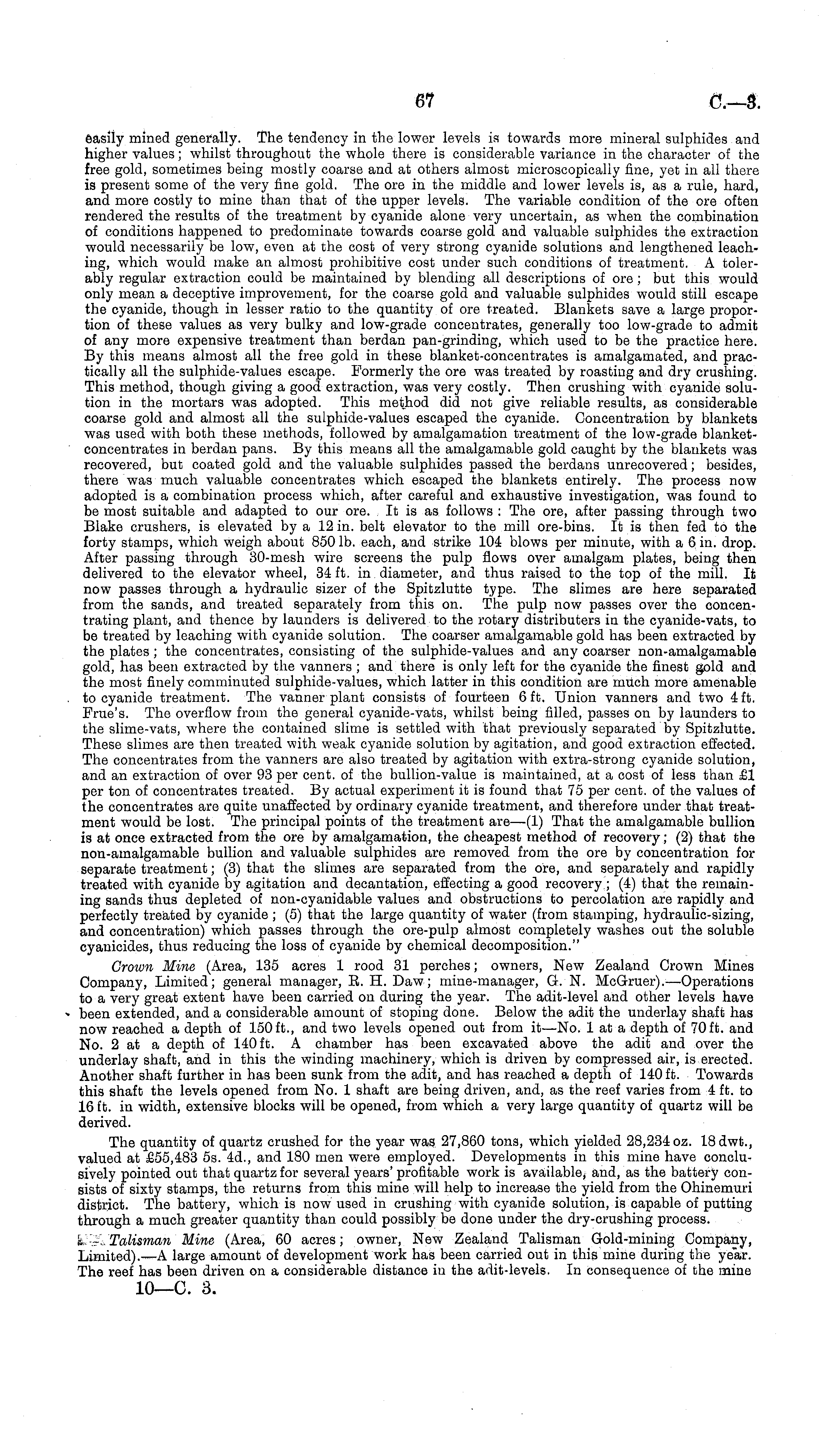 easily mined generally. The tendency in the lower levels is towards more mineral sulphides and higher values; whilst throughout the whole there is considerable variance in the character of the free gold, sometimes being mostly coarse and at others almost microscopically fine, yet in all there is present some of the very fine gold. The ore in the middle and lower levels is, as a rule, hard, and more costly to mine than that of the upper levels. The variable condition of the ore often rendered the results of the treatment by cyanide alone very uncertain, as when the combination of conditions happened to predominate towards coarse gold and valuable sulphides the extraction would necessarily be low, even at the cost of very strong cyanide solutions and lengthened leaching, which would make an almost prohibitive cost under such conditions of treatment. A tolerably regular extraction could be maintained by blending all descriptions of ore; but this would only mean a deceptive improvement, for the coarse gold and valuable sulphides would still escape the cyanide, though in lesser ratio to the quantity of ore treated. Blankets save a large proportion of these values as very bulky and low-grade concentrates, generally too low-grade to admit of any more expensive treatment than berdan pan-grinding, which used to be the practice here. By this means almost all the free gold in these blanket-concentrates is amalgamated, and practically all the sulphide-values escape. Formerly the ore was treated by roasting and dry crushing. This method, though giving a good extraction, was very costly. Then crushing with cyanide solution in the mortars was adopted. This method did not give reliable results, as considerable coarse gold and almost all the sulphide-values escaped the cyanide. Concentration by blankets was used with both these methods, followed by amalgamation treatment of the low-grade blanketconcentrates in berdan pans. By this means all the amalgamable gold caught by the blankets was recovered, but coated gold and the valuable sulphides passed the berdans unrecovered; besides, there was much valuable concentrates which escaped the blankets entirely. The process now adopted is a combination process which, after careful and exhaustive investigation, was found to be most suitable and adapted to our ore. It is as follows : The ore, after passing through two Blake crushers, is elevated by a 12 in. belt elevator to the mill ore-bins. It is then fed to the forty stamps, which weigh about 850 lb. each, and strike 104 blows per minute, with a 6 in. drop. After passing through 30-mesh wire screens the pulp flows over amalgam plates, being then delivered to the elevator wheel, 34 ft. in diameter, and thus raised to the top of the mill. It now passes through a hydraulic sizer of the Spitzlutte type. The slimes are here separated from the sands, and treated separately from this on. The pulp now passes over the concentrating plant, and thence by launders is delivered to the rotary distributers in the cyanide-vats, to be treated by leaching with cyanide solution. The coarser amalgamable gold has been extracted by the plates; the concentrates, consisting of the sulphide-values and any coarser non-amalgamable gold, has been extracted by the vanners ; and there is only left for the cyanide the finest gold and the most finely comminuted sulphide-values, which latter in this condition are much more amenable to cyanide treatment. The vanner plant consists of fourteen 6 ft. Union vanners and two 4 ft. Frue's. The overflow from the general cyanide-vats, whilst being filled, passes on by launders to the slime-vats, where the contained slime is settled with that previously separated by Spitzlutte. These slimes are then treated with weak cyanide solution by agitation, and good extraction effected. The concentrates from the vanners are also treated by agitation with extra-strong cyanide solution, and an extraction of over 93 per cent, of the bullion-value is maintained, at a cost of less than £1 per ton of concentrates treated. By actual experiment it is found that 75 per cent, of the values of the concentrates are quite unaffected by ordinary cyanide treatment, and therefore under that treatment would be lost. The principal points of the treatment are—(l) That the amalgamable bullion is at once extracted from the ore by amalgamation, the cheapest method of recovery; (2) that the non-amalgamable bullion and valuable sulphides are removed from the ore by concentration for separate treatment; (3) that the slimes are separated from the ore, and separately and rapidly treated with cyanide by agitation and decantation, effecting a good recovery ; (4) that the remaining sands thus depleted of non-cyanidable values and obstructions to percolation are rapidly and perfectly treated by cyanide ; (5) that the large quantity of water (from stamping, hydraulic-sizing, and concentration) which passes through the ore-pulp almost completely washes out the soluble cyauicides, thus reducing the loss of cyanide by chemical decomposition." Grown Mine (Area, 135 acres 1 rood 31 perches; owners, New Zealand Crown Mines Company, Limited; general manager, R. H. Daw; mine-manager, G. N. McGruer). —-Operations to a very great extent have been carried on during the year. The adit-level and other levels have been extended, and a considerable amount of stoping done. Below the adit the underlay shaft has now reached a depth of 150 ft., and two levels opened out from it—No. 1 at a depth of 70 ft. and No. 2 at a depth of 140 ft. A chamber has been excavated above the adit and over the underlay shaft, and in this the winding machinery, which is driven by compressed air, is erected. Another shaft further in has been sunk from the adit, and has reached a depth of 140 ft. Towards this shaft the levels opened from No. 1 shaft are being driven, and, as the reef varies from 4 ft. to 16 ft. in width, extensive blocks will be opened, from which a very large qu