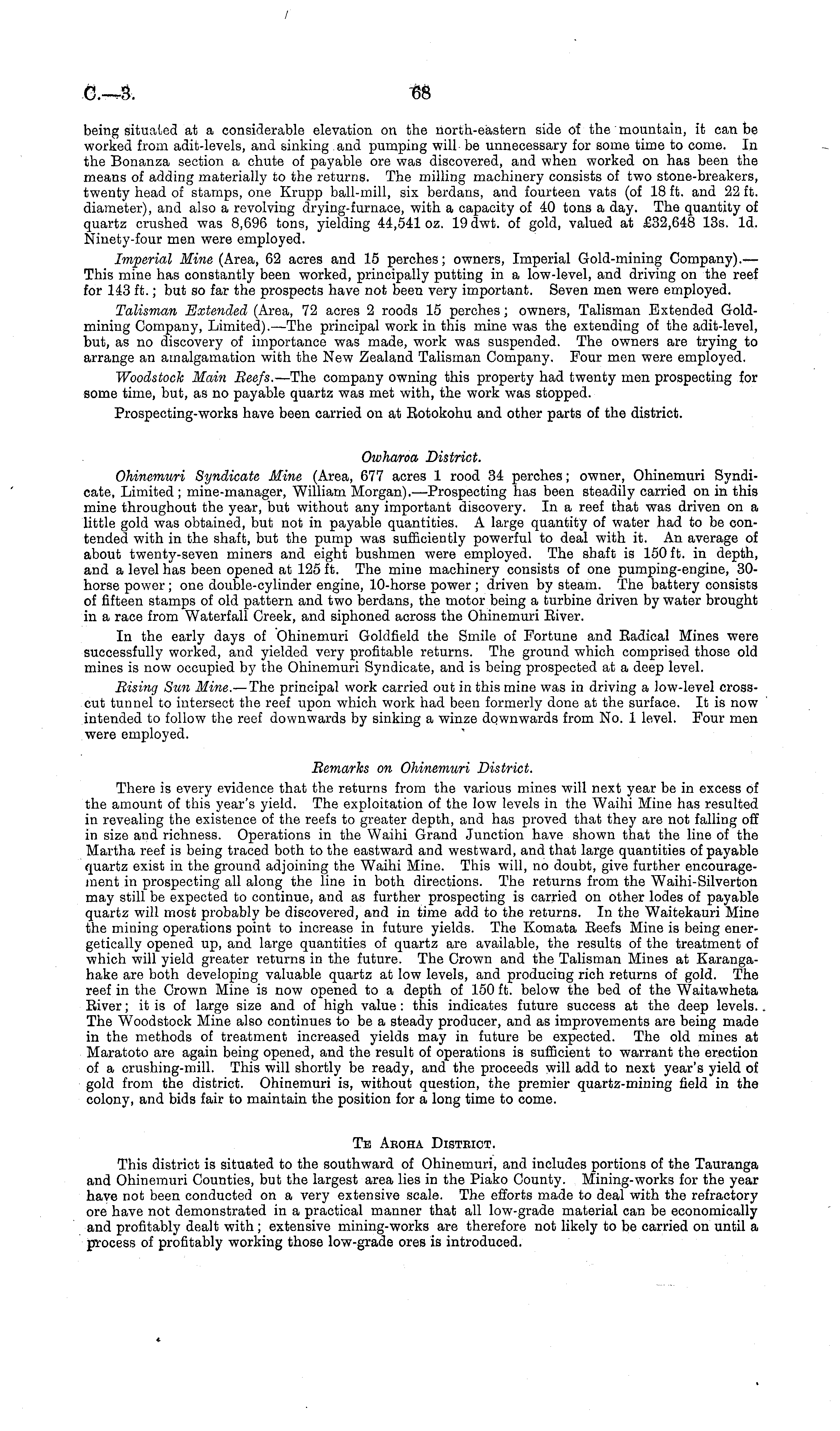 being situated at a considerable elevation on the north-eastern side of the mountain, it can be worked from adit-levels, and sinking and pumping will be unnecessary for some time to come. In the Bonanza section a chute of payable ore was discovered, and when worked on has been the means of adding materially to the returns. The milling machinery consists of two stone-breakers, twenty head of stamps, one Krupp ball-mill, six berdans, and fourteen vats (of 18 ft. and 22 ft. diameter), and also a revolving drying-furnace, with a capacity of 40 tons a day. The quantity of quartz crushed was 8,696 tons, yielding 44,541 oz. 19dwt. of gold, valued at £32,648 13s. Id. Ninety-four men were employed. Imperial Mine (Area, 62 acres and 15 perches; owners, Imperial Gold-mining Company).— This mine has constantly been worked, principally putting in a low-level, and driving on the reef for 143 ft.; but so far the prospects have not been very important. Seven men were employed. Talisman Extended (Area, 72 acres 2 roods 15 perches; owners, Talisman Extended Goldmining Company, Limited). —The principal work in this mine was the extending of the adit-level, but, as no discovery of importance was made, work was suspended. The owners are trying to arrange an amalgamation with the New Zealand Talisman Company. Four men were employed. Woodstock Main Beefs. —The company owning this property had twenty men prospecting for some time, but, as no payable quartz was met with, the work was stopped. Prospecting-works have been carried on at Eotokohu and other parts of the district. Owharoa District. Ohinemuri Syndicate Mine (Area, 677 acres 1 rood 34 perches; owner, Ohinemuri Syndicate, Limited ; mine-manager, William Morgan).—Prospecting has been steadily carried on in this mine throughout the year, but without any important discovery. In a reef that was driven on a little gold was obtained, but not in payable quantities. A large quantity of water had to be contended with in the shaft, but the pump was sufficiently powerful to deal with it. An average of about twenty-seven miners and eight bushmen were employed. The shaft is 150 fb. in depth, and a level has been opened at 125 ft. The mine machinery consists of one pumping-engine, 30--horse power; one double-cylinder engine, 10-horse power ; driven by steam. The battery consists of fifteen stamps of old pattern and two berdans, the motor being a turbine driven by water brought in a race from Waterfall Creek, and siphoned across the Ohinemuri Eiver. In the early days of Ohinemuri Goldfield the Smile of Fortune and Eadical Mines were successfully worked, and yielded very profitable returns. The ground which comprised those old mines is now occupied by the Ohinemuri Syndicate, and is being prospected at a deep level. Rising Sun Mine. —The principal work carried out in this mine was in driving a low-level crosscut tunnel to intersect the reef upon which work had been formerly done at the surface. It is now intended to follow the reef downwards by sinking a winze downwards from No. 1 level. Four men were employed. Remarks on Ohinemuri District. There is every evidence that the returns from the various mines will next year be in excess of the amount of this year's yield. The exploitation of the low levels in the Waihi Mine has resulted in revealing the existence of the reefs to greater depth, and has proved that they are not falling off in size and richness. Operations in the Waihi Grand Junction have shown that the line of the Martha reef is being traced both to the eastward and westward, and that large quantities of payable quartz exist in the ground adjoining the Waihi Mine. This will, no doubt, give further encouragement in prospecting all along the line in both directions. The returns from the Waihi-Silverton may still be expected to continue, and as further prospecting is carried on other lodes of payable quartz will most probably be discovered, and in time add to the returns. In the Waitekauri Mine the mining operations point to increase in future yields. The Komata Beefs Mine is being energetically opened up, and large quantities of quartz are available, the results of the treatment of which will yield greater returns in the future. The Crown and the Talisman Mines at Karangahake are both developing valuable quartz at low levels, and producing rich returns of gold. The reef in the Crown Mine is now opened to a depth of 150 ft. below the bed of the Waitawheta Eiver; it is of large size and of high value: this indicates future success at the deep levels. The Woodstock Mine also continues to be a steady producer, and as improvements are being made in the methods of treatment increased yields may in future be expected. The old mines at Maratoto are again being opened, and the result of operations is sufficient to warrant the erection of a crushing-mill. This will shortly be ready, and the proceeds will add to next year's yield of gold from the district. Ohinemuri is, without question, the premier quartz-mining field in the colony, and bids fair to maintain the position for a long time to come. Te Aeoha Disteict. This district is situated to the southward of Ohinemuri, and includes portions of the Tauranga and Ohinemuri Counties, but the largest area lies in the Piako County. Mining-works for the year have not been conducted on a very extensive scale. The efforts made to deal with the refractory ore have not demonstrated in a practical manner that all low-grade material can be economically and profitably dealt with; extensive mining-works are therefore not likely to be carried on until a process of profitably working those low-grade ores is introduced.