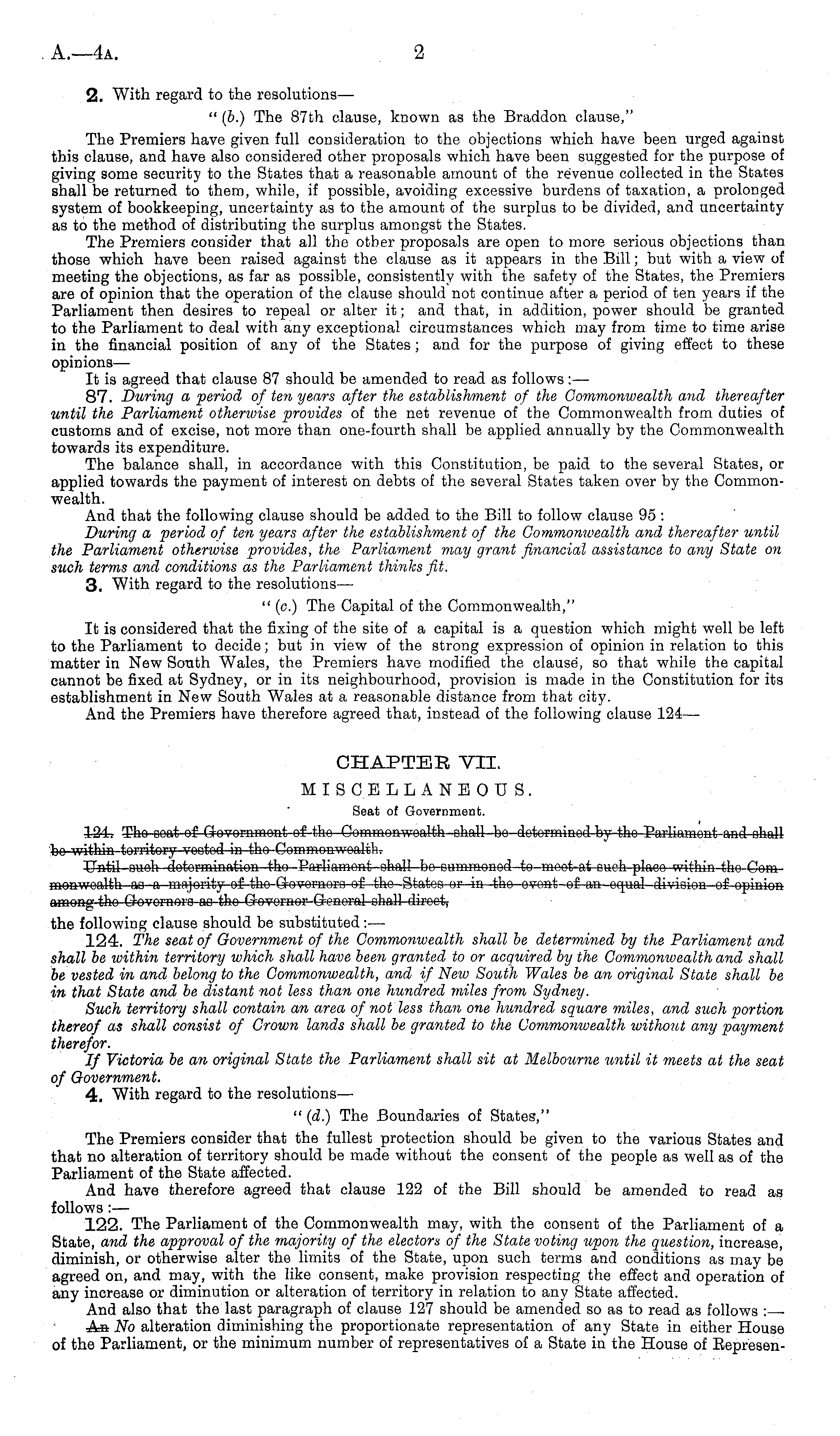 2. With regard to the resolutions — " (b.) The 87th clause, known as the Braddon clause," The Premiers have given full consideration to the objections which have been urged against this clause, and have also considered other proposals which have been suggested for the purpose of giving some security to the States that a reasonable amount of the revenue collected in the States shall be returned to them, while, if possible, avoiding excessive burdens of taxation, a prolonged system of bookkeeping, uncertainty as to the amount of the surplus to be divided, and uncertainty as to the method of distributing the surplus amongst the States. The Premiers consider that all the other proposals are open to more serious objections than those which have been raised against the clause as it appears in the Bill; but with a view of meeting the objections, as far as possible, consistently with the safety of the States, the Premiers are of opinion that the operation of the clause should not continue after a period of ten years if the Parliament then desires to repeal or alter it; and that, in addition, power should be granted to the Parliament to deal with any exceptional circumstances which may from time to time arise in the financial position of any of the States; and for the purpose of giving effect to these opinions— It is agreed that clause 87 should be amended to read as follows: — 87. During a period of ten years after the establishment of the Commonwealth and thereafter until the Parliament otherwise provides of the net revenue of the Commonwealth from duties of customs and of excise, not more than one-fourth shall be applied annually by the Commonwealth towards its expenditure. The balance shall, in accordance with this Constitution, be paid to the several States, or applied towards the payment of interest on debts of the several States taken over by the Commonwealth. And that the following clause should be added to the Bill to follow clause 95 : During a period of ten years after the establishment of the Commonwealth and thereafter until the Parliament otherwise provides, the Parliament may grant financial assistance to any State on such terms and conditions as the Parliament thinks fit. 3. With regard to the resolutions — " (c.) The Capital of the Commonwealth," It is considered that the fixing of the site of a capital is a question which might well be left to the Parliament to decide; but in view of the strong expression of opinion in relation to this matter in New South Wales, the Premiers have modified the clause, so that while the capital cannot be fixed at Sydney, or in its neighbourhood, provision is made in the Constitution for its establishment in New South Wales at a reasonable distance from that city. And the Premiers have therefore agreed that, instead of the following clause 124— CHAPTEE VII. MISCELLANEOUS. Seat of Government. 134r Tho ooat of Govornmont of feo Commonwoaltfa-ehall bo-dotorminod by4h6-Eariiaßieat-aad-ahall Virt -iiTi'rl'n'n Tr/trtt-nrl in -f-rir-v 1 .atvtit) j-\-n TTTAn It-n tjij \y HjlLLli—v&i- 1 ruvl y —T"t7t3lA_tLl rtrt exit* W V?ctttJn7 monwoalth ao a majerity-of tho Geyeraoaa-of tho among tho Govornora-aa-tho Govornor Geaoral ohall direct; the following clause should be substituted: —■ 124. The seat of Government of the Commonwealth shall be determined by the Parliament and shall be within territory which shall have been granted to or acquired by the Commonivealth and shall be vested in and belong to the Commonwealth, and if New South Wales be an original State shall be in that State and be distant not less than one hundred miles from Sydney. Such territory shall contain an area of not less than one hundred square miles, and such portion thereof as shall consist of Crown lands shall be granted to the Commonivealth without any payment therefor. If Victoria be an original State the Parliament shall sit at Melbourne until it meets at the seat of Government. 4. With regard to the resolutions— " (d.) The Boundaries of States," The Premiers consider that the fullest protection should be given to the various States and that no alteration of territory should be made without the consent of the people as well as of the Parliament of the State affected. And have therefore agreed that clause 122 of the Bill should be amended to read as follows: — 122. The Parliament of the Commonwealth may, with the consent of the Parliament of a State, and the approval of the majority of the electors of the State voting upon the question, increase, diminish, or otherwise alter the limits of the State, upon such terms and conditions as may be agreed on, and may, with the like consent, make provision respecting the effect and operation of any increase or diminution or alteration of territory in relation to any State affected. And also that the last paragraph of clause 127 should be amended so as to read as follows :—■ A& No alteration diminishing the proportionate representation of any State in either House of the Parliament, or the minimum number of representatives of a State in the House of Eepresen-