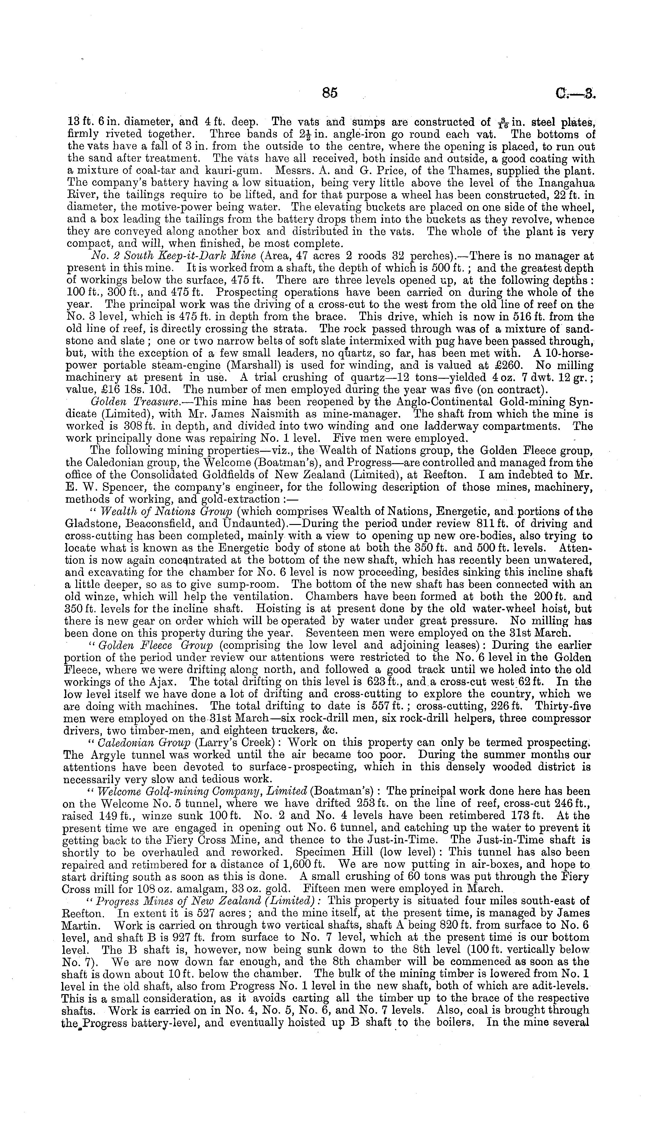 13 ft. 6 in. diameter, and 4 ft. deep. The vats and sumps are constructed of in. steel plates, firmly riveted together. Three bands of 2-J in. angle-iron go round each vat. The bottoms of the vats have a fall of 3 in. from the outside to the centre, where the opening is placed, to run out the sand after treatment. The vats have all received, both inside and outside, a good coating with a mixture of coal-tar and kauri-gum. Messrs. A. and G. Price, of the Thames, supplied the plant. The company's battery having a low situation, being very little above the level of the Inangahua Eiver, the tailings require to be lifted, and for that purpose a wheel has been constructed, 22 ft. in diameter, the motive-power being water. The elevating buckets are placed on one side of the wheel, and a box leading the tailings from the battery drops them into the buckets as they revolve, whence they are conveyed along another box and distributed in the vats. The whole of the plant is very compact, and will, when finished, be most complete. No. 2 South Keep-it-Dark Mine (Area, 47 acres 2 roods 32 perches).—There is no manager at present in this mine. It is worked from a shaft, the depth of which is 500 ft. ; and the greatest depth of workings below the surface, 475 ft. There are three levels opened up, at the following depths : 100 ft., 300 ft., and 475 ft. Prospecting operations have been carried on during the whole of the year. The principal work was the driving of a cross-cut to the west from the old line of reef on the No. 3 level, which is 475 ft. in depth from the brace. This drive, which is now in 516 ft. from the old line of reef, is directly crossing the strata. The rock passed through was of a mixture of sandstone and slate ; one or two narrow belts of soft slate intermixed with pug have been passed through, but, with the exception of a few small leaders, no quartz, so far, has been met with. A 10-horse-power portable steam-engine (Marshall) is used for winding, and is valued at £260. No milling machinery at present in use. A trial crushing of quartz —12 tons —yielded 4 oz. 7 dwt. 12 gr.; value, £16 18s. lOd. The number of men employed during the year was five (on contract). Golden Treasure. —This mine has been reopened by the Anglo-Continental Gold-mining Syndicate (Limited), with Mr. James Naismith as mine-manager. The shaft from which the mine is worked is 308 ft. in depth, and divided into two winding and one ladderway compartments. The work principally done was repairing No. 1 level. Five men were employed. The following mining properties—viz., the Wealth of Nations group, the Golden Fleece group, the Caledonian group, the Welcome (Boatman's), and Progress—are controlled and managed from the office of the Consolidated Goldfields of New Zealand (Limited), at Eeefton. lam indebted to Mr. E. W. Spencer, the company's engineer, for the following description of those mines, machinery, methods of working, and gold-extraction : — " Wealth of Nations Group (which comprises Wealth of Nations, Energetic, and portions of the Gladstone, Beaconsfield, and Undaunted). —During the period under review 811 ft. of driving and cross-cutting has been completed, mainly with a view to opening up new ore-bodies, also trying to locate what is known as the Energetic body of stone at both the 350 ft. and 500 ft. levels. Attention is now again concentrated at the bottom of the new shaft, which has recently been unwatered, and excavating for the chamber for No. 6 level is now proceeding, besides sinking this incline shaft a little deeper, so as to give sump-room. The bottom of the new shaft has been connected with an old winze, which will help the ventilation. Chambers have been formed at both the 200 ft. and 350 ft. levels for the incline shaft. Hoisting is at present done by the old water-wheel hoist, but there is new gear on order which will be operated by water under great pressure. No milling has been done on this property during the year. Seventeen men were employed on the 31st March. " Golden Fleece Group (comprising the low level and adjoining leases): During the earlier portion of the period under review our attentions were restricted to the No. 6 level in the Golden Fleece, where we were drifting along north, and followed a good track until we holed into the old workings of the Ajax. The total drifting on this level is 623 ft., and.a cross-cut west 62 ft. In the low level itself we have done a lot of drifting and cross-cutting to explore the country, which we are doing with machines. The total drifting to date is 557 ft. ; cross-cutting, 226 ft. Thirty-five men were employed on the 31st March—six rock-drill men, six rock-drill helpers, three compressor drivers, two timber-men, and eighteen truckers, &c. " Caledonian Group (Larry's Creek): Work on this property can only be termed prospecting. The Argyle tunnel was worked until the air became too poor. During the summer months our attentions have been devoted to surf ace - prospecting, which in this densely wooded district is necessarily very slow and tedious work. " Welcome Gold-mining Company, Limited (Boatman's) : The principal work done here has been on the Welcome No. 5 tunnel, where we have drifted 253 fc. on the line of reef, cross-cut 246 ft., raised 149 ft., winze sunk 100 ft. No. 2 and No. 4 levels have been retimbered 173 ft. At the present time we are engaged in opening out No. 6 tunnel, and catching up the water to prevent it getting back to the Fiery Cross Mine, and thence to the Just-in-Time. The Just-in-Time shaft is shortly to be overhauled and reworked. Specimen Hill (low level) : This tunnel has also been repaired and retimbered for a distance of 1,600 ft. We are now putting in air-boxes, and hope to start drifting south as soon as this is done. A small crushing of 60 tons was put through the Fiery Cross mill for 108 oz. amalgam, 33 oz. gold. Fifteen men were employed in March. " Progress Mines of New Zealand (Limited) : This p