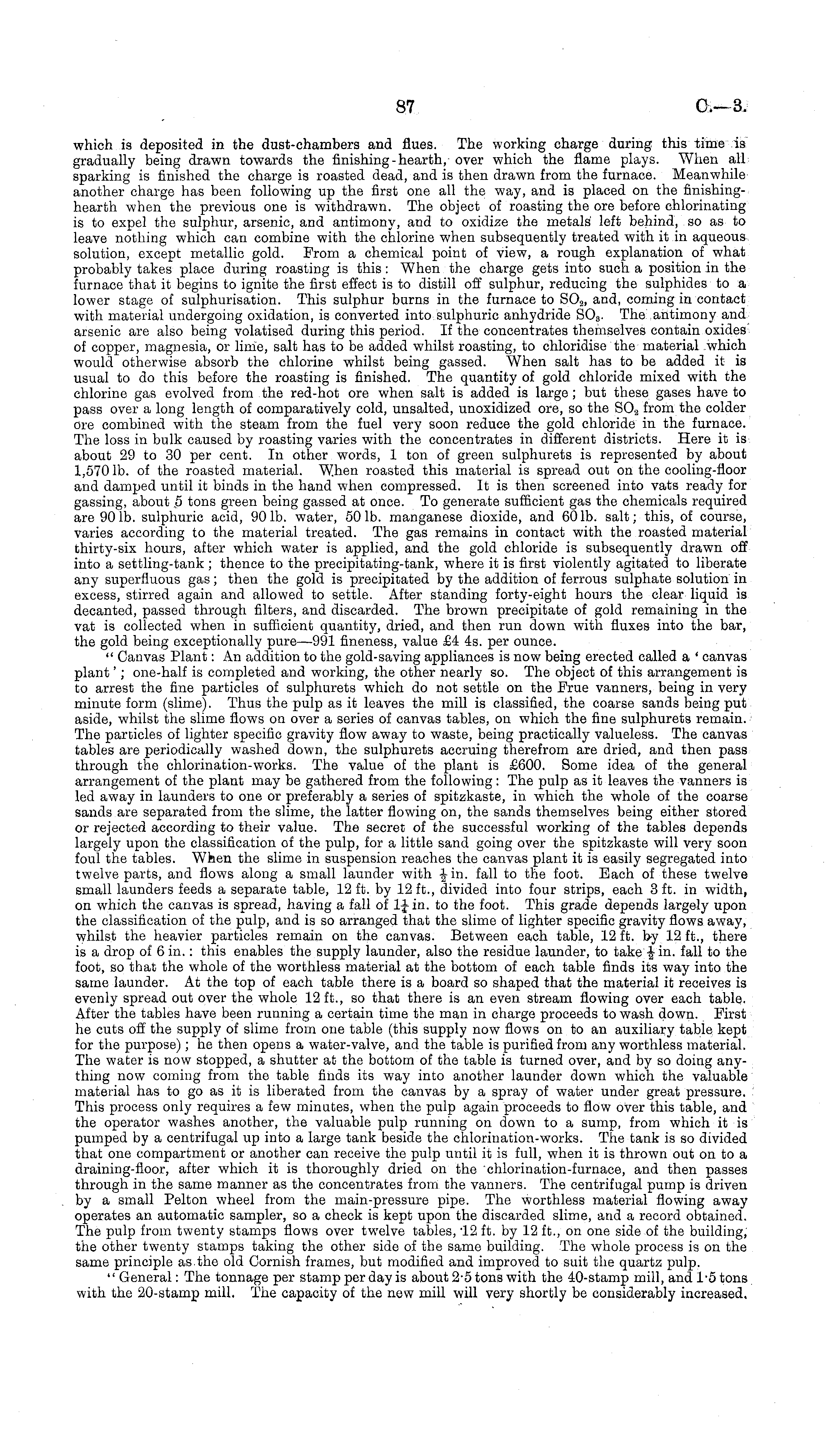 which is deposited in the dust-chambers and flues. The working charge during this time is gradually being drawn towards the finishing-hearth, over which the flame plays. When all sparking is finished the charge is roasted dead, and is then drawn from the furnace. Meanwhile another charge has been following up the first one all the way, and is placed on the finishinghearth when the previous one is withdrawn. The object of roasting the ore before chlorinating is to expel the sulphur, arsenic, and antimony, and to oxidize the metals left behind, so as to leave nothing which can combine with the chlorine when subsequently treated with it in aqueous solution, except metallic gold. From a chemical point of view, a rough explanation of what probably takes place during roasting is this : When the charge gets into such a position in the furnace that it begins to ignite the first effect is to distill off sulphur, reducing the sulphides to a lower stage of sulphurisation. This sulphur burns in the furnace to S0 2 , and, coming in contact with material undergoing oxidation, is converted into sulphuric anhydride SO s . The antimony and arsenic are also being volatised during this period. If the concentrates themselves contain oxides of copper, magnesia, or lime, salt has to be added whilst roasting, to chloridise the material which would otherwise absorb the chlorine whilst being gassed. When salt has to be added it is usual to do this before the roasting is finished. The quantity of gold chloride mixed with the chlorine gas evolved from the red-hot ore when salt is added is large; but these gases have to pass over a long length of comparatively cold, unsalted, unoxidized ore, so the S0 2 from the colder ore combined with the steam from the fuel very soon reduce the gold chloride in the furnace. The loss in bulk caused by roasting varies with the concentrates in different districts. Here it is about 29 to 30 per cent. In other words, 1 ton of green sulphurets is represented by about 1,5701b. of the roasted material. When roasted this material is spread out on the cooling-floor and damped until it binds in the hand when compressed. It is then screened into vats ready for gassing, about .5 tons green being gassed at once. To generate sufficient gas the chemicals required are 90 lb. sulphuric acid, 90 lb. water, 50 lb. manganese dioxide, and 60 lb. salt; this, of course, varies according to the material treated. The gas remains in contact with the roasted material thirty-six hours, after which water is applied, and the gold chloride is subsequently drawn off into a settling-tank ; thence to the precipitating-tank, where it is first violently agitated to liberate any superfluous gas; then the gold is precipitated by the addition of ferrous sulphate solution in excess, stirred again and allowed to settle. After standing forty-eight hours the clear liquid is decanted, passed through filters, and discarded. The brown precipitate of gold remaining in the vat is collected when in sufficient quantity, dried, and then run down with fluxes into the bar, the gold being exceptionally pure—99l fineness, value £4 4s. per ounce. " Canvas Plant: An addition to the gold-saving appliances is now being erected called a ' canvas plant' ; one-half is completed and working, the other nearly so. The object of this arrangement is to arrest the fine particles of sulphurets which do not settle on the Frue vanners, being in very minute form (slime). Thus the pulp as it leaves the mill is classified, the coarse sands being put aside, whilst the slime flows on over a series of canvas tables, on which the fine sulphurets remain. The particles of lighter specific gravity flow away to waste, being practically valueless. The canvas tables are periodically washed down, the sulphurets accruing therefrom are dried, and then pass through the chlorination-works. The value of the plant is £600. Some idea of the general arrangement of the plant may be gathered from the following: The pulp as it leaves the vanners is led away in launders to one or preferably a series of spitzkaste, in which the whole of the coarse sands are separated from the slime, the latter flowing on, the sands themselves being either stored or rejected according to their value. The secret of the successful working of the tables depends largely upon the classification of the pulp, for a little sand going over the spitzkaste will very soon foul the tables. When the slime in suspension reaches the canvas plant it is easily segregated into twelve parts, and flows along a small launder with Jin. fall to the foot. Each of these twelve small launders feeds a separate table, 12 ft. by 12 ft., divided into four strips, each 3 ft. in width, on which the canvas is spread, having a fall of 1J in. to the foot. This grade depends largely upon the classification of the pulp, and is so arranged that the slime of lighter specific gravity flows away, whilst the heavier particles remain on the canvas. Between each table, 12 ft. by 12 ft., there is a drop of 6 in.: this enables the supply launder, also the residue launder, to take \ in. fall to the foot, so that the whole of the worthless material at the bottom of each table finds its way into the same launder. At the top of each table there is a board so shaped that the material it receives is evenly spread out over the whole 12 ft., so that there is an even stream flowing over each table. After the tables have been running a certain time the man in charge proceeds to wash down. First he cuts off the supply of slime from one table (this supply now flows on to an auxiliary table kept for the purpose); he then opens a water-valve, and the table is purified from any worthless material. The water is now stopped, a shutter at the bottom of the table is turned over, and by so doing anything now coming from the table finds its way into another launder down which the valuable material has to go as it is liberated from the canvas by a spray of 
