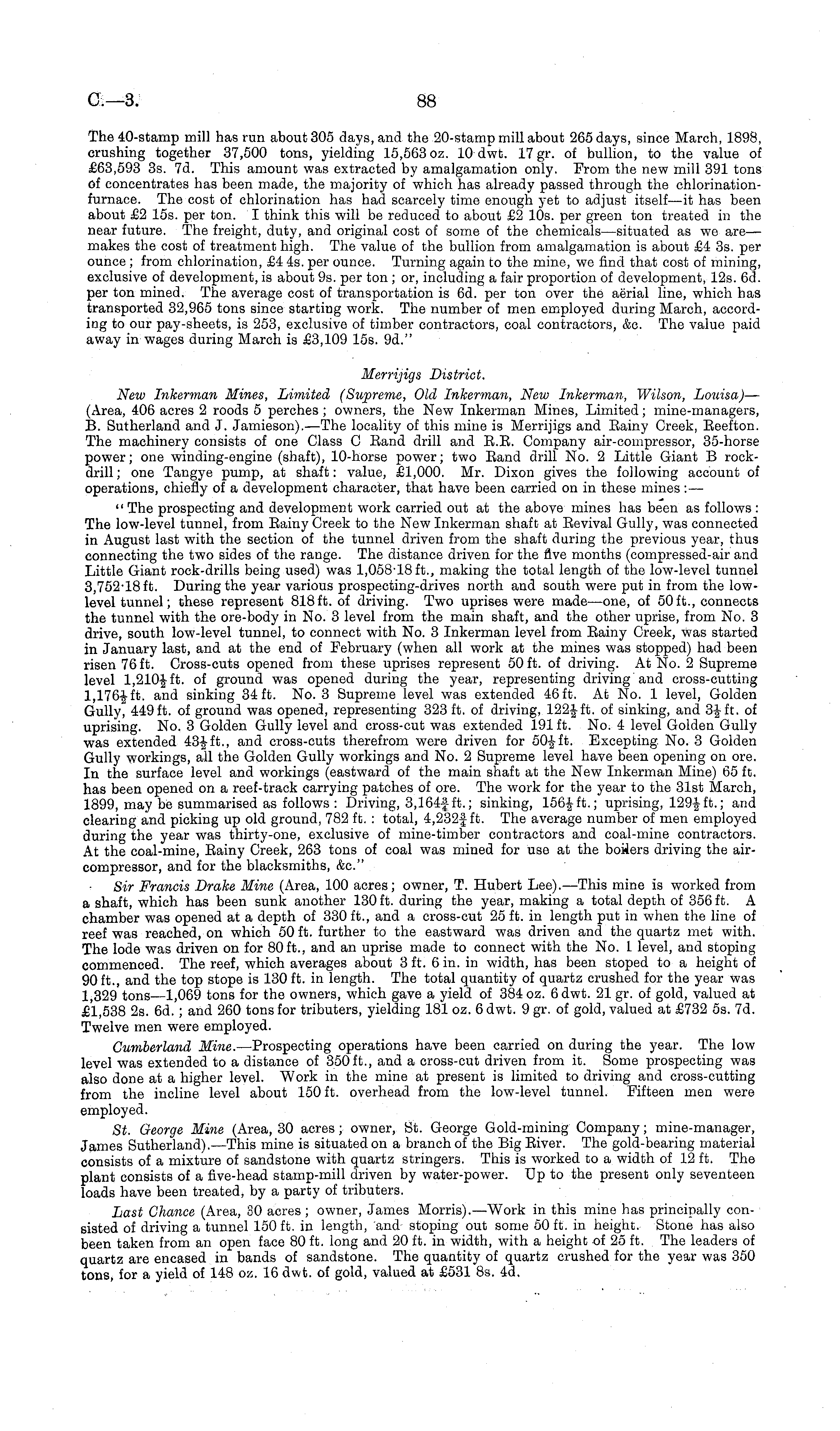 The 40-stamp mill has run about 305 days, and the 20-stamp mill about 265 days, since March, 1898, crushing together 37,500 tons, yielding 15,563 oz. 10 dwt. 17 gr. of bullion, to the value of £63,593 3s. 7d. This amount was extracted by amalgamation only. Prom the new mill 391 tons of concentrates has been made, the majority of which has already passed through the chlorinationfurnace. The cost of chlorination has had scarcely time enough yet to adjust itself—it has been about £2 15s. per ton. I think this will be reduced to about £2 10s. per green ton treated in the near future. The freight, duty, and original cost of some of the chemicals —situated as we are—■ makes the cost of treatment high. The value of the bullion from amalgamation is about £4 3s. per ounce ; from chlorination, £4 4s. per ounce. Turning again to the mine, we find that cost of mining, exclusive of development, is about 9s. per ton ; or, including a fair proportion of development, 12s. 6d. per ton mined. The average cost of transportation is 6d. per ton over the aerial line, which has transported 32,965 tons since starting work. The number of men employed during March, according to our pay-sheets, is 253, exclusive of timber contractors, coal contractors, &c. The value paid away in wages during March is £3,109 15s. 9d." Merrijigs District. New Inkerman Mines, Limited (Supreme, Old Inkerman, New Inkerman, Wilson, Louisa) — (Area, 406 acres 2 roods 5 perches ; owners, the New Inkerman Mines, Limited; mine-managers, B. Sutherland and J. Jamieson). —The locality of this mine is Merrijigs and Eainy Creek, Eeefton. The machinery consists of one Class C Rand drill and E.E. Company air-compressor, 35-horse power; one winding-engine (shaft), 10-horse power; two Eand drill No. 2 Little Giant B rockdrill; one Tangye pump, at shaft: value, £1,000. Mr. Dixon gives the following account of operations, chiefly of a development character, that have been carried on in these mines: — " The prospecting and development work carried out at the above mines has been as follows : The low-level tunnel, from Eainy Creek to the New Inkerman shaft at Eevival Gully, was connected in August last with the section of the tunnel driven from the shaft during the previous year, thus connecting the two sides of the range. The distance driven for the five months (compressed-air and Little Giant rock-drills being used) was 1,058'18ft., making the total length of the low-level tunnel 3,752-18 ft. During the year various prospecting-drives north and south were put in from the lowlevel tunnel; these represent 818 ft. of driving. Two uprises were made—one, of 50 ft., connects the tunnel with the ore-body in No. 3 level from the main shaft, and the other uprise, from No. 3 drive, south low-level tunnel, to connect with No. 3 Inkerman level from Eainy Creek, was started in January last, and at the end of February (when all work at the mines was stopped) had been risen 76 ft. Cross-cuts opened from these uprises represent 50 ft. of driving. At No. 2 Supreme level 1,210f ft. of ground was opened during the year, representing driving and cross-cutting 1,176-J-ft. and sinking 34 ft. No. 3 Supreme level was extended 46 ft. At No. 1 level, Golden Gully, 449 ft. of ground was opened, representing 323 ft. of driving, 122-J-ft. of sinking, and 3Jft. of uprising. No. 3 Golden Gully level and cross-cut was extended 191 ft. No. 4 level Golden Gully was extended 43^-ft., and cross-cuts therefrom were driven for 50-g-ft. Excepting No. 3 Golden Gully workings, all the Golden Gully workings and No. 2 Supreme level have been opening on ore. In the surface level and workings (eastward of the main shaft at the New Inkerman Mine) 65 ft. has been opened on a reef-track carrying patches of ore. The work for the year to the 31st March, 1899, may be summarised as follows : Driving, 3,164f ft.; sinking, 156|ft.; uprising, 129|ft.; and clearing and picking up old ground, 782 ft. : total, 4,232f ft. The average number of men employed during the year was thirty-one, exclusive of mine-timber contractors and coal-mine contractors. At the coal-mine, Eainy Creek, 263 tons of coal was mined for use at the boilers driving the aircompressor, and for the blacksmiths, &c." Sir Francis Drake Mine (Area, 100 acres; owner, T. Hubert Lee). —This mine is worked from a shaft, which has been sunk another 130 ft. during the year, making a total depth of 356 ft. A chamber was opened at a depth of 330 ft., and a cross-cut 25 ft. in length put in when the line of reef was reached, on which 50 ft. further to the eastward was driven and the quartz met with. The lode was driven on for 80 ft., and an uprise made to connect with the No. 1 level, and stoping commenced. The reef, which averages about 3 ft. 6 in. in width, has been stoped to a height of 90 ft., and the top stope is 130 ft. in length. The total quantity of quartz crushed for the year was 1,329 tons —1,069 tons for the owners, which gave a yield of 384 oz. 6 dwt. 21 gr. of gold, valued at £1,538 2s. 6d.; and 260 tons for tributers, yielding 181 oz. 6 dwt. 9 gr. of gold, valued at £732 ss. 7d. Twelve men were employed. Cumberland Mine. —Prospecting operations have been carried on during the year. The low level was extended to a distance of 350 ft., and a cross-cut driven from it. Some prospecting was also done at a higher level. Work in the mine at present is limited to driving and cross-cutting from the incline level about 150 ft. overhead from the low-level tunnel. Fifteen men were employed. St. George Mine (Area, 30 acres; owner, St. George Gold-mining Company; mine-manager, James Sutherland). —This mine is situated on a branch of the Big Eiver. The gold-bearing material consists of a mixture of sandstone with quartz stringers. This is worked to a width of 12 ft. The plant consists of a five-head stamp-mill driven by water-power. Up to the present only seventeen loads have been treated, by a party of tributers. Last