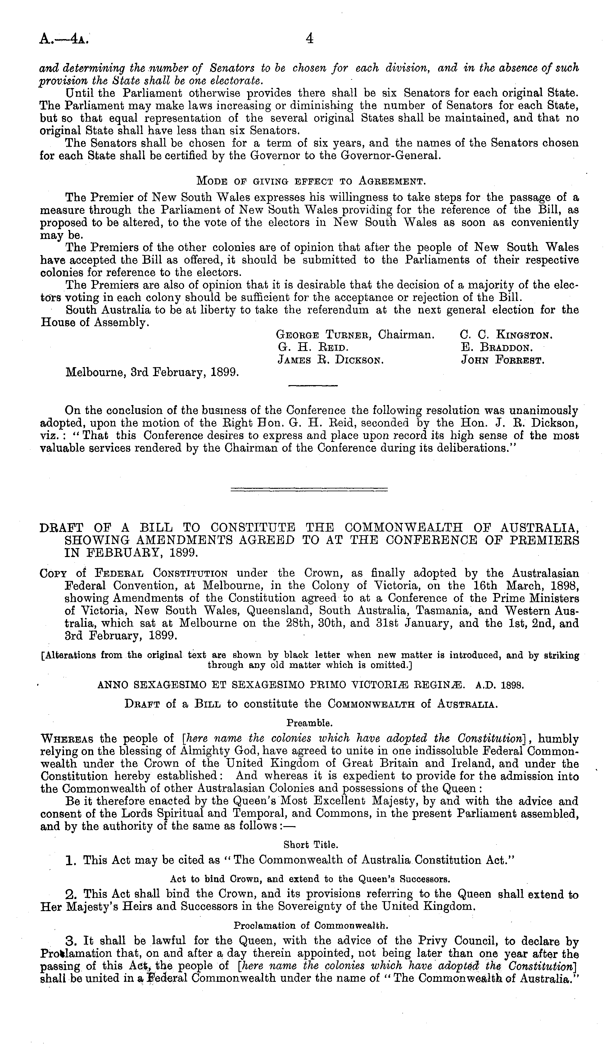 and determining the number of Senators to be chosen for each division, and in the absence of such provision the State shall be one electorate. Until the Parliament otherwise provides there shall be six Senators for each original State. The Parliament may make laws increasing or diminishing the number of Senators for each State, but so that equal representation of the several original States shall be maintained, and that no original State shall have less than six Senators. The Senators shall be chosen for a term of six years, and the names of the Senators chosen for each State shall be certified by the Governor to the Governor-General. Mode of giving effect to Ageeement. The Premier of New South Wales expresses his willingness to take steps for the passage of a measure through the Parliament of New South Wales providing for the reference of the Bill, as proposed to be altered, to the vote of the electors in New South Wales as soon as conveniently may be. The Premiers of the other colonies are of opinion that after the people of New South Wales have accepted the Bill as offered, it should be submitted to the Parliaments of their respective colonies for reference to the electors. The Premiers are also of opinion that it is desirable that the decision of a majority of the electors voting in each colony should be sufficient for the acceptance or rejection of the Bill. South Australia to be at liberty to take the referendum at the next general election for the House of Assembly. George Turner, Chairman. C. C. Kingston. G. H. Eeid. E. Braddon. James E. Dickson. John Forrest. Melbourne, 3rd February, 1899. On the conclusion of the business of the Conference the following resolution was unanimously adopted, upon the motion of the Eight Hon. G. H. Eeid, seconded by the Hon. J. E. Dickson, viz. : " That this Conference desires to express and place upon record its high sense of the most valuable services rendered by the Chairman of the Conference during its deliberations."
