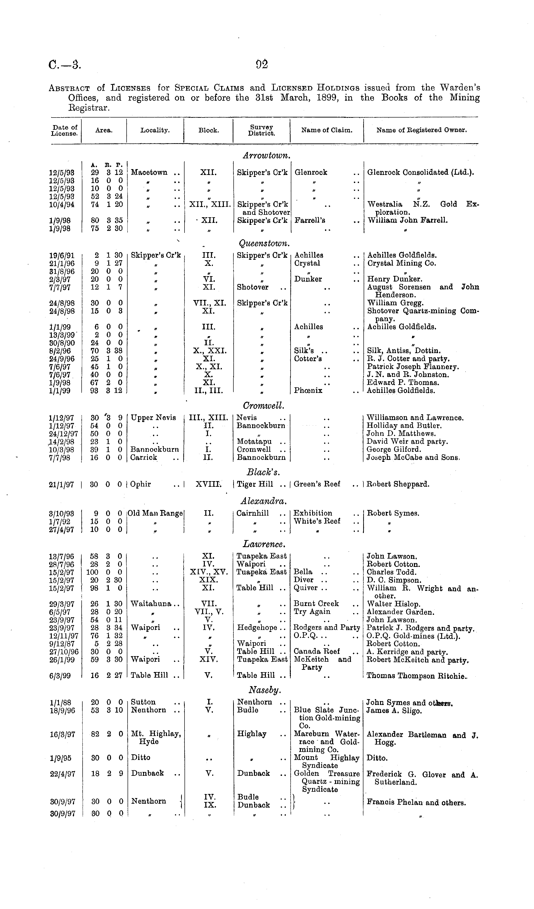 Date of License. Area. Locality. Block. Survey District. Name of Claim. Name of Begistered Owner. Arrowtown. A. E. p. 29 3 12 16 0 0 10 0 0 52 3 24 74 1 20 Skipper's Cr'k Glenrock Consolidated (Ltd.). 12/5/93 12/5/93 12/5/93 12/5/93 10/4/94 Macetown .. XII. Glenrock a • • u XII.," XIII. Skipper's Cr'k and Shotover Skipper's Gr'k Westralia N.Z. Gold Exploration. William John Farrell. 1/9/98 1/9/98 80 3 35 75 2 30 • XII. Farrell's a .. * 2 1 30 9 1 27 20 0 0 20 0 0 12 1 7 % Queenstown. Achilles Crystal Achilles Goldfields. Crystal Mining Co. 19/6/91 21/1/96 31/8/96 2/3/97 7/7/97 Skipper's Cr'k III. X. VI. XI. Skipper's Or'k Shotover Dunker Henry Dunker. August Sorensen and John Henderson. William Gregg. Shotover Quartz-mining Com24/8/98 24/8/98 30 0 0 15 0 3 VII., XI. XI. Skipper's Cr'k 1/1/99 13/3/99 30/8/90 8/2/96 24/9/96 7/6/97 7/6/97 1/9/98 1/1/99 6 0 0 2 0 0 24 0 0 70 3 38 25 1 0 45 1 0 40 0 0 67 2 0 93 3 12 III. 0 Achilles pany. Achilles Goldfields. n a II. X., XXI. XI. X., XI. X. XI. II., III. Silk's .. '.'. Cotter's » Silk, Antiss, Dottin. R. J. Cotter and party. Patrick Joseph Flannery. J. N. and R. Johnston. Edward P. Thomas. Achilles Goldfields. n Phoenix 30 '3 9 54 0 0 50 0 0 23 1 0 39 1 0 16 0 0 Upper Nevis Cromwell. Williamson and Lawrence. Holliday and Butler. John D. Matthews. David Weir and party. George Gilford. Joseph McCabe and Sons. 1/12/97 1/12/97 24/12/97 ,14/2/98 10/3/98 7/7/98 III., XIII. II. I. Nevis Bannookburn Motatapu .. Cromwell Bannookburn Bannookburn Carrick i. II. 30 0 0 XVIII. Black's. Green's Reef 21/1/97 1 Ophir Tiger Hill .. | Robert Sheppard. 3/10/93 1/7/92 27/4/97 9 0 0 15 0 0 10 0 0 jOld Man Range Alexandra. Exhibition White's Reef .. Robert Symes. II. Cairnhill 58 3 0 28 2 0 100 0 0 20 2 30 98 1 0 XI. IV. XIV., XV. XIX. XI. Lawrence. John Lawson. Robert Cotton. Charles Todd. D. C. Simpson. William R. Wright and another. Walter Hislop. Alexander Garden. John Lawson. Patrick J. Rodgers and party, O.P.Q. Gold-mines (Ltd.). Robert Cotton. A. Kerridge and party. Robert McKeitch and party. 13/7/96 28/7/96 15/2/97 15/2/97 15/2/97 Tuapeka East Waipori Tuapeka East Bella Diver Quiver Table Hill .. 29/3/97 6/5/97 23/9/97 23/9/97 12/11/97 9/12/87 27/10/96 26/1/99 26 1 30 28 0 20 54 0 11 28 3 34 76 1 32 5 2 28 30 0 0 59 3 30 Waitahuna .. H VII. VII., V. V. IV. Burnt Creek Try Again Waipori Hedgehope .. Rodgers and Party O.P.Q Waipori V. XIV. Waipori Table Hill .. Tuapeka East Canada Reef McKeitch and Party 6/3/99 16 2 27 Table Hill .. V. Table Hill .. Thomas Thompson Ritchie20 0 0 53 3 10 Sutton Nenthorn .. I. V. Naseby. 1/1/88 18/9/96 16/3/97 82 2 0 Mt. Highlay, Hyde Nenthorn .. Budle Highlay Blue Slate Junction Gold-mining Co. Mareburn Waterrace and Goldmining Co. Mount Highlay Syndicate Golden Treasure Quartz - mining Syndicate John Symes and others. James A. Sligo. Alexander Bartleman and J. Hogg. 1/9/95 30 0 0 Ditto Ditto. 22/4/97 18 2 9 Dunback V. Dunback Frederiok G. Glover and A. Sutherland. 30/9/97 30 0 0 Nenthorn \ IV. IX. Budle Dunback 1 J Franois Phelan and others. 30/9/97 30 0 0