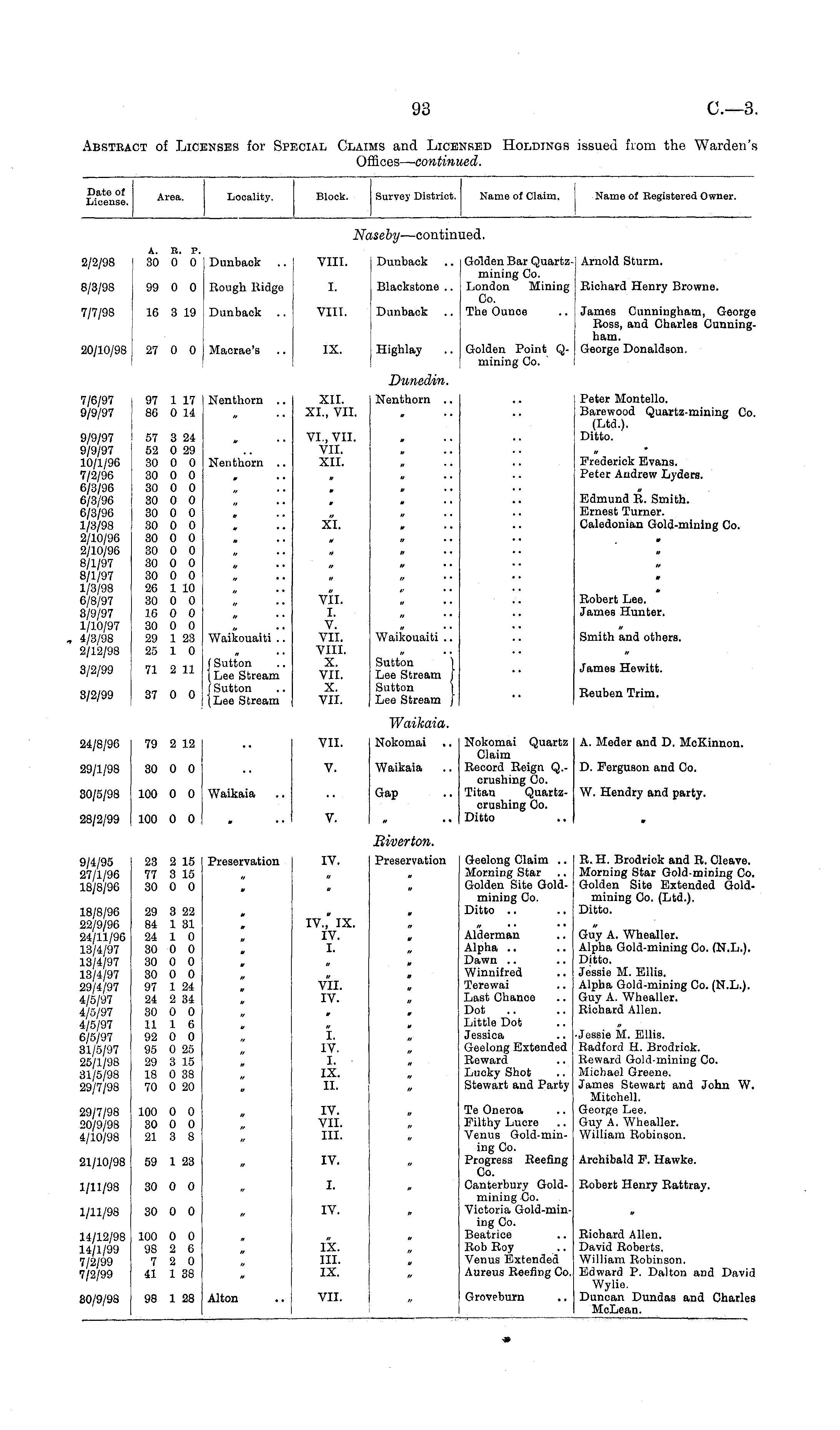 Date of License. Area. Locality. Block. Survey District. Name of Claim, Name of Registered Owner. Nt iseby —contin led. 2/2/98 A. B. P. 30 0 0 Dunback VIII. Dunback Golden Bar Quartzmining Co. London Mining Co. The Ounoe Arnold Sturm. 8/3/98 99 0 0 Rough Ridge I. Blackstone .. Richard Henry Browne. 7/7/98 20/10/98 16 3 19 27 0 0 Dunback Macrae's VIII. IX. Dunback Highlay Golden Point Qmining Co. James Cunningham, George Ross, and Charles Cunningham. George Donaldson. 7/6/97 9/9/97 97 1 17 86 0 14 Nenthorn .. XII. XL, VII. Dunedin. Peter Montello. Barewood Quartz-mining Co. (Ltd.). Ditto. Nenthorn .. 9/9/97 9/9/97 10/1/96 7/2/96 6/3/96 6/3/96 6/3/96 1/3/98 2/10/96 2/10/96 8/1/97 8/1/97 1/3/98 6/8/97 3/9/97 1/10/97 4/3/98 2/12/98 57 3 24 52 0 29 30 0 0 30 0 0 30 0 0 30 0 0 30 0 0 30 0 0 30 0 0 30 0 0 30 0 0 30 0 0 26 1 10 30 0 0 16 0 0 30 0 0 29 1 23 25 1 0 Nenthorn .. VI., VII. VII. XII. Frederick Evans. Peter Andrew Lyders. x"i. Edmund R. Smith. Ernest Turner. Caledonian Gold-mining Co. * . • u H Waikouaiti .. (Sutton |Lee Stream J Sutton |Lee Stream VII. I. V. VII. VIII. X. VII. X. VII. Waikouaiti .. Sutton ) Lee Stream J Sutton j Lee Stream J Robert Lee. James Hunter. Smith and others. 3/2/99 71 2 11 James Hewitt. 3/2/99 37 0 0 Reuben Trim. 79 2 12 VII. Waikaia. Nokomai Quartz Claim Record Reign Q.crushing Co. Titan Quartzcrushing Co. Ditto A. Meder and D. McKinnon. 14/8/96 Nokomai 19/1/98 30 0 0 V. Waikaia D. Ferguson and Oo. 10/5/98 100 0 0 Waikaia Gap W. Hendry and party. 18/2/99 100 0 0 » . • V. V IV. Biverton. Geelong Claim .. Morning Star Golden Site Goldmining Co. Ditto R. H. Brodrick and R. Cleave. Morning Star Gold-mining Co. Golden Site Extended Goldmining Oo. (Ltd.). Ditto. 1/4/95 17/1/96 .8/8/96 23 2 15 77 3 15 30 0 0 Preservation Preservation :8/8/96 12/9/96 14/11/96 .3/4/97 .3/4/97 .3/4/97 19/4/97 75/97 75/97 75/97 75/97 11/5/97 15/1/98 11/5/98 19/7/98 29 3 22 84 1 31 24 1 0 30 0 0 30 0 0 30 0 0 97 1 24 24 2 34 30 0 0 11 1 6 92 0 0 95 0 25 29 3 15 18 0 38 70 0 20 IV, IX. IV. I. VII. IV. *> a u Alderman Alpha Dawn Winnifred Terewai Last Chance Dot Little Dot Jessica Geelong Extended Reward Lucky Shot Stewart and Party Guy A. Whealler. Alpha Gold-mining Co. (N.L.). Ditto. Jessie M. Ellis. Alpha Gold-mining Co. (N.L.). Guy A. Whealler. Richard Allen. I. IV. I. IX. II. •Jessie M. Ellis. Radford H. Brodriok. Reward Gold-mining Co. Michael Greene. James Stewart and John W. Mitchell. George Lee. Guy A. Whealler. William Robinson. 19/7/98 10/9/98 710/98 100 0 0 30 0 0 21 3 8 IV. VII. III. Te Oneroa Filthy Lucre Venus Gold-min-ing Co. Progress Reefing Co. Canterbury Goldmining Co. Victoria Gold-min-ing Co. Beatrice Rob Roy Venus Extended Aureus Reefing Co. 11/10/98 59 1 23 IV. Archibald F. Hawke. ./11/98 30 0 0 I. Robert Henry Rattray. ./11/98 30 0 0 IV. .4/12/98 .4/1/99 72/99 72/99 100 0 0 98 2 6 7 2 0 41 1 38 IX. III. IX. Richard Allen. David Roberts. William Robinson. Edward P. Dalton and David Wylie. Duncan Dundas and Charles McLean. 10/9/98 98 1 28 Alton VII. Groveburn <•