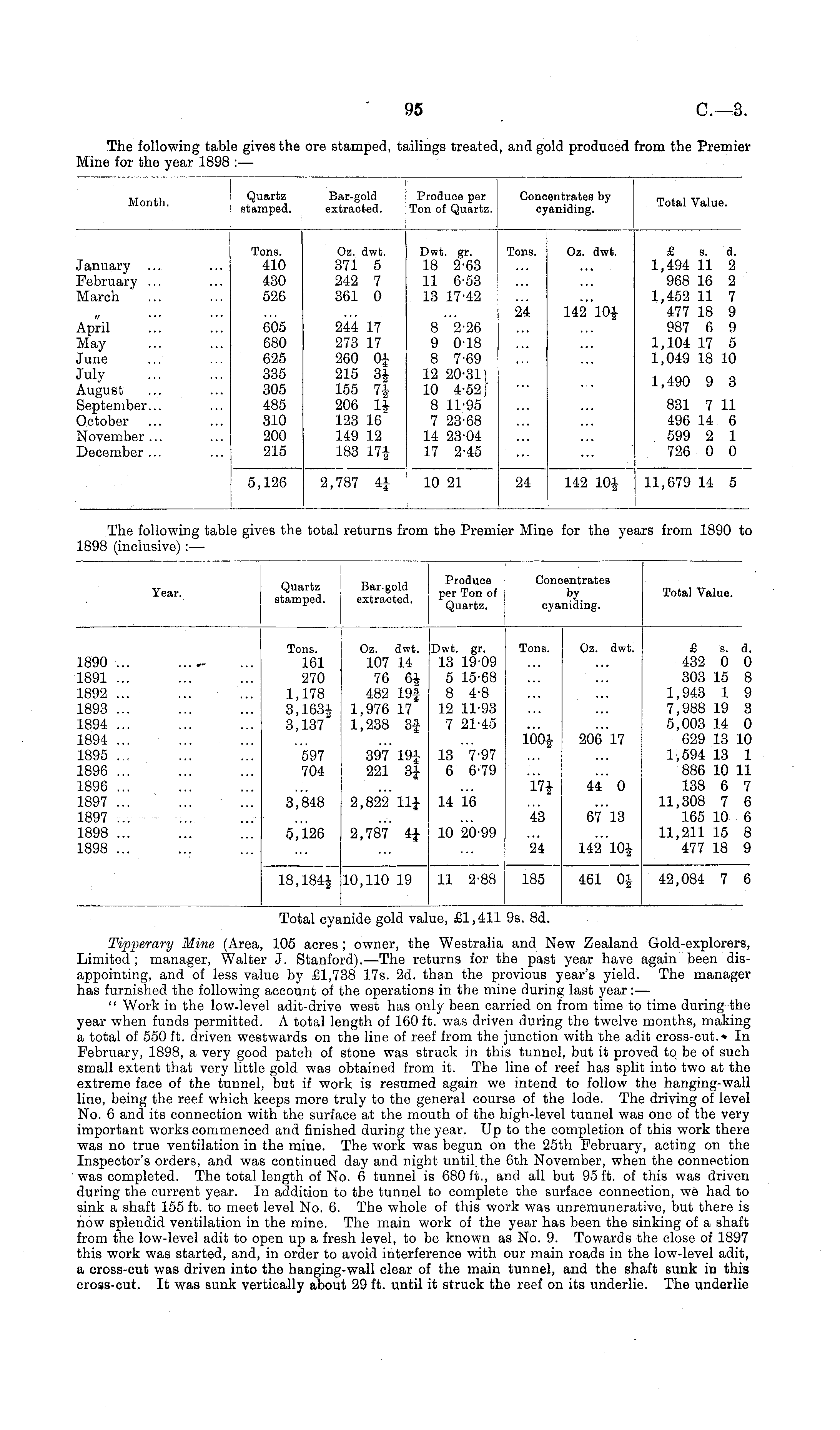 The following table gives the ore stamped, tailings treated, and gold produced from the Premier Mine for the year 1898: —