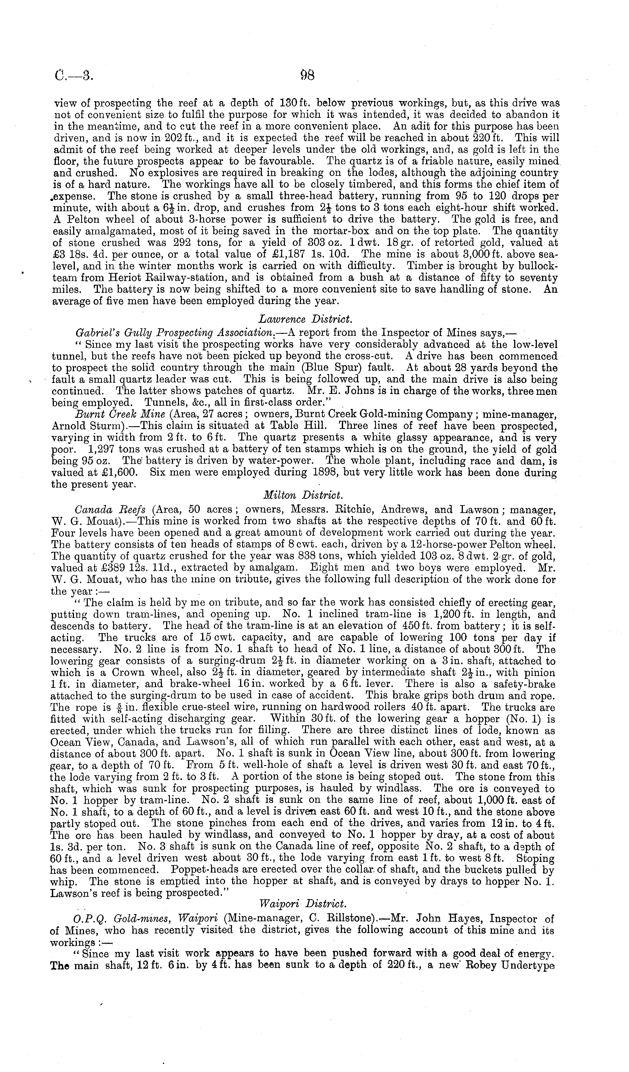 view of prospecting the reef at a depth of 130 ft. below previous workings, but, as this drive was not of convenient size to fulfil the purpose for which it was intended, it was decided to abandon it in the meantime, and to cut the reef in a more convenient place. An adit for this purpose has been driven, and is now in 202 ft., and it is expected the reef will be reached in about 220 ft. This will admit of the reef being worked at deeper levels under the old workings, and, as gold is left in the floor, the future prospects appear to be favourable. The quartz is of a friable nature, easily mined and crushed. No explosives are required in breaking on the lodes, although the adjoining country is of a hard nature. The workings have all to be closely timbered, and this forms the chief item of .expense. The stone is crushed by a small three-head battery, running from 95 to 120 drops per minute, with about a 6-J-in. drop, and crushes from 2-J tons to 3 tons each eight-hour shift worked. A Pelton wheel of about 3-horse power is sufficient to drive the battery. The gold is free, and easily amalgamated, most of it being saved in the mortar-box and on the top plate. The quantity of stone crushed was 292 tons, for a yield of 303 oz. 1 dwt. 18 gr. of retorted gold, valued at £3 18s. 4d. per ounce, or a total value of £1,187 Is. 10d. The mine is about 3,000 ft. above sealevel, and in the winter months work is carried on with difficulty. Timber is brought by bullockteam from Heriot Eailway-station, and is obtained from a bush at a distance of fifty to seventy miles. The battery is now being shifted to a more convenient site to save handling of stone. An average of five men have been employed during the year. Lawrence District. Gabriel's Gully Prospecting Association. —A report from the Inspector of Mines says,— " Since my last visit the prospecting works have very considerably advanced at the low-level tunnel, but the reefs have not been picked up beyond the cross-cut. A drive has been commenced to prospect the solid country through the main (Blue Spur) fault. At about 28 yards beyond the fault a small quartz leader was cut. This is being followed up, and the main drive is also being continued. The latter shows patches of quartz. Mr. B. Johns is in charge of the works, three men being employed. Tunnels, &c, all in first-class order." Burnt Creek Mine (Area, 27 acres ; owners, Burnt Creek Gold-mining Company ; mine-manager, Arnold Sturm). —This claim is situated at Table Hill. Three lines of reef have been prospected, varying in width from 2 ft. to 6 ft. The quartz presents a white glassy appearance, and is very poor. 1,297 tons was crushed at a battery of ten stamps which is on the ground, the yield of gold being 95 oz. The battery is driven by water-power. The whole plant, including race and dam, is valued at £1,600. Six men were employed during 1898, but very little work has been done during the present year. Milton District. Canada Beefs (Area, 50 acres; owners, Messrs. Eitchie, Andrews, and Lawson; manager, W. G. Mouat). —This mine is worked from two shafts at the respective depths of 70 ft. and 60ft. Four levels have been opened and a great amount of development work carried out during the year. The battery consists of ten heads of stamps of 8 cwt. each, driven by a 12-horse-power Pelton wheel. The quantity of quartz crushed for the year was 838 tons, which yielded 103 oz. 8 dwt. 2 gr. of gold, valued at £389 12s. lid., extracted by amalgam. Eight men and two boys were employed. Mr. W. G. Mouat, who has the mine on tribute, gives the following full description of the work done for the year : — " The claim is held by me on tribute, and so far the work has consisted chiefly of erecting gear, putting down tram-lines, and opening up. No. 1 inclined tram-line is 1,200 ft. in length, and descends to battery. The head of the tram-line is at an elevation of 450 ft. from battery ; it is selfacting. The trucks are of 15 cwt. capacity, and are capable of lowering 100 tons per day if necessary. No. 2 line is from No. 1 shaft to head of No. 1 line, a distance of about 300 ft. The lowering gear consists of a surging-drum 2-J- ft. in diameter working on a 3 in. shaft, attached to which is a Crown wheel, also 2-J-ft. in diameter, geared by intermediate shaft 2-J-in., with pinion 1 ft. in diameter, and brake-wheel 16 in. worked by a 6 ft. lever. There is also a safety-brake attached to the surging-drum to be used in case of accident. This brake grips both drum and rope. The rope is fin. flexible crue-steel wire, running on hardwood rollers 40 ft. apart. The trucks are fitted with self-acting discharging gear. Within 30 ft. of the lowering gear a hopper (No. 1) is erected, under which the trucks run for filling. There are three distinct lines of lode, known as Ocean View, Canada, and Lawson's, all of which run parallel with each other, east and west, at a distance of about 300 ft. apart. No. 1 shaft is sunk in Ocean View line, about 300 ft. from lowering gear, to a depth of 70 ft. From 5 ft. well-hole of shaft a level is driven west 30 ft. and east 70 ft., the lode varying from 2 ft. to 3 ft. A portion of the stone is being stoped out. The stone from this shaft, which was sunk for prospecting purposes, is hauled by windlass. The ore is conveyed to No. 1 hopper by tram-line. No. 2 shaft is sunk on the same line of reef, about 1,000 ft. east of No. 1 shaft, to a depth of 60 ft., and a level is driven east 60 ft. and west 10 ft., and the stone above partly stoped out. The stone pinches from each end of the drives, and varies from 12 in. to 4 ft. The ore has been hauled by windlass, and conveyed to No. 1 hopper by dray, at a cost of about Is. 3d. per ton. No. 3 shaft is sunk on the Canada line of reef, opposite No. 2 shaft, to a depth of 60 ft., and a level driven west about 30 ft., the lode varying from east lft. to west 8 ft. Stoping has been commenced. Poppet-heads are erected over the collar, of shaft