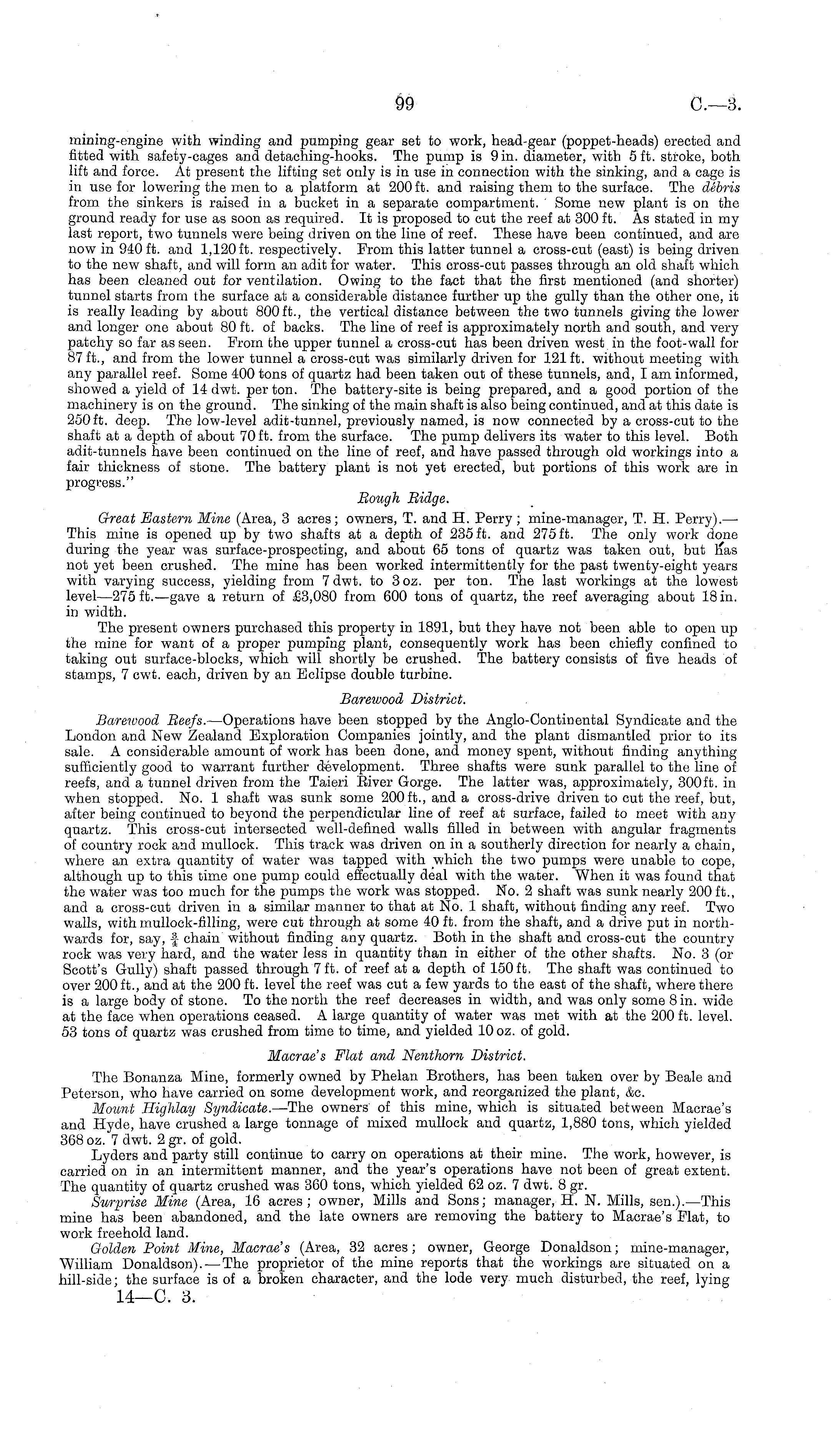 mining-engine with winding and pumping gear set to work, head-gear (poppet-heads) erected and fitted with safety-cages and detaching-hooks. The pump is 9 in. diameter, with 5 ft. stroke, both lift and force. At present the lifting set only is in use in connection with the sinking, and a cage is in use for lowering the men to a platform at 200 ft. and raising them to the surface. The debris from the sinkers is raised in a bucket in a separate compartment. Some new plant is on the ground ready for use as soon as required. It is proposed to cut the reef at 300 ft. As stated in my last report, two tunnels were being driven on the line of reef. These have been continued, and are now in 940 ft. and 1,120 ft. respectively. From this latter tunnel a cross-cut (east) is being driven to the new shaft, and will form an adit for water. This cross-cut passes through an old shaft which has been cleaned out for ventilation. Owing to the fact that the first mentioned (and shorter) tunnel starts from the surface at a considerable distance further up the gully than the other one, it is really leading by about 800 ft., the vertical distance between the two tunnels giving the lower and longer one about 80 ft. of backs. The line of reef is approximately north and south, and very patchy so far as seen. Prom the upper tunnel a cross-cut has been driven west in the foot-wall for 87 ft., and from the lower tunnel a cross-cut was similarly driven for 121 ft. without meeting with any parallel reef. Some 400 tons of quartz had been taken out of these tunnels, and, lam informed, showed a yield of 14 dwt. per ton. The battery-site is being prepared, and a good portion of the machinery is on the ground. The sinking of the main shaft is also being continued, and at this date is 250 ft. deep. The low-level adit-tunnel, previously named, is now connected by a cross-cut to the shaft at a depth of about 70 ft. from the surface. The pump delivers its water to this level. Both adit-tunnels have been continued on the line of reef, and have passed through old workings into a fair thickness of stone. The battery plant is not yet erected, but portions of this work are in progress." Bough Ridge. Great Eastern Mine (Area, 3 acres; owners, T. and H. Perry ; mine-manager, T. H. Perry). —■ This mine is opened up by two shafts at a depth of 235 ft. and 275 ft. The only work done during the year was surface-prospecting, and about 65 tons of quartz was taken out, but has not yet been crushed. The mine has been worked intermittently for the past twenty-eight years with varying success, yielding from 7 dwt. to 3 oz. per ton. The last workings at the lowest level—27s ft.—gave a return of £3,080 from 600 tons of quartz, the reef averaging about 18 in. in width. The present owners purchased this property in 1891, but they have not been able to open up the mine for want of a proper pumping plant, consequently work has been chiefly confined to taking out surface-blocks, which will shortly be crushed. The battery consists of five heads of stamps, 7 cwt. each, driven by an Eclipse double turbine. Bareivood District. Bareioood Beefs. —Operations have been stopped by the Anglo-Continental Syndicate and the London and New Zealand Exploration Companies jointly, and the plant dismantled prior to its sale. A considerable amount of work has been done, and money spent, without finding anything sufficiently good to warrant further development. Three shafts were sunk parallel to the line of reefs, and a tunnel driven from the Taieri Biver Gorge. The latter was, approximately, 300 ft. in when stopped. No. 1 shaft was sunk some 200 ft., and a cross-drive driven to cut the reef, but, after being continued to beyond the perpendicular line of reef at surface, failed to meet with any quartz. This cross-cut intersected well-defined walls filled in between with angular fragments of country rock and mullock. This track was driven on in a southerly direction for nearly a chain, where an extra quantity of water was tapped with which the two pumps were unable to cope, although up to this time one pump could effectually deal with the wacer. When it was found that the water was too much for the pumps the work was stopped. No. 2 shaft was sunk nearly 200 ft., and a cross-cut driven in a similar manner to that at No. 1 shaft, without finding any reef. Two walls, with mullock-filling, were cut through at some 40 ft. from the shaft, and a drive put in northwards for, say, f chain without finding any quartz. Both in the shaft and cross-cut the country rock was very hard, and the water less in quantity than in either of the other shafts. No. 3 (or Scott's Gully) shaft passed through 7 ft. of reef at a depth of 150 ft. The shaft was continued to over 200 ft., and at the 200 ft. level the reef was cut a few yards to the east of the shaft, where there is a large body of stone. To the north the reef decreases in width, and was only some 8 in. wide at the face when operations ceased. A large quantity of water was met with at the 200 ft. level. 53 tons of quartz was crushed from time to time, and yielded 10 oz. of gold. Macrae's Flat and Nenthorn District. The Bonanza Mine, formerly owned by Phelan Brothers, has been taken over by Beale and Peterson, who have carried on some development work, and reorganized the plant, &c. Mount Highlay Syndicate. —The owners of this mine, which is situated between Macrae's and Hyde, have crushed a large tonnage of mixed mullock and quartz, 1,880 tons, which yielded 368 oz. 7 dwt. 2 gr. of gold. Lyders and party still continue to carry on operations at their mine. The work, however, is carried on in an intermittent manner, and the year's operations have not been of great extent. The quantity of quartz crushed was 360 tons, which yielded 62 oz. 7 dwt. 8 gr. Surprise Mine (Area, 16 acres; owner, Mills and Sons; manager, H. N. Mills, sen.). —This mine has been abandoned, and the late owners are removing the battery to Macrae's Mat, to 