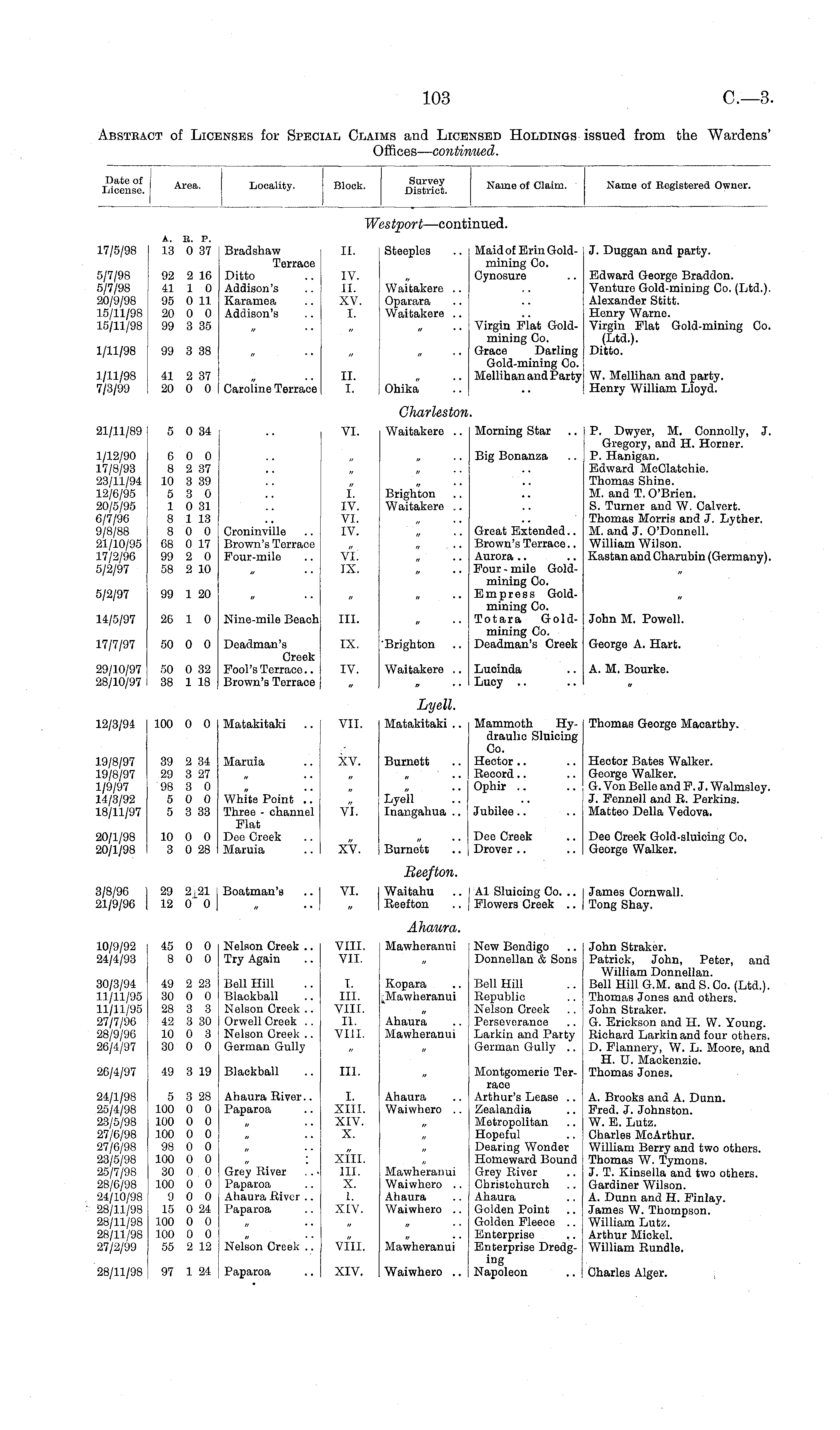 Date of License. Area. Locality. Block. Survey District. Name of Claim. Name of Registered Owner. estport —cont: inued. 17/5/98 A. B. P. 13 0 37 Bradshaw Terrace II. Steeples Maid of Erin Goldmining Co. Cynosure J. Duggan and party. 5/7/98 5/7/98 20/9/98 15/11/98 15/11/98 92 2 16 41 1 0 95 0 11 20 0 0 99 3 35 Ditto Addison's Karamea Addison's IV. II. XV. I. Waitakere .. Oparara Waitakere .. Virgin Flat Goldmining Co. Grace Darling Gold-mining Co. Mellihan and Party Edward George Braddon. Venture Gold-mining Co. (Ltd.). Alexander Stitt. Henry Warne. Virgin Flat Gold-mining Co. (Ltd.). Ditto. 1/11/98 99 3 38 1/11/98 7/3/99 41 2 37 20 0 0 Caroline Terrace II. I. Ohika W. Mellihan and party. Henry William Lloyd. 5 0 34 VI. Charleston Morning Star 21/11/89 1/12/90 17/8/93 23/11/94 12/6/95 20/5/95 6/7/96 9/8/88 21/10/95 17/2/96 5/2/97 6 0 0 8 2 37 10 3 39 5 3 0 1 0 31 8 1 13 8 0 0 68 0 17 99 2 0 58 2 10 I. IV. VI. IV. Waitakere .. Brighton Waitakere .. Big Bonanza P. Dwyer, M. Connolly, J. Gregory, and H. Horner. P. Hanigan. Edward MeClatchie. Thomas Shine. M. and T. O'Brien. S. Turner and W. Calvert. Thomas Morris and J. Lyther. M. and J. O'Donnell. William Wilson. Kastan and Gharubin (Germany). Croninville Brown's Terrace Four-mile Great Extended.. Brown's Terrace.. Aurora Four - mile Goldmining Co. Empress Goldmining Oo. Totara Goldmining Oo. Deadman's Creek v'i. IX. 5/2/97 99 1 20 14/5/97 26 1 0 Nine-mile Beach III. John M. Powell. 17/7/97 50 0 0 Deadman's Creek Fool's Terrace.. Brown's Terrace IX. 'Brighton George A. Hart. 29/10/97 28/10/97 50 0 32 38 1 18 IV. Waitakere .. Lueinda Lucy A. M. Bourke. 12/3/94 100 0 0 Matakitaki VII. Lyell. Matakitaki .. Mammoth Hydraulic Sluicing Co. Hector Record Ophir Thomas George Maoarthy. 19/8/97 19/8/97 1/9/97 14/3/92 18/11/97 39 2 34 29 3 27 98 3 0 5 0 0 5 3 33 Maruia XV. Burnett Hector Bates Walker. George Walker. G. Von Belle and F. J. Walmsley. J. Fennell and R. Perkins. Matteo Delia Vedova. 20/1/98 20/1/98 10 0 0 3 0 28 White Point '.' Three - channel Flat Dee Creek Maruia v'i. Lyell ' '. Inangahua .. Jubilee Dee Creek Drover Dee Creek Gold-sluicing Co. George Walker. XV. Burnett 29 2 ± 21 12 0" 0 Boatman's .. | VI. Beefton. Al Sluicing Co. .. I Flowers Creek .. | 3/8/96 21/9/96 Waitahu Reefton James Cornwall. Tong Shay. 45 0 0 8 0 0 Nelson Creek .. Try Again VIII. VII. Ahaura. New Bendigo Donnellan & Sons 10/9/92 24/4/93 Mawheranui John Straker. Patrick, John, Peter, and William Donnellan. Bell Hill G.M. and S. Co. (Ltd.). Thomas Jones and others. John Straker. G. Erickson and H. W. Young. Richard Larkin and four others. D. Flannery, W. L. Moore, and H. U. Mackenzie. Thomas Jones. 30/3/94 11/11/95 11/11/95 27/7/96 28/9/96 26/4/97 49 2 23 30 0 0 28 3 3 42 3 30 10 0 3 30 0 0 Bell Hill Blackball Nelson Creek .. Orwell Creek .. Nelson Greek .. German Gully I. III. VIII. II. VIII. Kopara Ahaura Mawheranui Bell Hill Republic Nelson Greek Perseverance Larkin and Party German Gully .. 26/4/97 49 3 19 Blackball III. Montgomerie Terrace Arthur's Lease .. Zealandia Metropolitan Hopeful Dearing Wonder Homeward Bound Grey River Christchurch Ahaura Golden Point Goldon Fleece .. Enterprise ,. Enterprise Dredging Napoleon 24/1/98 25/4/98 23/5/98 27/6/98 27/6/98 23/5/98 25/7/98 28/6/98 24/10/98 28/11/98 28/11/98 28/11/98 27/2/99 5 3 28 100 0 0 100 0 0 100 0 0 98 0 0 100 0 0 30 0 0 100 0 0 9 0 0 15 0 24 100 0 0 100 0 0 55 2 12 Ahaura River.. Paparoa I. XIII. XIV. X. Ahaura Waiwhero .. A. Brooks and A. Dunn. Fred. J. Johnston. W. E. Lutz. Charles McArthur. William Berry and two others. Thomas W. Tymons. J. T. Kinsella and two others. Gardiner Wilson. A. Dunn and H. Finlay. James W. Thompson. William Lutz. Arthur Mickel. William Bundle. Grey River Paparoa Ahaura River .. Paparoa XIII. III. X. 1. XIV. Mawheranui Waiwhero .. Ahaura Waiwhero .. Nelson Creek .. VIII. Mawheranui 28/11/98 97 1 24 Paparoa XIV. Waiwhero .. Charles Alger.