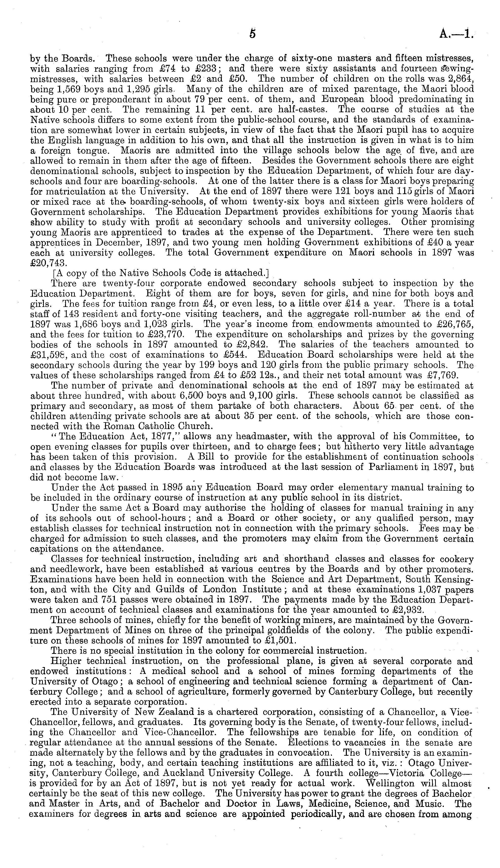 by the Boards. These schools were under the charge of sixty-one masters and fifteen mistresses, with salaries ranging from £74 to £233; and there were sixty assistants and fourteen sewingmistresses, with salaries between £2 and £50. The number of children on the rolls was 2,864, being 1,569 boys and 1,295 girls. Many of the children are of mixed parentage, the Maori blood being pure or preponderant in about 79 per cent, of them, and European blood predominating in about 10 per cent. The remaining 11 per cent, are half-castes. The course of studies at the Native schools differs to some extent from the public-school course, and the standards of examination are somewhat lower in certain subjects, in view of the fact that the Maori pupil has to acquire the English language in addition to his own, and that all the instruction is given in what is to him a foreign tongue. Maoris are admitted into the village schools below the age of five, and are allowed to remain in them after the age of fifteen. Besides the Government schools there are eight denominational schools, subject to inspection by the Education Department, of which four are dayschools and four are boarding-schools. At one of the latter there is a class for Maori boys preparing for matriculation at the University. At the end of 1897 there were 121 boys and 115 girls of Maori or mixed race at the- boarding-schools, of whom twenty-six boys and sixteen girls were holders of Government scholarships. The Education Department provides exhibitions for young Maoris that show ability to study with profit at secondary schools and university colleges. Other promising young Maoris are apprenticed to trades at the expense of the Department. There were ten such apprentices in December, 1897, and two young men holding Government exhibitions of £40 a year each at university colleges. The total Government expenditure on Maori schools in 1897 was £20,743. [A copy of the Native Schools Code is attached.] There are twenty-four corporate endowed secondary schools subject to inspection by the Education Department. Eight of them are for boys, seven for girls, and nine for both boys and girls. The fees for tuition range from £4, or even less, to a little over £14 a year. There is a total staff of 143 resident and forty-one visiting teachers, and the aggregate roll-number at the end of 1897 was 1,686 boys and 1,023 girls. The year's income from, endowments amounted to £26,765, and the fees for tuition to £23,770. The expenditure on scholarships and prizes by the governing bodies of the schools in 1897 amounted to £2,842. The salaries of the teachers amounted to £31,596, and the cost of examinations to £544. Education Board scholarships were held at the secondary schools during the year by 199 boys and 120 girls from the public primary schools. The values of these scholarships ranged from £4 to £52 125., and their net total amount was £7,769. The number of private and denominational schools at the end of 1897 may be estimated at about three hundred, with about 6,500 boys and 9,100 girls. These schools cannot be classified as primary and secondary, as most of them partake of both characters. About 65 per cent, of the children attending private schools are at about 35 per cent, of the schools, which are those connected with the Roman Catholic Church. " The Education Act, 1877," allows any headmaster, with the approval of his Committee, to open evening classes for pupils over thirteen, and to charge fees; but hitherto very little advantage has been taken of this provision. A Bill to provide for the establishment of continuation schools and classes by the Education Boards was introduced at the last session of Parliament in 1897, but did not become law. Under the Act passed in 1895 any Education Board may order elementary manual training to be included in the ordinary course of instruction at any public school in its district. Under the same Act a Board may authorise the holding of classes for manual training in any of its schools out of school-hours ; and a Board or other society, or any qualified person, may establish classes for technical instruction not in connection with the primary schools. Fees may be charged for admission to such classes, and the promoters may claim from the Government certain capitations on the attendance. Classes for technical instruction, including art and shorthand classes and classes for cookery and needlework, have been established at various centres by the Boards and by other promoters. Examinations have been held in connection with the Science and Art Department, South Kensington, and with the City and Guilds of London Institute ; and at these examinations 1,037 papers were taken and 751 passes were obtained in 1897. The payments made by the Education Department on account of technical classes and examinations for the year amounted to £2,932. Three schools of mines, chiefly for the benefit of working miners, are maintained by the Government Department of Mines on three of the principal goldfields of the colony. The public expenditure on these schools of mines for 1897 amounted to £1,501. There is no special institution in the colony for commercial instruction. Higher technical instruction, on the professional plane, is given at several corporate and endowed institutions : A medical school and a school of mines forming departments of the University of Otago; a school of engineering and technical science forming a department of Canterbury College; and a school of agriculture, formerly governed by Canterbury College, but recently erected into a separate corporation. The University of New Zealand is a chartered corporation, consisting of a Chancellor, a ViceChancellor, fellows, and graduates. Its governing body is the Senate, of twenty-four fellows, including the Chancellor and Vice-Chancellor. The fellowships are tenable for life, on condition of regular attendance at the annual sessions of the Senate. Elections to va