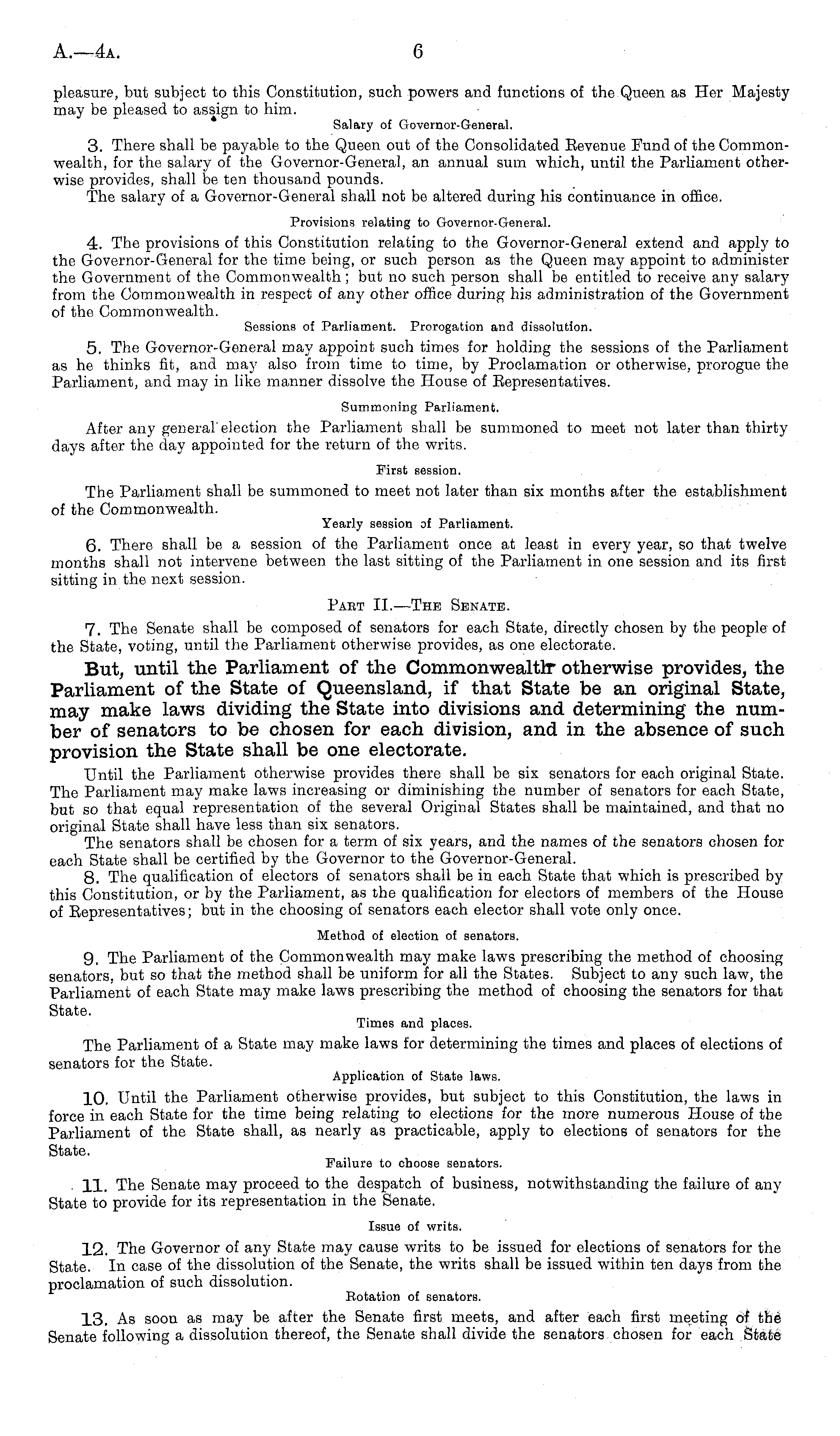 pleasure, but subject to this Constitution, such powers and functions of the Queen as Her Majesty may be pleased to assign to him. Salary of Governor-General. 3. There shall be payable to the Queen out of the Consolidated Eevenue Fund of the Commonwealth, for the salary of the Governor-General, an annual sum which, until the Parliament otherwise provides, shall be ten thousand pounds. The salary of a Governor-General shall not be altered during his continuance in office. Provisions relating to Governor-General. 4. The provisions of this Constitution relating to the Governor-General extend and apply to the Governor-General for the time being, or such person as the Queen may appoint to administer the Government of the Commonwealth; but no such person shall be entitled to receive any salary from the Commonwealth in respect of any other office during his administration of the Government of the Commonwealth. Sessions of Parliament. Prorogation and dissolution. 5. The Governor-General may appoint such times for holding the sessions of the Parliament as he thinks fit, and may also from time to time, by Proclamation or otherwise, prorogue the Parliament, and may in like manner dissolve the House of Eepresentatives. Summoning Parliament. After any general'election the Parliament shall be summoned to meet not later than thirty days after the day appointed for the return of the writs. First session. The Parliament shall be summoned to meet not later than six months after the establishment of the Commonwealth. Yearly session of Parliament. 6. There shall be a session of the Parliament once at least in every year, so that twelve months shall not intervene between the last sitting of the Parliament in one session and its first sitting in the next session. Part ll.—The Senate. 7. The Senate shall be composed of senators for each State, directly chosen by the people of the State, voting, until the Parliament otherwise provides, as one electorate. But, until the Parliament of the Commonwealth* otherwise provides, the Parliament of the State of Queensland, if that State be an original State, may make laws dividing the State into divisions and determining the number of senators to be chosen for each division, and in the absence of such provision the State shall be one electorate. Until the Parliament otherwise provides there shall be six senators for each original State. The Parliament may make laws increasing or diminishing the number of senators for each State, but so that equal representation of the several Original States shall be maintained, and that no original State shall have less than six senators. The senators shall be chosen for a term of six years, and the names of the senators chosen for each State shall be certified by the Governor to the Governor-General. 8. The qualification of electors of senators shall be in each State that which is prescribed by this Constitution, or by the Parliament, as the qualification for electors of members of the House of Eepresentatives; but in the choosing of senators each elector shall vote only once. Method of election of senators. 9. The Parliament of the Commonwealth may make laws prescribing the method of choosing senators, but so that the method shall be uniform for all the States. Subject to any such law, the Parliament of each State may make laws prescribing the method of choosing the senators for that State. Times and places. The Parliament of a State may make laws for determining the times and places of elections of senators for the State. Application of State laws. 10. Until the Parliament otherwise provides, but subject to this Constitution, the laws in force in each State for the time being relating to elections for the more numerous House of the Parliament of the State shall, as nearly as practicable, apply to elections of senators for the State. Failure to choose senators. . 11. The Senate may proceed to the despatch of business, notwithstanding the failure of any State to provide for its representation in the Senate. Issue of writs. 12. The Governor of any State may cause writs to be issued for elections of senators for the State. In case of the dissolution of the Senate, the writs shall be issued within ten days from the proclamation of such dissolution. Rotation of senators. 13, As soon as may be after the Senate first meets, and after each first meeting of the Senate following a dissolution thereof, the Senate shall divide the senators chosen for each State