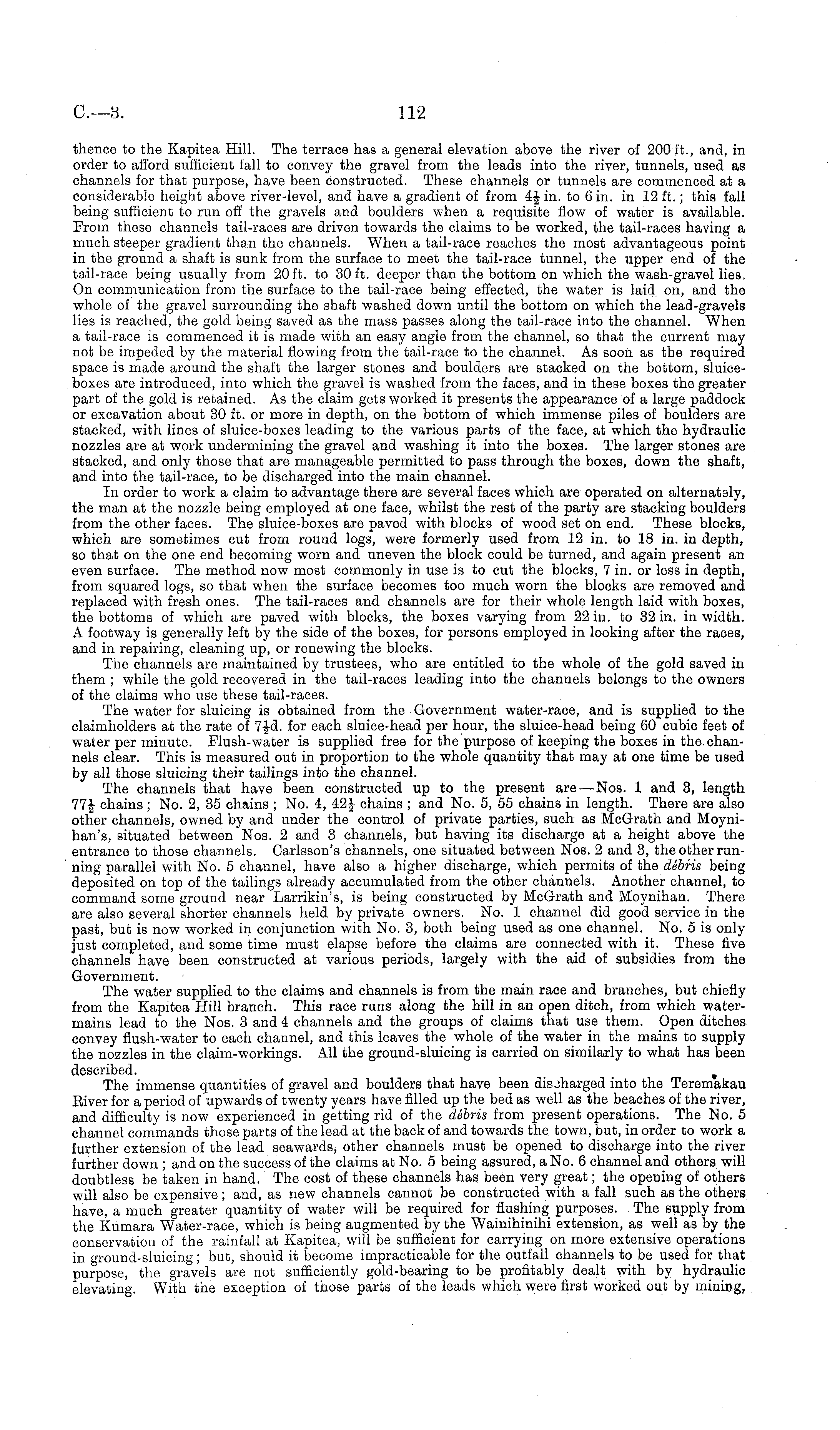 thence to the Kapitea Hill. The terrace has a general elevation above the river of 200 ft., and, in order to afford sufficient fall to convey the gravel from the leads into the river, tunnels, used as channels for that purpose, have been constructed. These channels or tunnels are commenced at a considerable height above river-level, and have a gradient of from in. to 6 in. in 12 ft.; this fall being sufficient to run off the gravels and boulders when a requisite flow of water is available. From these channels tail-races are driven towards the claims to be worked, the tail-races having a much steeper gradient tha:n the channels. When a tail-race reaches the most advantageous point in the ground a shaft is sunk from the surface to meet the tail-race tunnel, the upper end of the tail-race being usually from 20 ft. to 30 ft. deeper than the bottom on which the wash-gravel lies, On communication from the surface to the tail-race being effected, the water is laid on, and the whole of the gravel surrounding the shaft washed down until the bottom on which the lead-gravels lies is reached, the gold being saved as the mass passes along the tail-race into the channel. When a tail-race is commenced it is made with an easy angle from the channel, so that the current may not be impeded by the material flowing from the tail-race to the channel. As soon as the required space is made around the shaft the larger stones and boulders are stacked on the bottom, sluiceboxes are introduced, into which the gravel is washed from the faces, and in these boxes the greater part of the gold is retained. As the claim gets worked it presents the appearance of a large paddock or excavation about 30 ft. or more in depth, on the bottom of which immense piles of boulders are stacked, with lines of sluice-boxes leading to the various parts of the face, at which the hydraulic nozzles are at work undermining the gravel and washing it into the boxes. The larger stones are stacked, and only those that are manageable permitted to pass through the boxes, down the shaft, and into the tail-race, to be discharged into the main channel. In order to work a claim to advantage there are several faces which are operated on alternately, the man at the nozzle being employed at one face, whilst the rest of the party are stacking boulders from the other faces. The sluice-boxes are paved with blocks of wood set on end. These blocks, which are sometimes cut from round logs, were formerly used from 12 in. to 18 in. in depth, so that on the one end becoming worn and uneven the block could be turned, and again present an even surface. The method now most commonly in use is to cut the blocks, 7 in. or less in depth, from squared logs, so that when the surface becomes too much worn the blocks are removed and replaced with fresh ones. The tail-races and channels are for their whole length laid with boxes, the bottoms of which are paved with blocks, the boxes varying from 22 in. to 32 in. in width. A footway is generally left by the side of the boxes, for persons employed in looking after the races, and in repairing, cleaning up, or renewing the blocks. The channels are maintained by trustees, who are entitled to the whole of the gold saved in them ; while the gold recovered in the tail-races leading into the channels belongs to the owners of the claims who use these tail-races. The water for sluicing is obtained from the Government water-race, and is supplied to the claimholders at the rate of 7-Jd. for each sluice-head per hour, the sluice-head being 60 cubic feet of water per minute. Flush-water is supplied free for the purpose of keeping the boxes in the. channels clear. This is measured out in proportion to the whole quantity that may at one time be used by all those sluicing their tailings into the channel. The channels that have been constructed up to the present are — Nos. 1 and 3, length 77J chains ; No. 2, 35 chains ; No. 4, 42f chains ; and No. 5, 55 chains in length. There are also other channels, owned by and under the control of private parties, such as McGrath and Moynihan's, situated between Nos. 2 and 3 channels, but having its discharge at a height above the entrance to those channels. Carlsson's channels, one situated between Nos. 2 and 3, the other running parallel with No. 5 channel, have also a higher discharge, which permits of the debris being deposited on top of the tailings already accumulated from the other channels. Another channel, to command some ground near Larrikin's, is being constructed by McGrath and Moynihan. There are also several shorter channels held by private owners. No. 1 channel did good service in the past, but is now worked in conjunction with No. 3, both being used as one channel. No. sis only just completed, and some time must elapse before the claims are connected with it. These five channels have been constructed at various periods, largely with the aid of subsidies from the Government. The water supplied to the claims and channels is from the main race and branches, but chiefly from the Kapitea Hill branch. This race runs along the hill in an open ditch, from which watermains lead to the Nos. 3 and 4 channels and the groups of claims that use them. Open ditches convey flush-water to each channel, and this leaves the whole of the water in the mains to supply the nozzles in the claim-workings. All the ground-sluicing is carried on similarly to what has been described. _ t The immense quantities of gravel and boulders that have been discharged into the Teremakau Eiver for a period of upwards of twenty years have filled up the bed as well as the beaches of the river, and difficulty is now experienced in getting rid of the debris from present operations. The No. 5 channel commands those parts of the lead at the back of and towards the town, but, in order to work a further extension of the lead seawards, other channels must be opened to discharge into the river further down ; and on the success of the cl